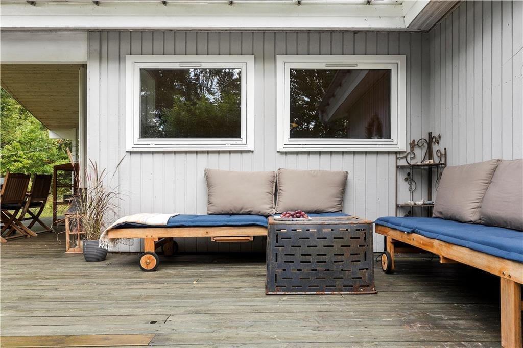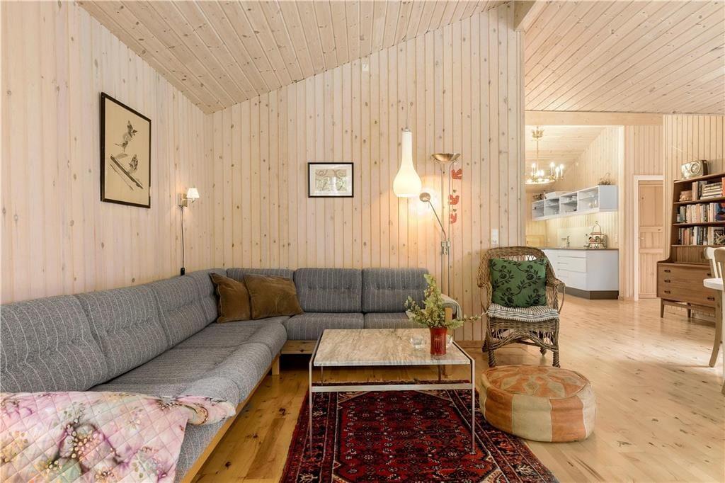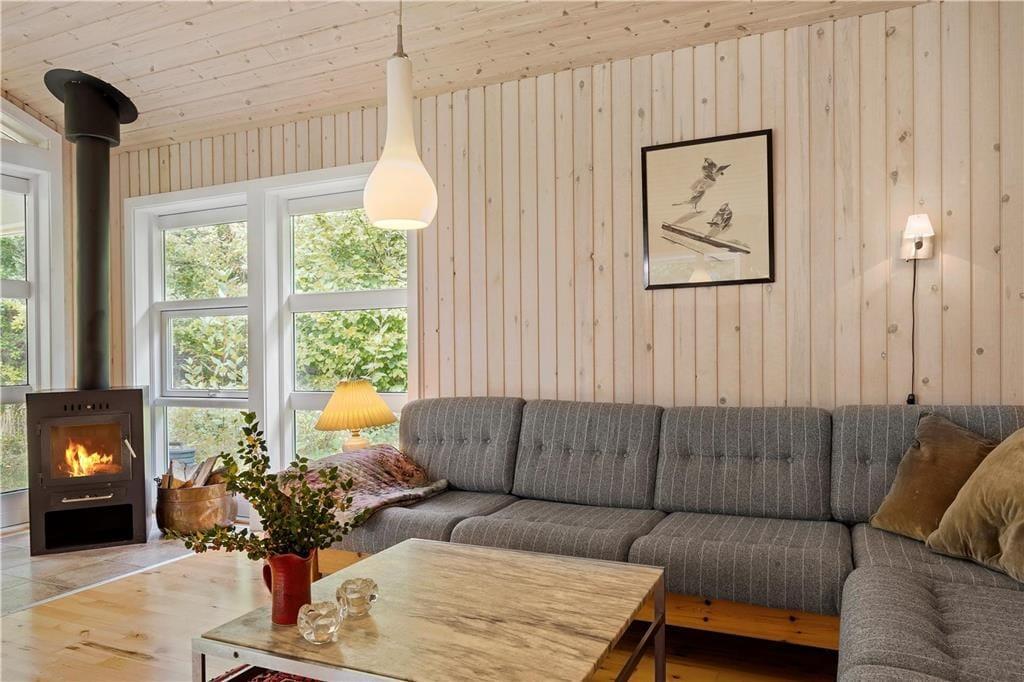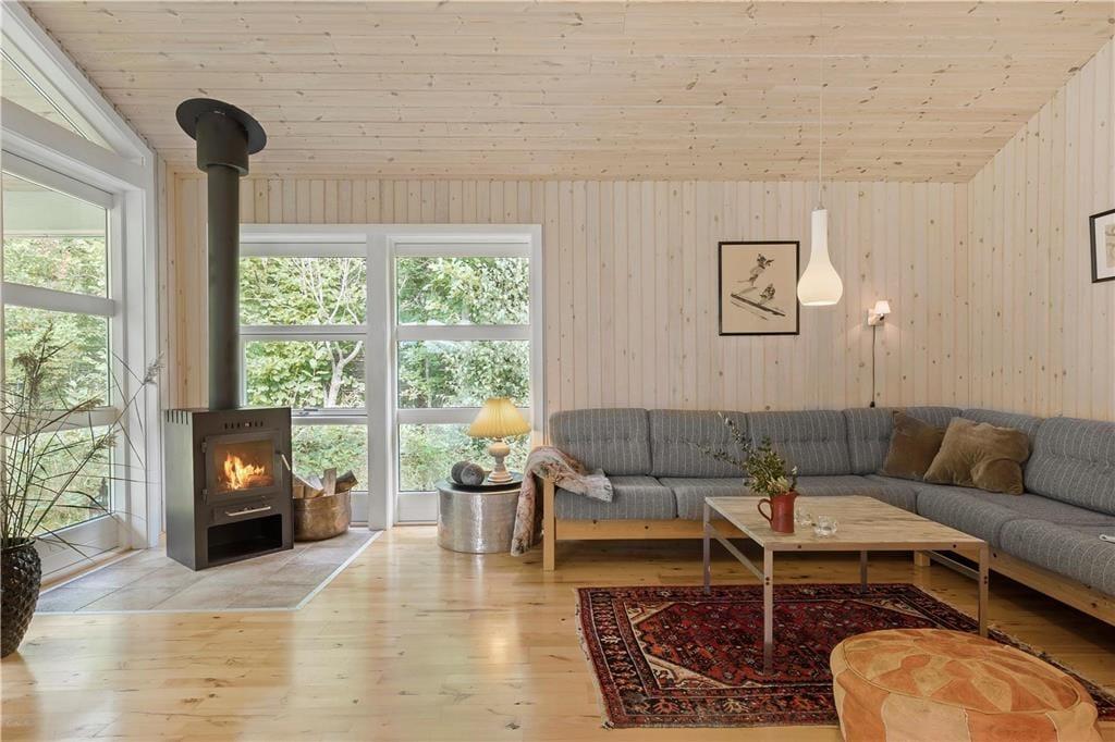 Med masser af lysindfald fra de store vinduespartier, fyrretræsgulv og lyse trævægge, føler du dig som opslugt af naturen når du sætter dig i den store hjørnesofa med plads til hele familien og kigger ud i haven. Mens varmen fra brændeovnen breder sig, og kakaoen bliver sat på bordet, nyder du den ro og fred, som findes i dette velholdte og velindrettede sommerhus - og får måske lyst til at spille et spil med familien eller bare slappe helt af og nyde stilheden.