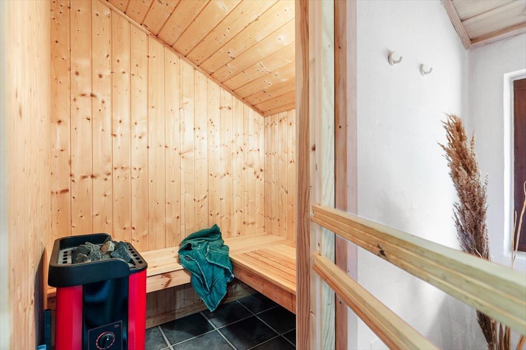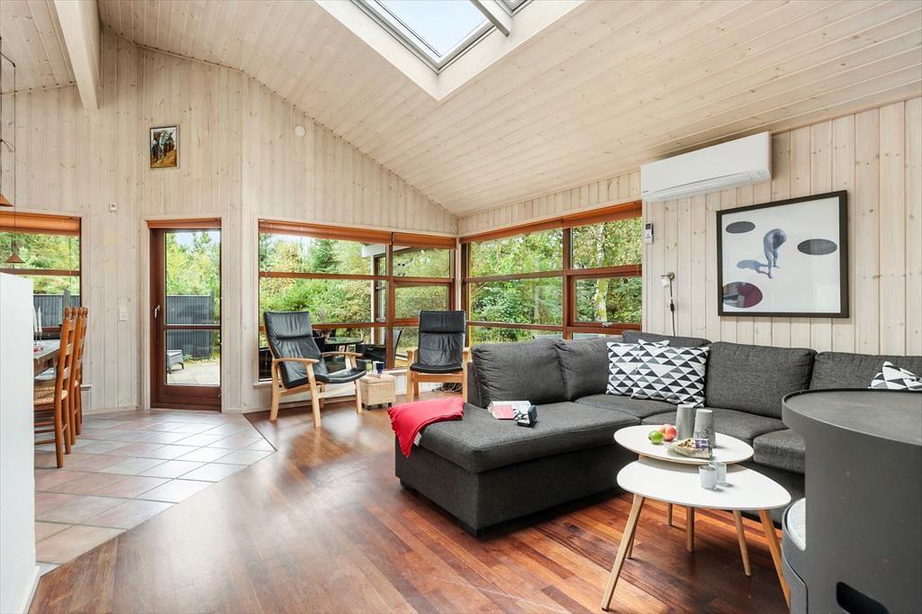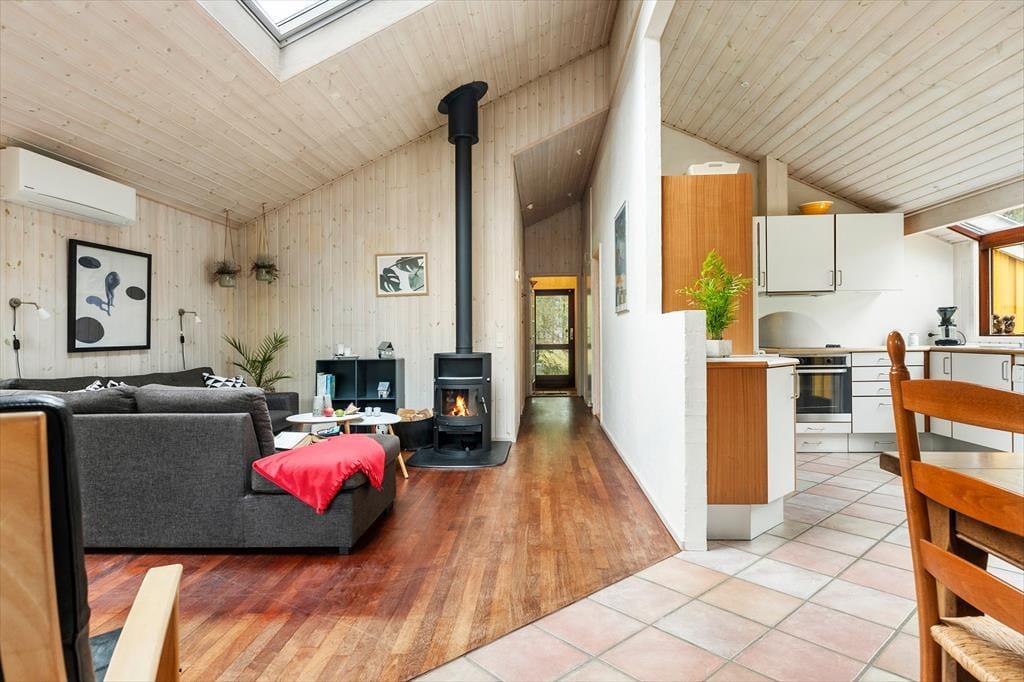 Når du træder ind i sommerhuset, mærker du straks den lette og lyse stemning, som er med til at sænke skuldrene og få dig helt ned i gear. Store vinduespartier trækker naturen ind i rummet og fylder stuen med dagslys, mens den åbne planløsning sørger for, at der er god forbindelse mellem opholdsrum og køkken. Midt i rummet står brændeovnen klar til at sprede varme og hygge – perfekt til en stille stund med kortspil eller samtaler over et glas vin. Når aftenen falder på, og kroppen har brug for lidt ekstra forkælelse, kan du sætte kurs mod husets spa og sauna – og bagefter smutte i seng i et af de tre gode soveværelser, hvor der er ro og komfort til hele familien.