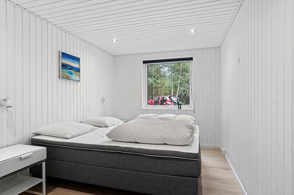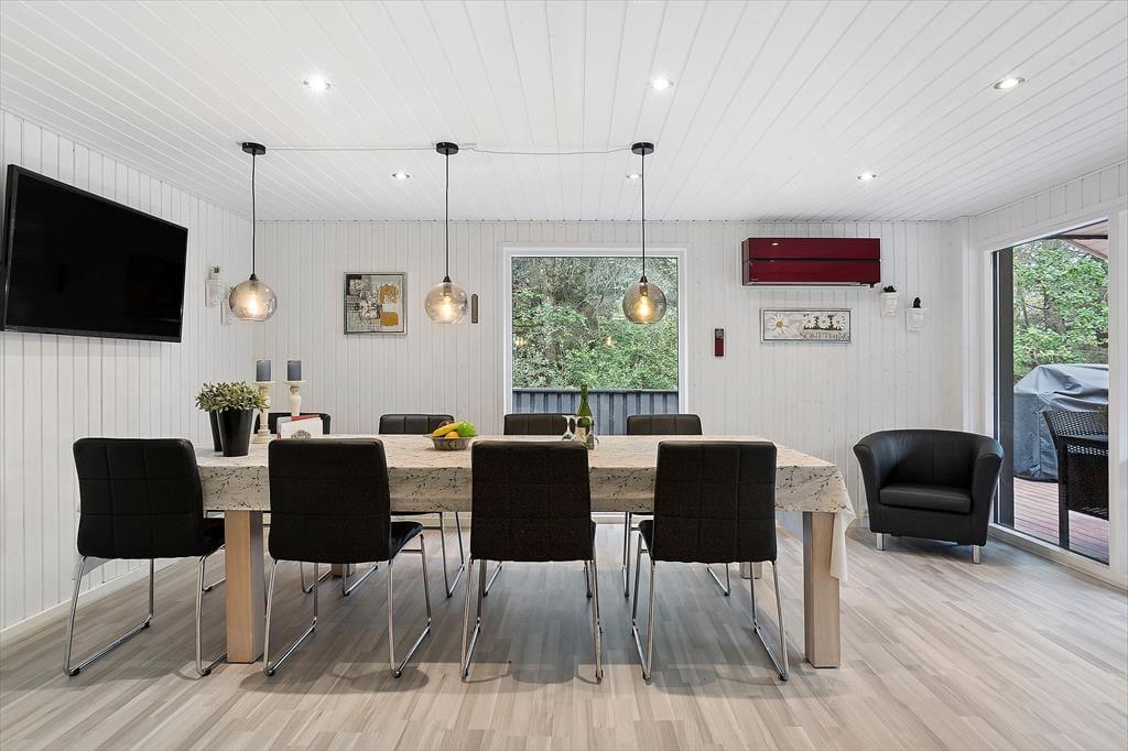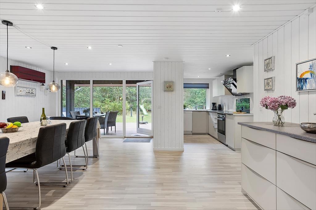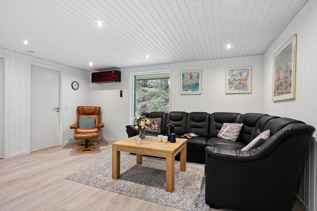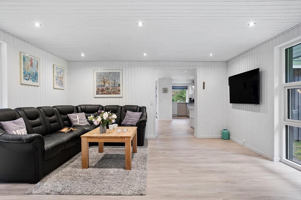 Sommerhuset byder dig velkommen med en hyggelig og hjemlig stemning, hvor du straks mærker ferierolens varme favntag. De lyse rum skaber en behagelig atmosfære, hvor familien kan samles til gode stunder – hvad enten det er til afslappet samvær eller hyggelige spilaftener. Den rummelige stue åbner op mod terrassen med store vinduer, der lukker dagslyset ind og giver en følelse af at være tæt på naturen. Køkkenet er enkelt og funktionelt, et oplagt sted til at trylle lækre feriemåltider frem. Sommerhuset er ideelt for jer, der ønsker at tage hundene med, da der er plads til to firbenede familiemedlemmer, som kan nyde den store grund og trygge omgivelser.