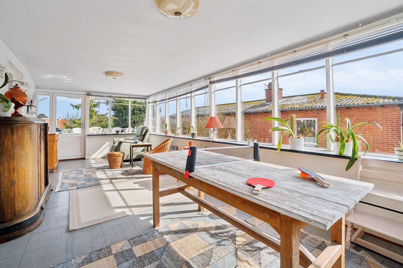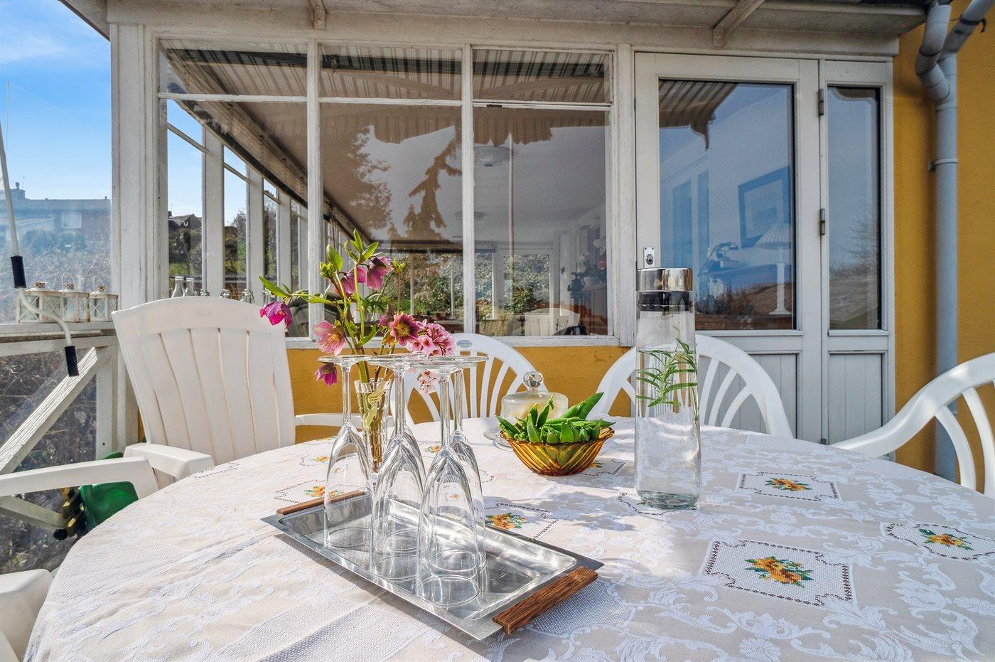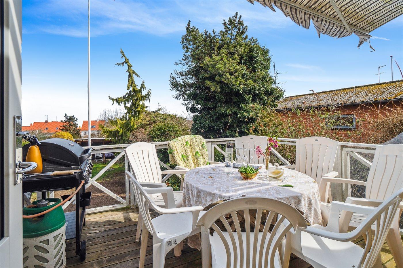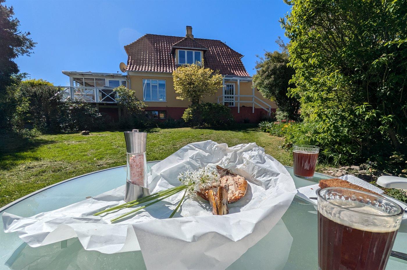 For enden af udestuen finder man en hævet træterrasse, der virkelig indbyder til frokost eller eftermiddagskaffen - derfra kan man have et øje på børnene, der leger i den fredelige have.