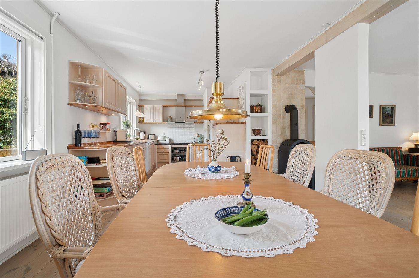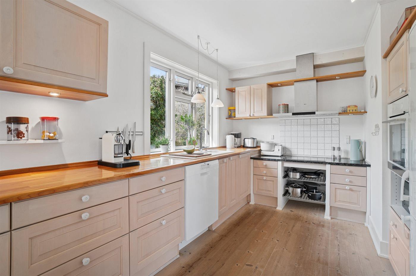 Køkkenet er udstyret med 1 køleskab. Der er 4 induktionskogeplader, varmluftovn, mikrobølgeovn samt opvaskemaskine.