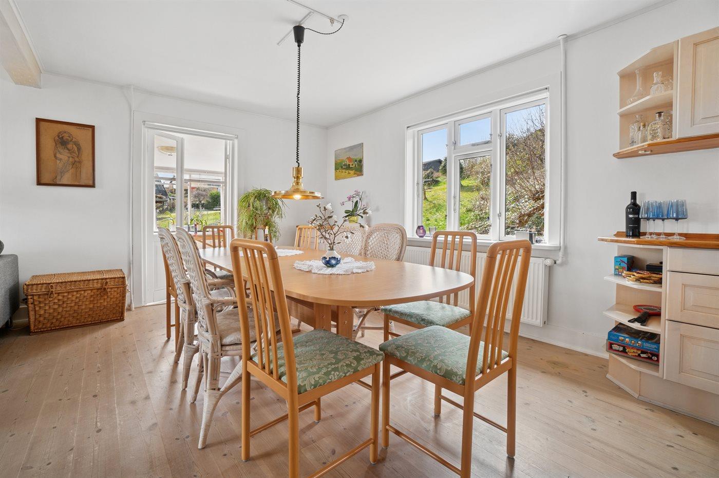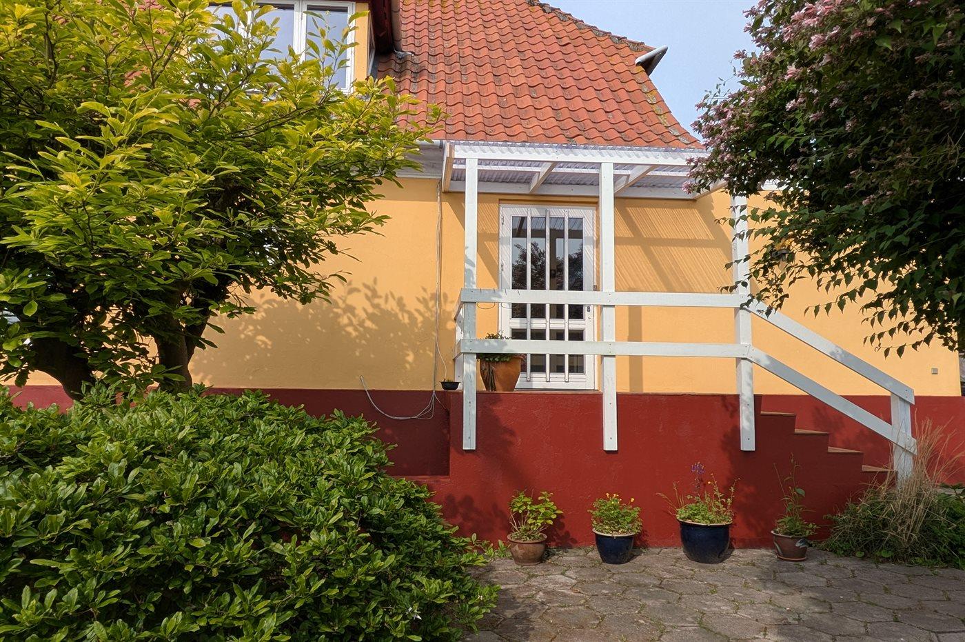 Det store feriehus ligger midt i byen - trukket lidt tilbage, så man kan finde fred og ro, når der er brug for det. I stueplan er der foruden stue og udestue også en fin køkkenafdeling, badeværelse samt gæstetoilet. Et soveværelse med elevationssenge finder man også i stueetagen. Øvrige soveværelser er på 1. sal. I det store soveværelse med den fine udsigt igennem de store vinduer i kvisten er indrettet et lille hyggehjørne - hvor man kan læse en bog eller strikke eller bare kigge ud. Vaskemaskinen er i kælderen. En trappe fører op til indgangspartiet.