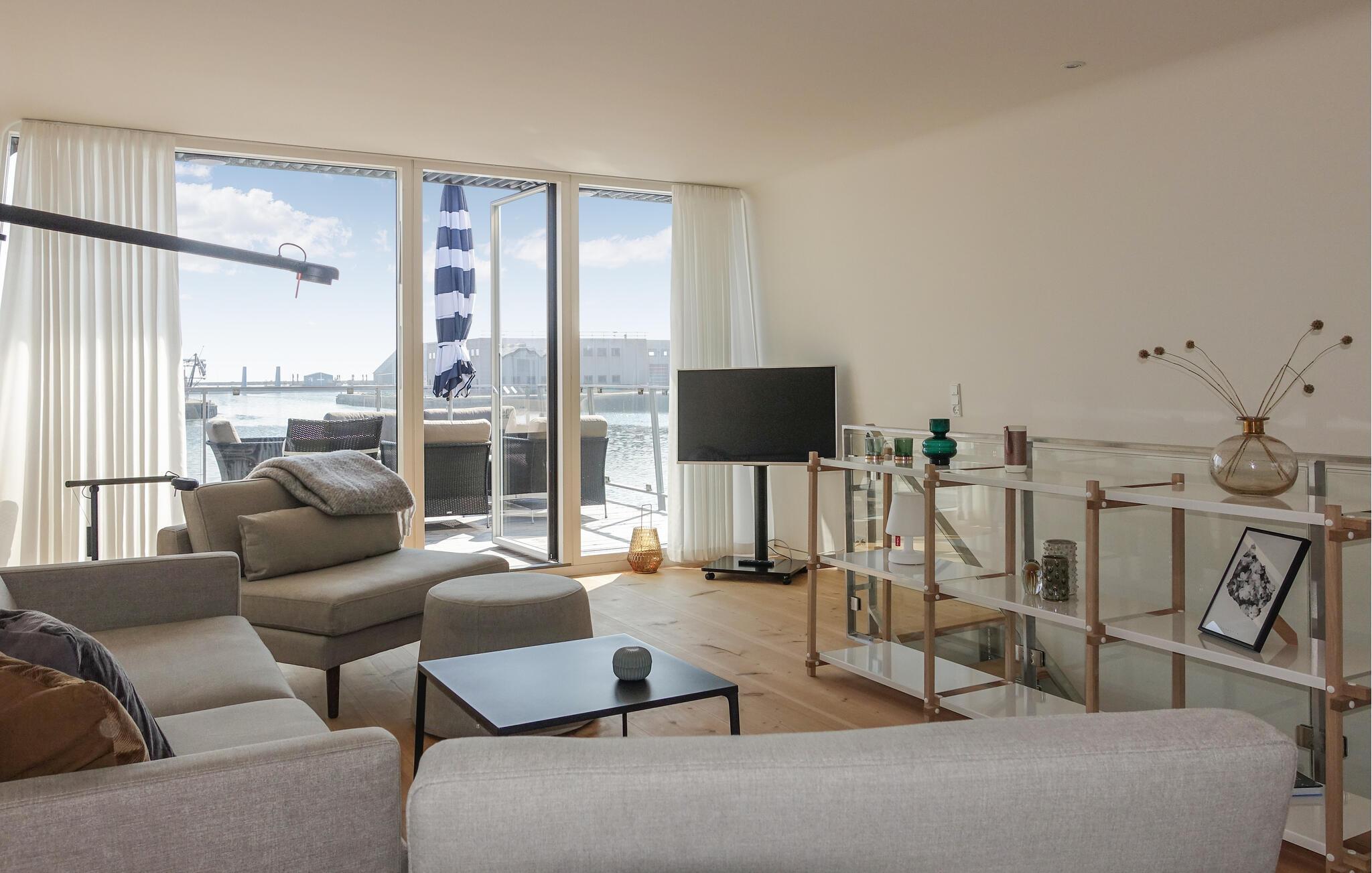 Moderne husbåd med havudsigt og stor terrasse nær Nexøs charmerende havn.