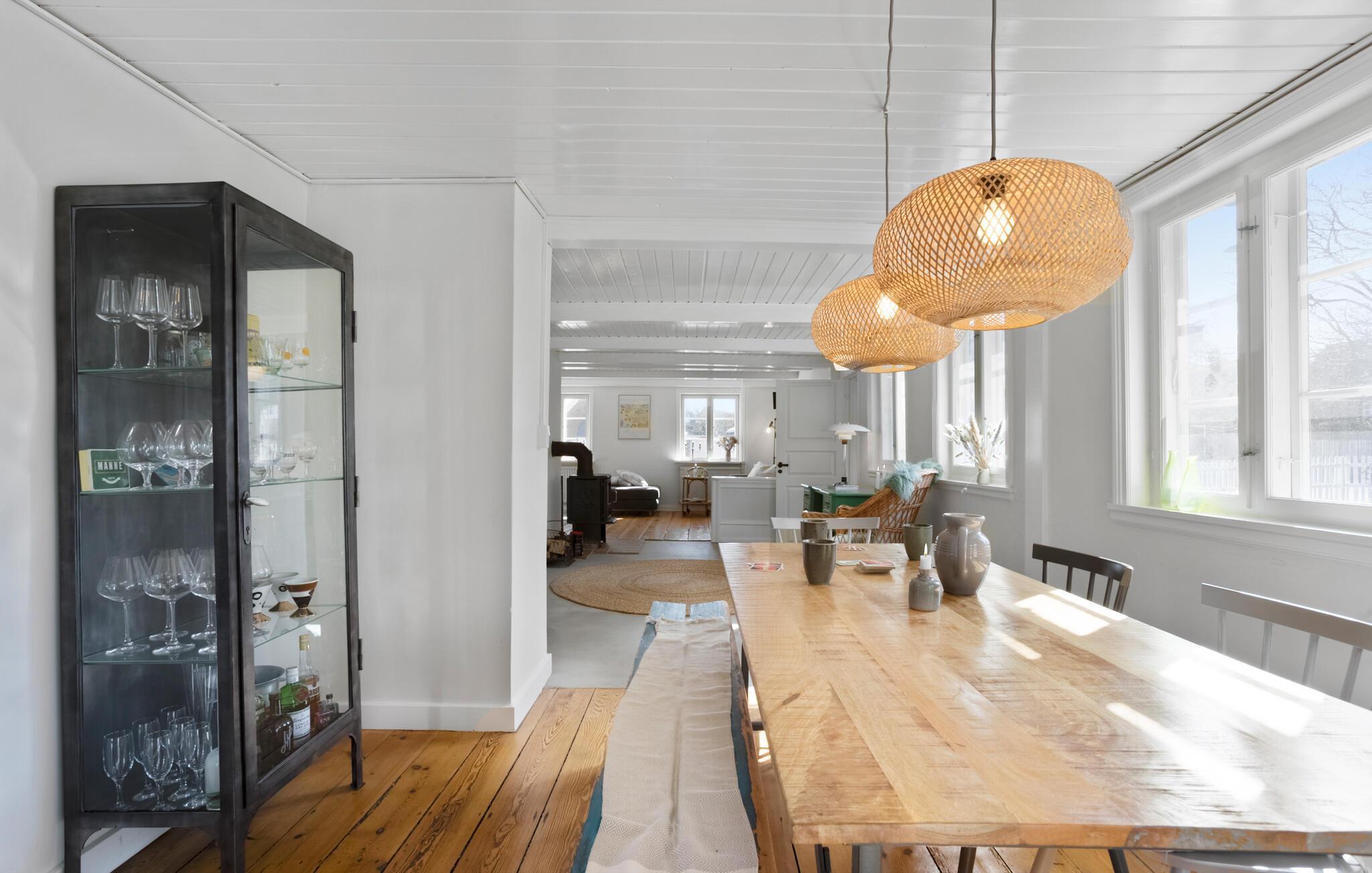 Dette feriehus byder på en charmerende blanding af tradition og personlig stil. Hyg jer i de hjemligt indrettede rum, slap af i den store sofa, fordyb jer i en god bog, eller nyd blot en stille pause. Indretningen med trægulve, lyse vægge og nøje afstemte farvedetaljer skaber en varm og personlig stemning. Spis jeres måltider ved det lange spisebord, eller nyd morgenmaden i det smukke køkken, der imponerer med mange kærlige detaljer. Også på hemsen kan man trække sig tilbage og slappe af. Eller gå op ad trappen til husets overetage, hvor I kan nyde havudsigten og lade jer fortrylle af lyset fra Østersøen.