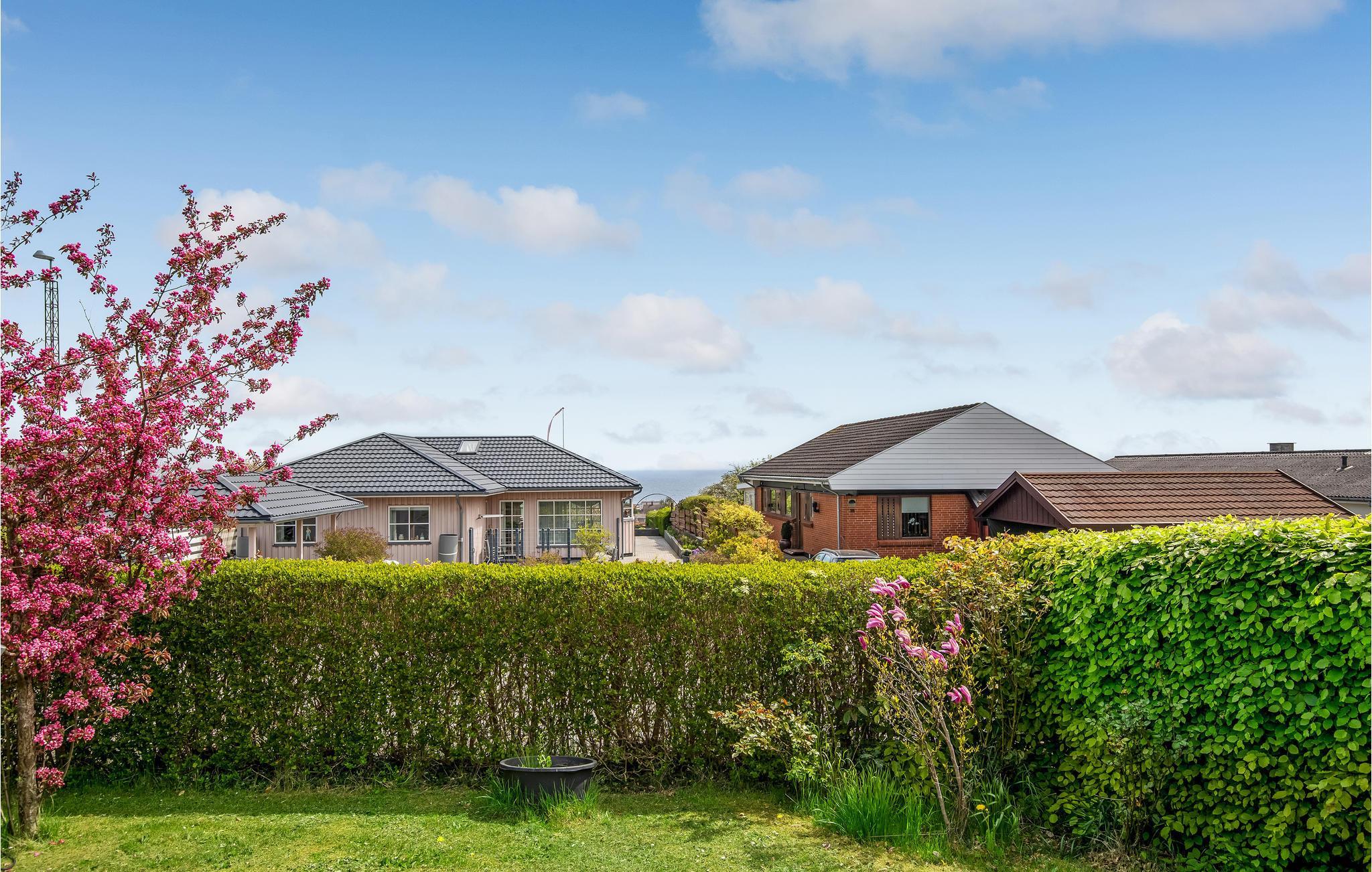 Feriehus i Årsdale med delvis havudsigt, terrasse, have og moderne faciliteter nær havn og røgeri.