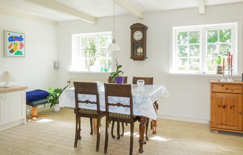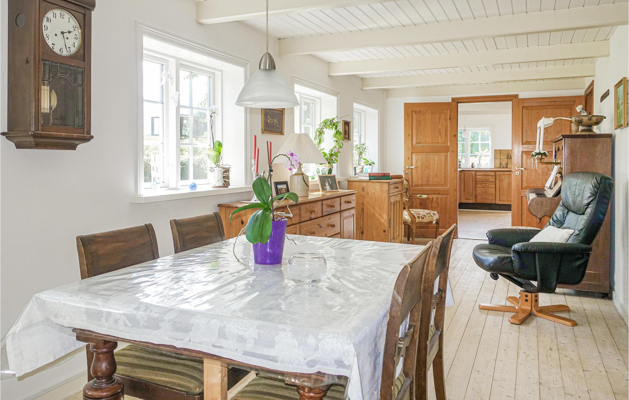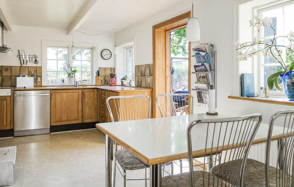 Opholdsstuen har en vam og hyggelig atmosfære med flotte elementer med klaveret og brændeovnen. I har god plads til at kokkere i køkkenet, hvor I også kan nyde dagens måltider.