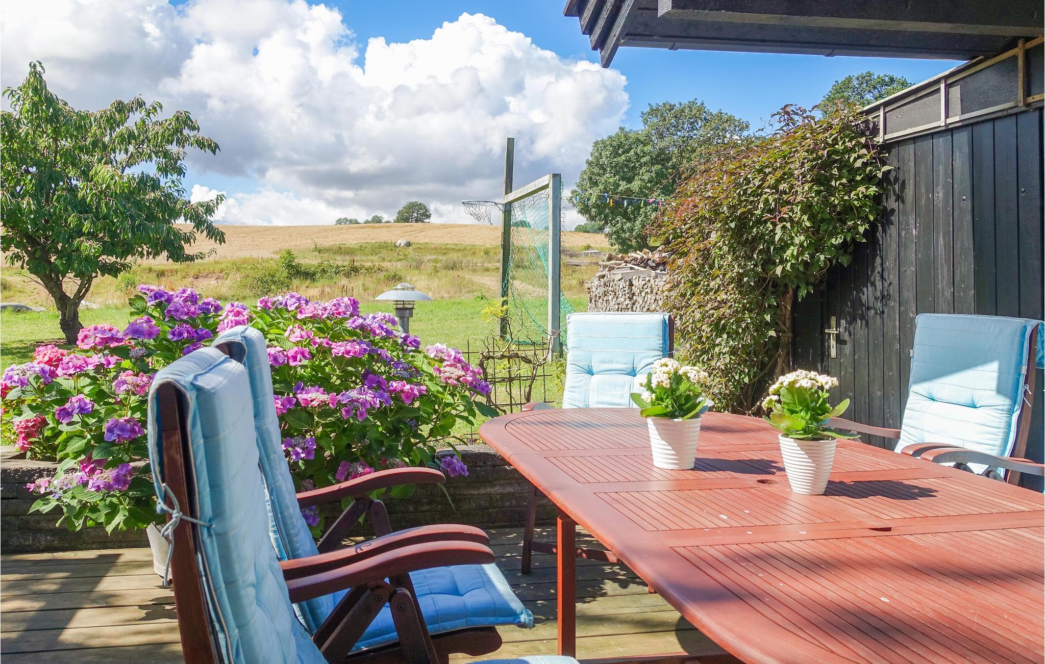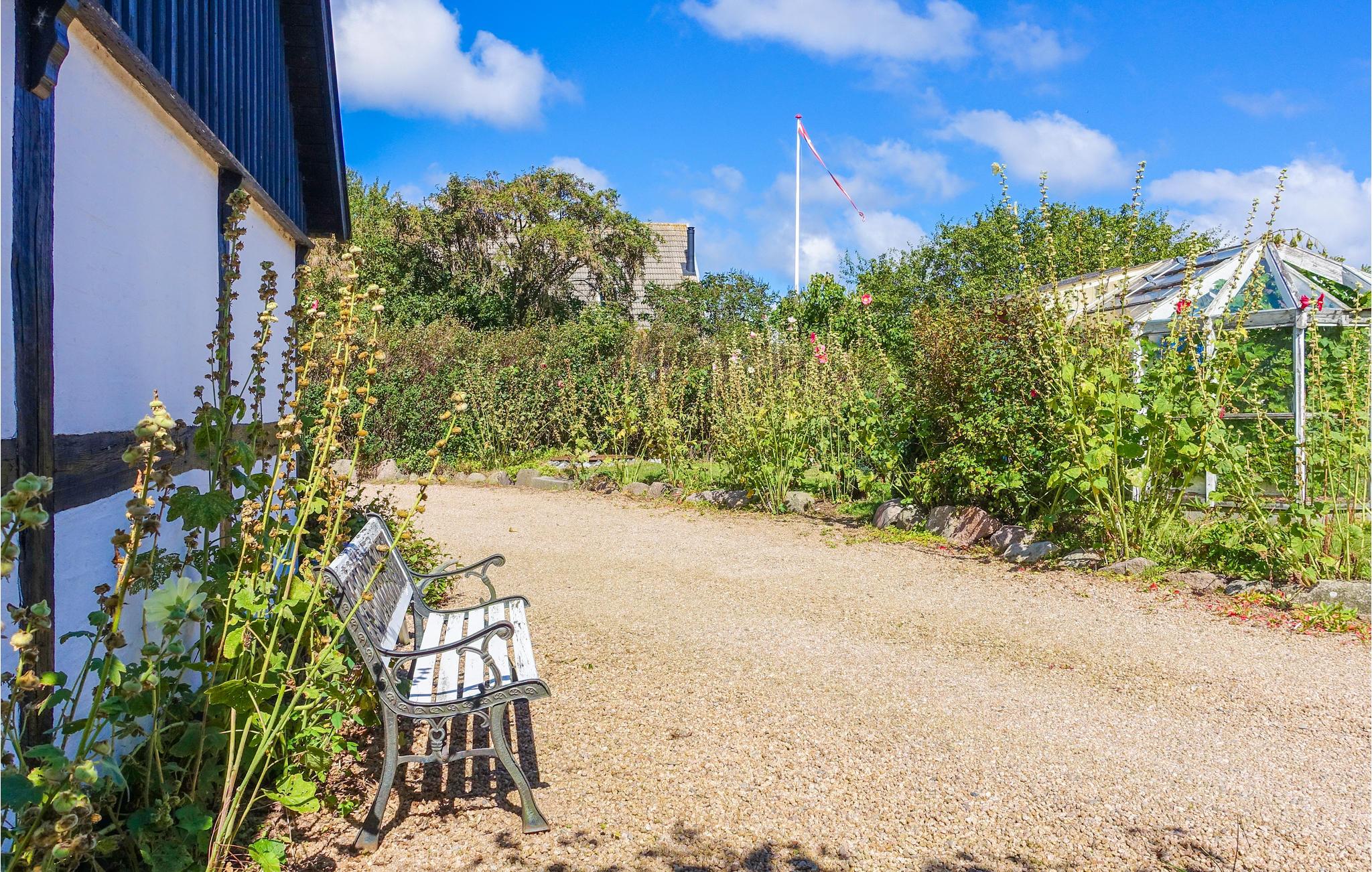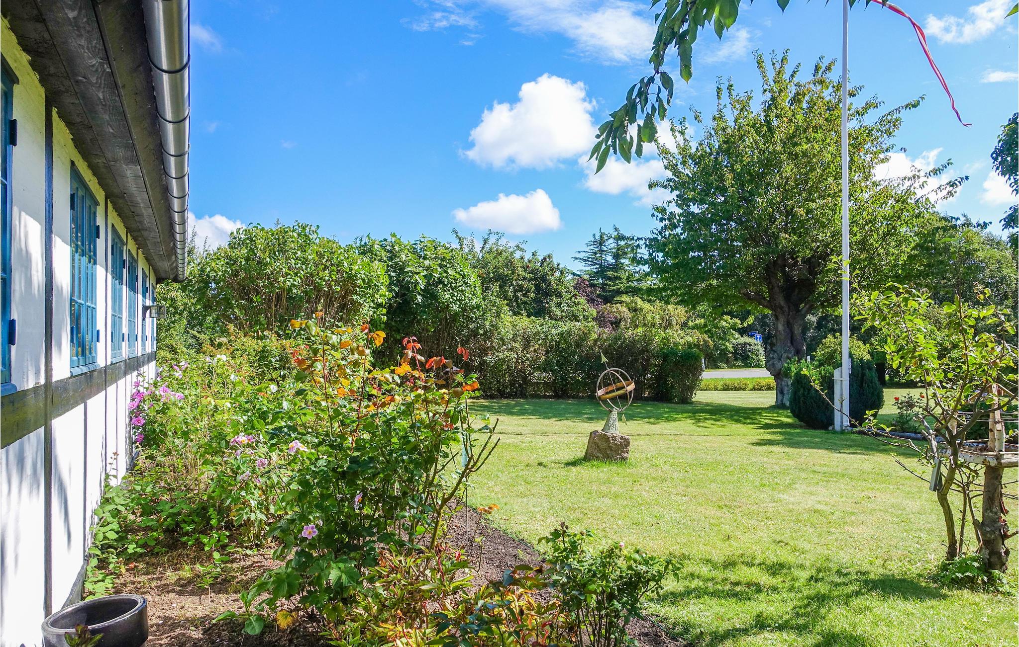 Når vejret er lunt, kan I rykke selskabet ud på den hyggelige terrasse, hvor der står havemøbler og grill. Børnene kan se frem til en fin, stor have med to fodboldmål og en sandkasse, og grunden ligger smukt placeret ud til marker og et vidunderligt kig til havet mellem træerne. Der er blot 200 meter til den nærmeste badebro, så I gå direkte ned til vandet i jeres klip-klappere.