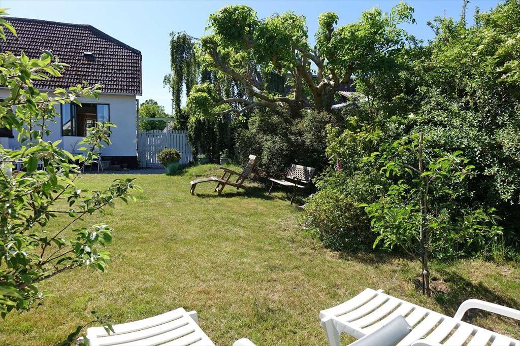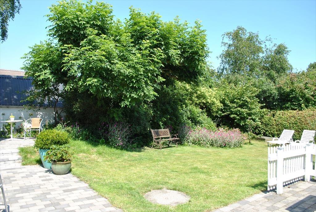 Hyggelig have, der er lukket af med hæk mod naboer og stakit mod vejen; fine muligheder for at finde sol og læ – og plads til børnenes leg.