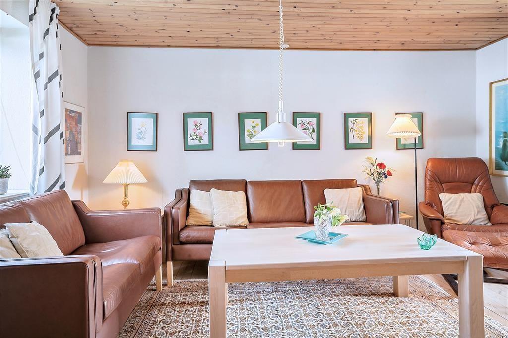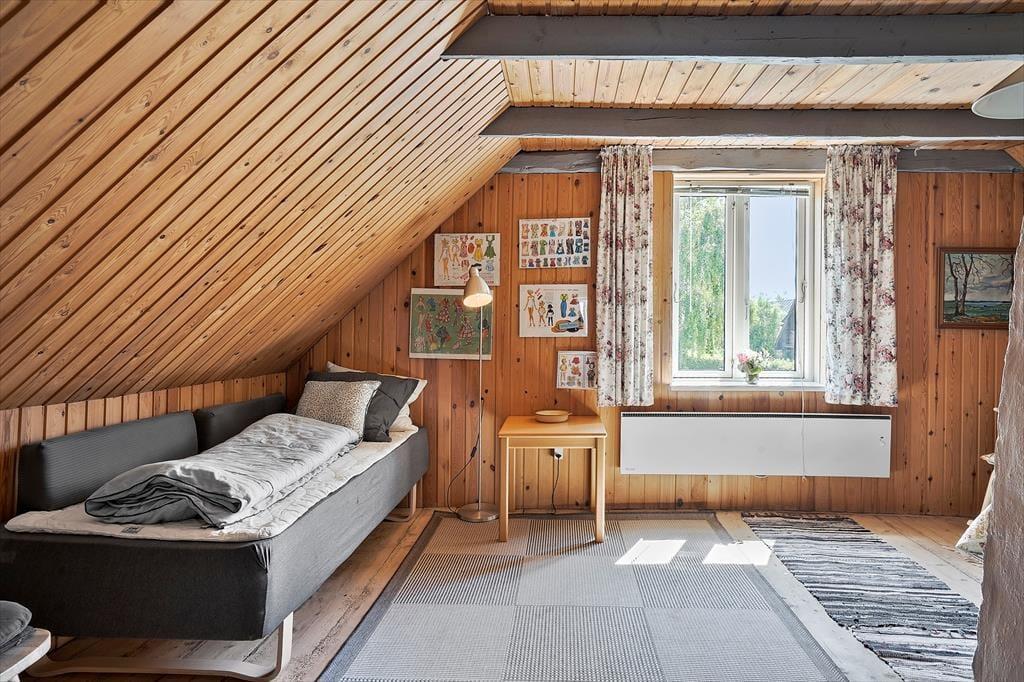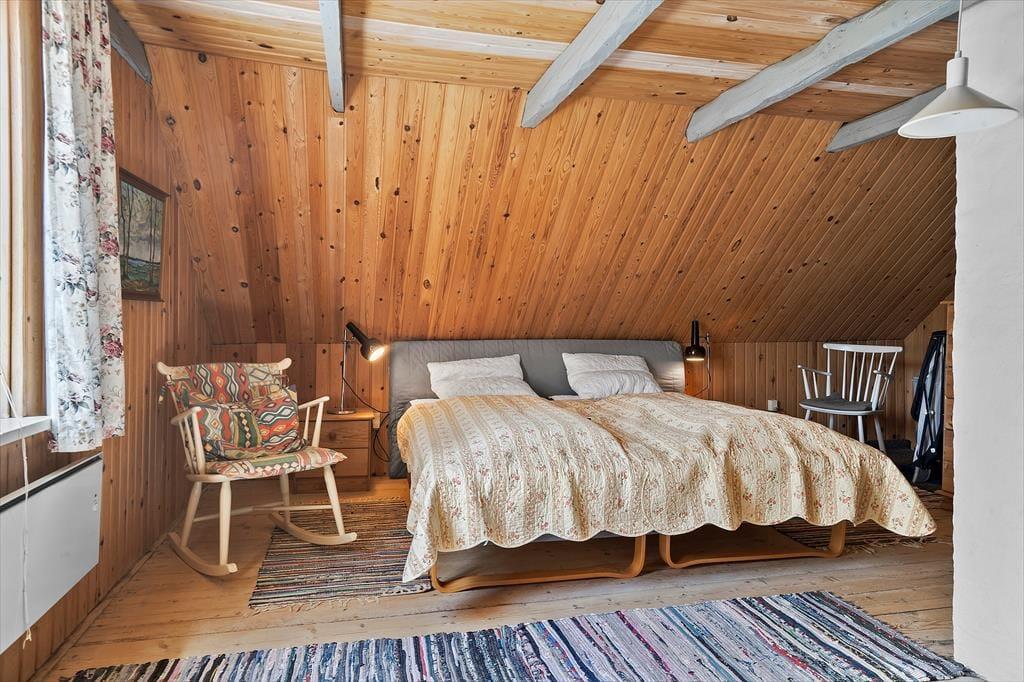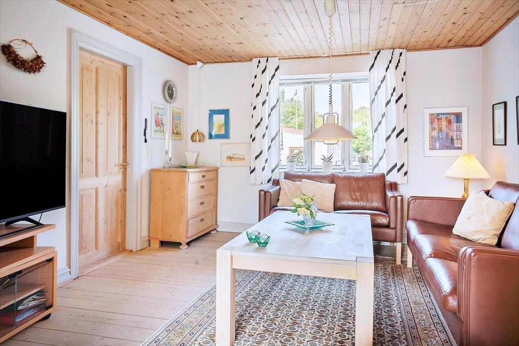 Opholdsstue med godt lys fra vest; fra stor spisestue med brændeovn er der glasdør til terrassen. Der er pænt trægulv både i stuerne og det velindrettede køkken. Lille mellemgang med vaskemaskine. På 1. sal kvistværelse med dobbeltseng samt stort værelse med dobbeltseng og sovesofa. Bad i begge plan, begge steder med brus. Elvarme, primært i form af varmepumpe (luft-til-luft) i stuen.