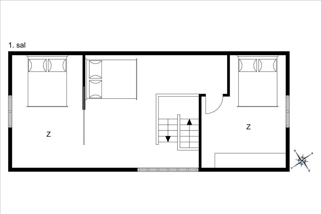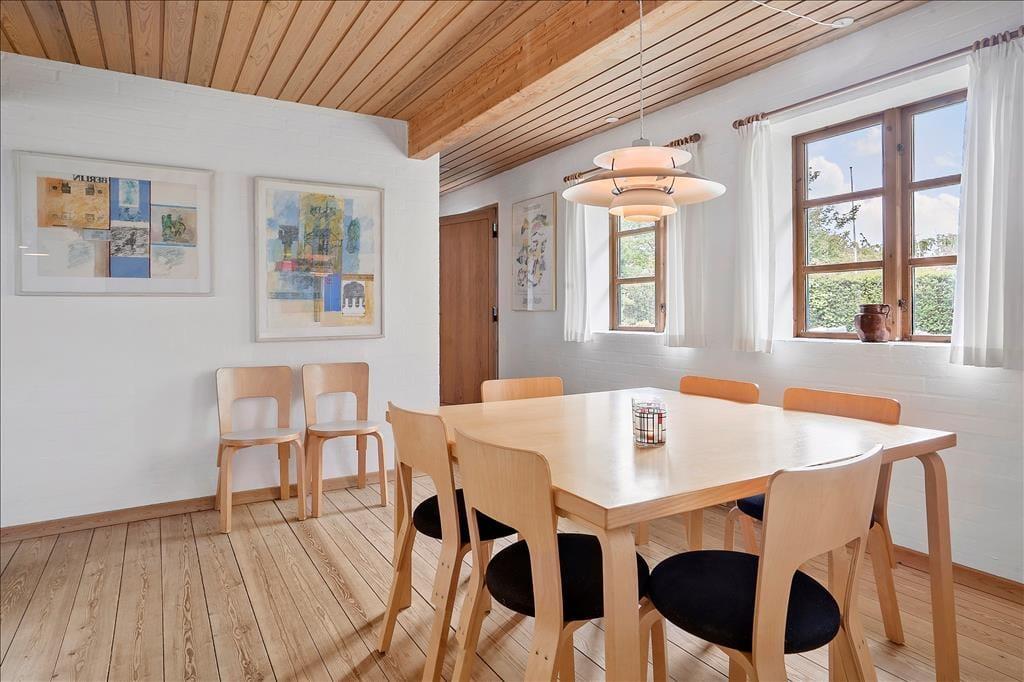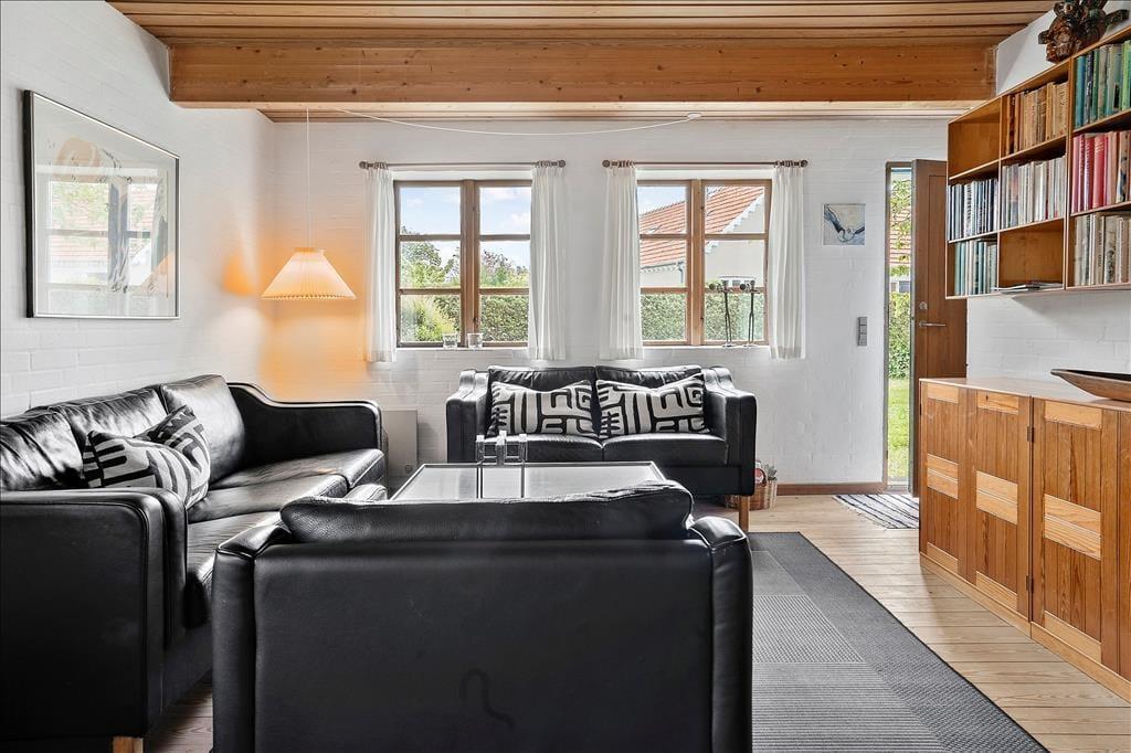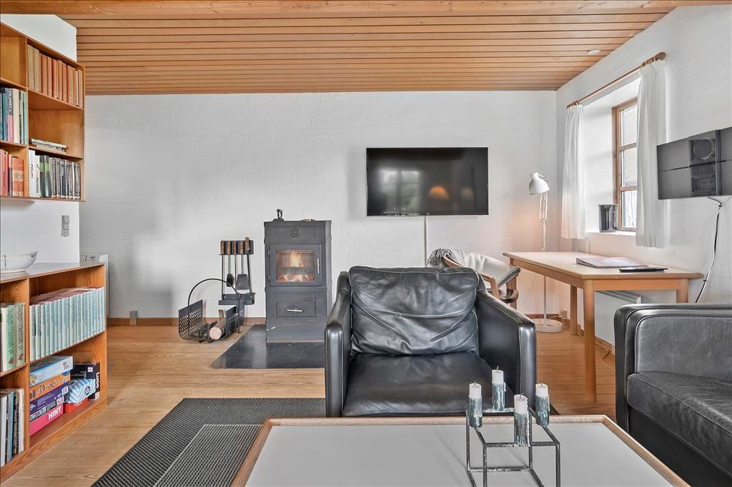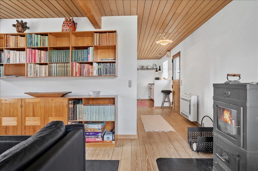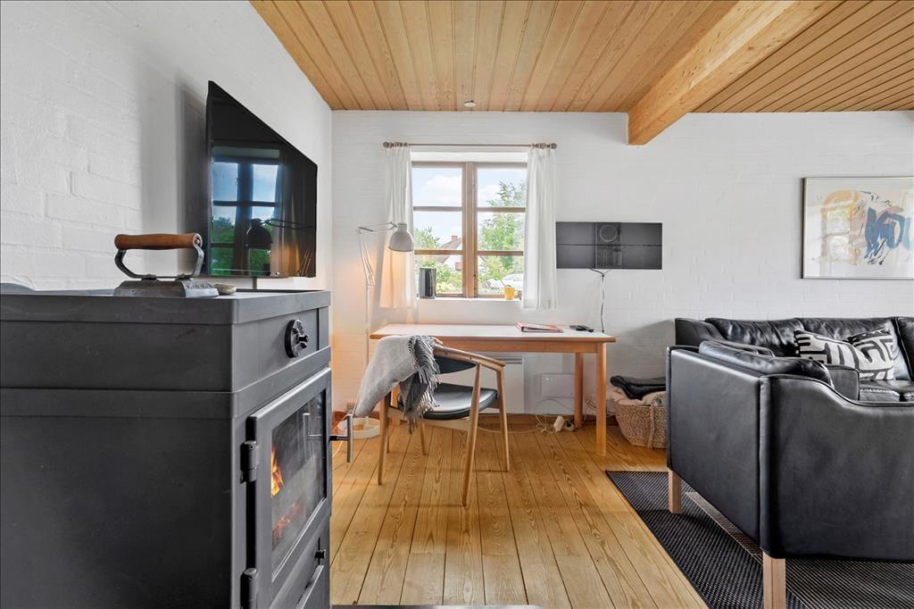 Huset er bygget i 1981 og kombinerer på smukkeste vis Nordbys oprindelige stråtage og sprossede vinduer med en mere nutidig indretning og komfort. I stueplan er der åben forbindelse mellem stue med brændeovn og alrum med velindrettet køkkenhjørne; trægulv i hele rummet og udgang til haven mod syd og nord. Bad med bruser og bryggers med tumbler og fryser. Også trægulve på 1. sal, som i gavlen mod øst er indrettet med et soverum med dobbelt boksmadras og skabe – og i gavlen mod vest med et delvist afskærmet sovehjørne med en dobbelt futonmadras.