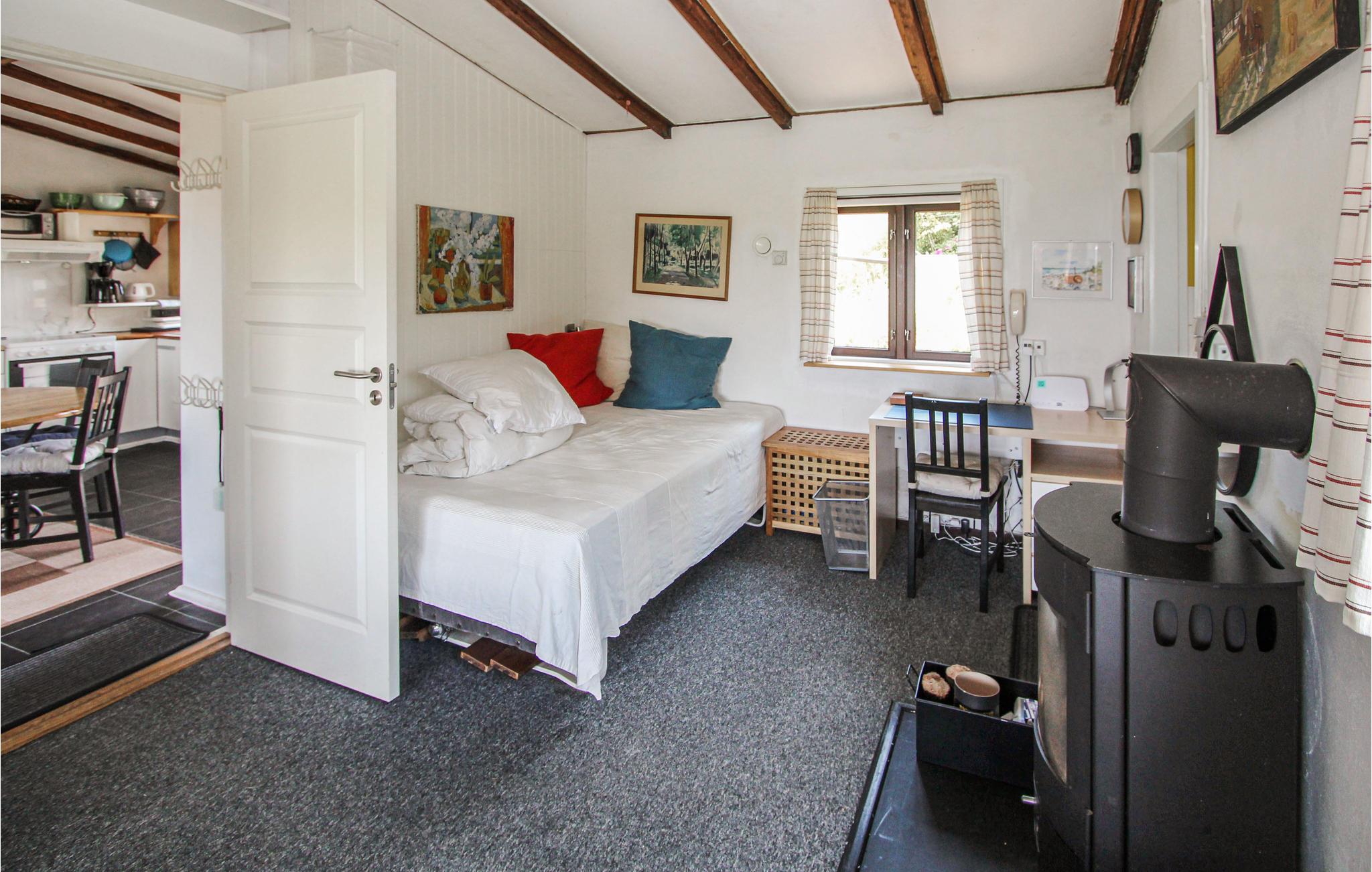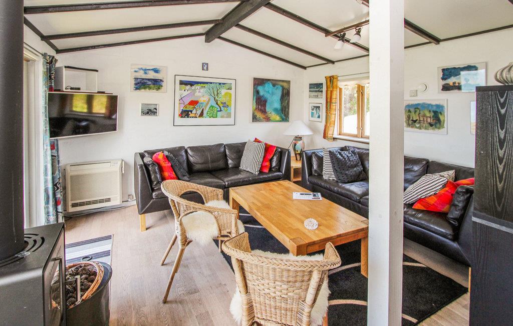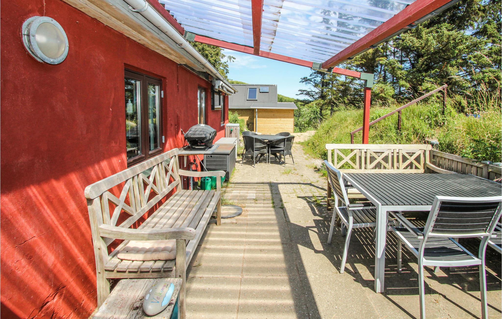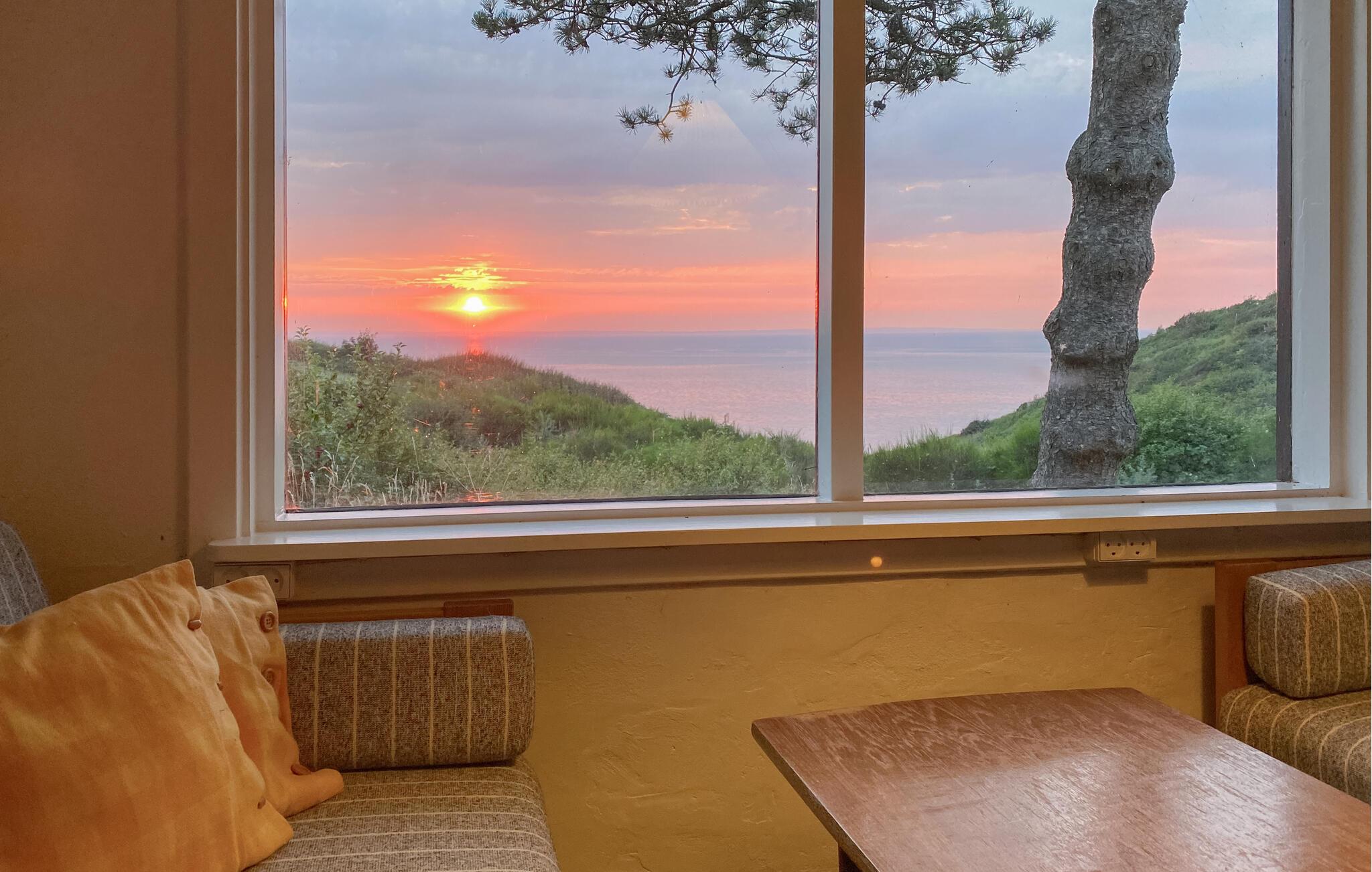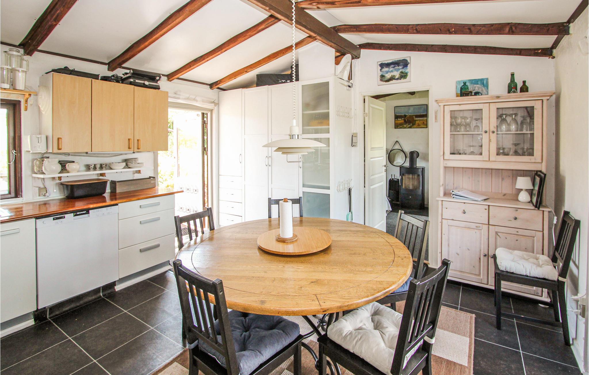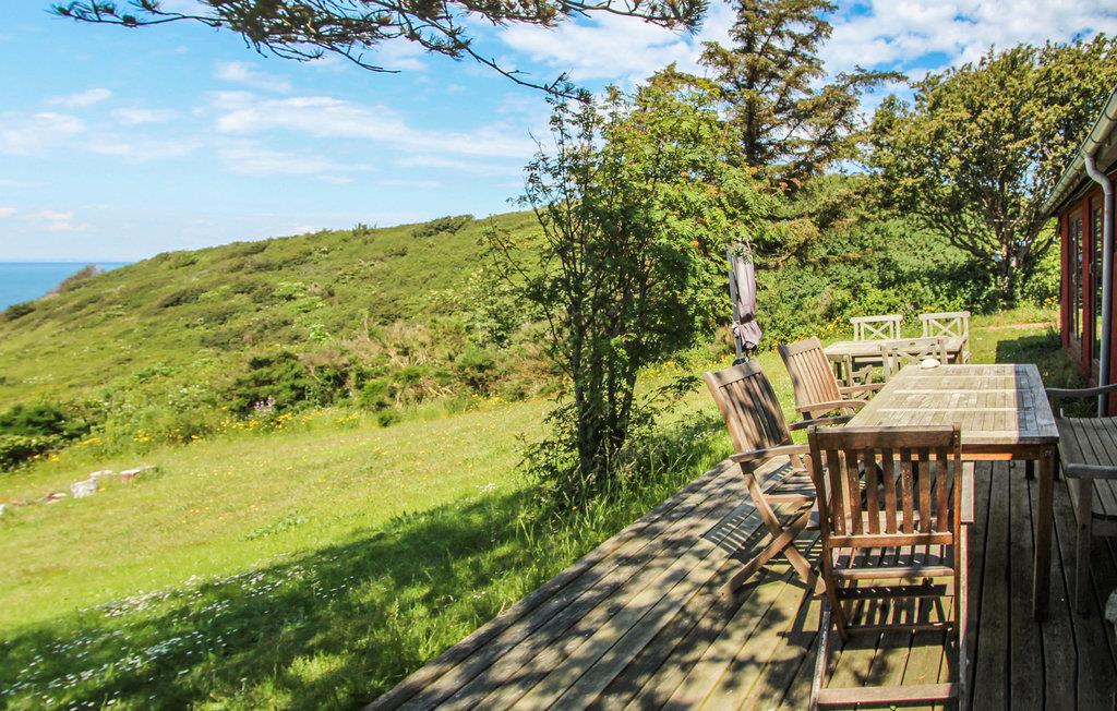 Huset indeholder et veludstyret køkken til alle former for madlavning, og udenfor kan der grilles. Køkkenet har spisebord med god plads og direkte udgang til terrasser mod både øst og vest, så det også er let at tilberede og nyde maden udendørs. I stuen er der brændeovn og panoramaudsigt over Kattegat, hvor man kan nyde solnedgangen og være heldig at spotte en flok marsvin til vands eller rådyr i bakkerne.
