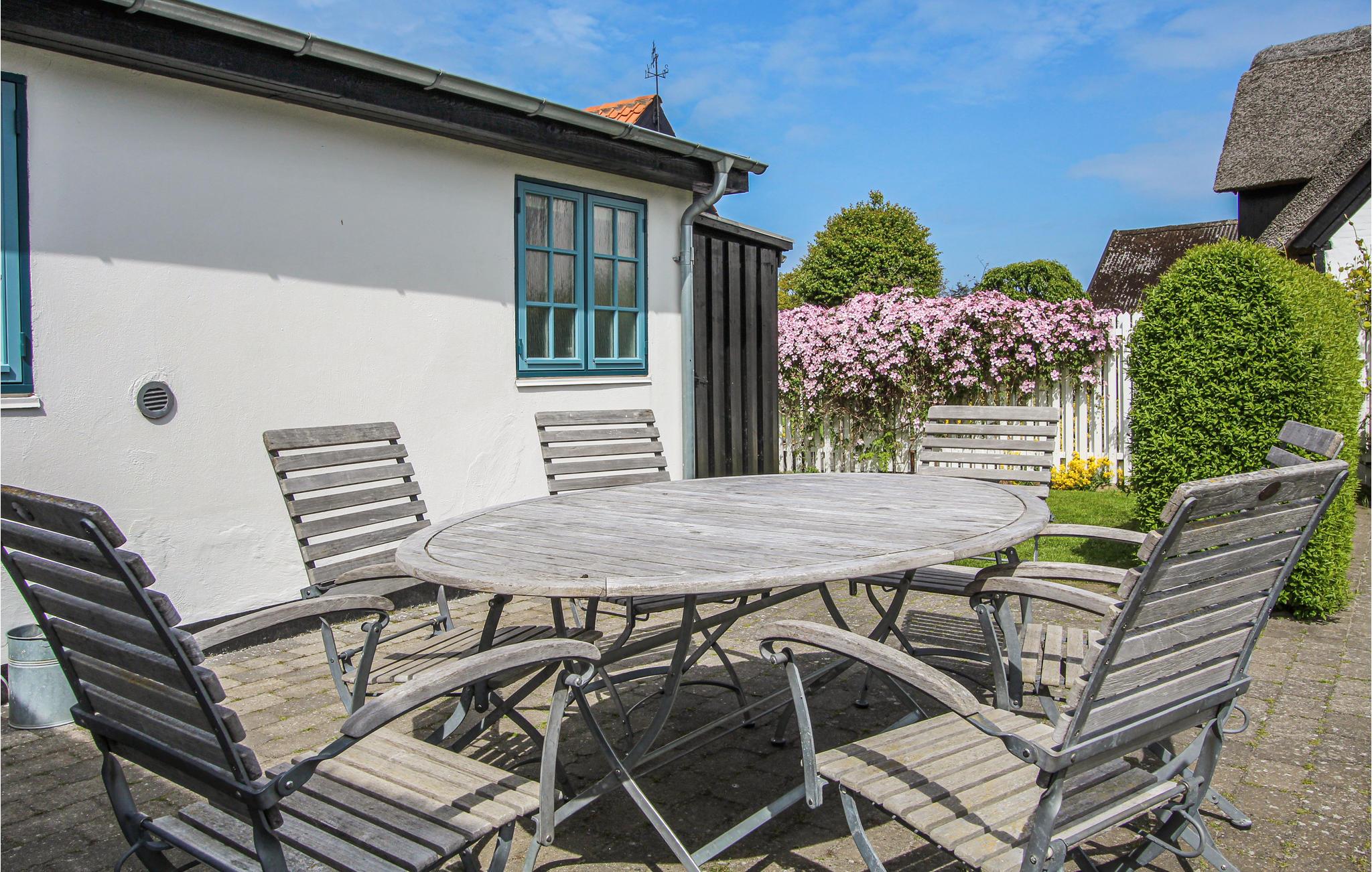 Charmerende stråtækt sommerhus i Nordby med åben terrasse og atriumhave nær Samsøs idylliske gadekær.