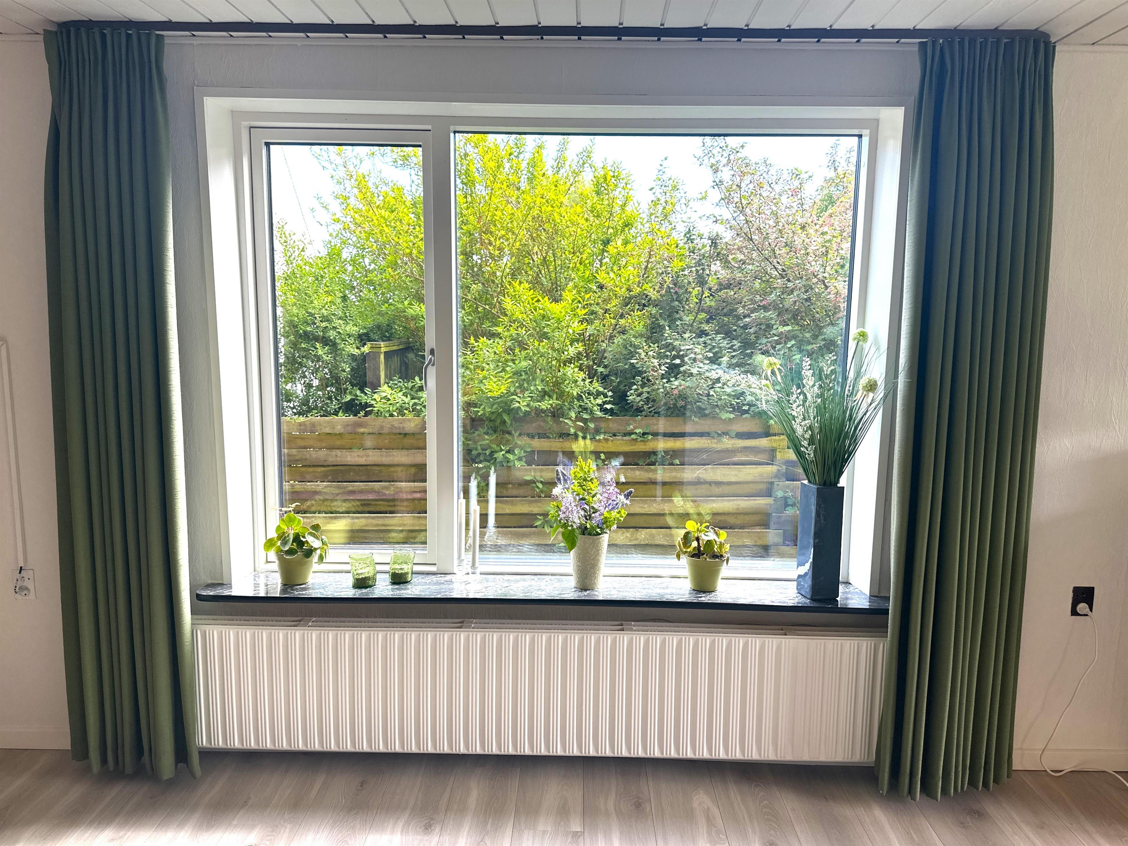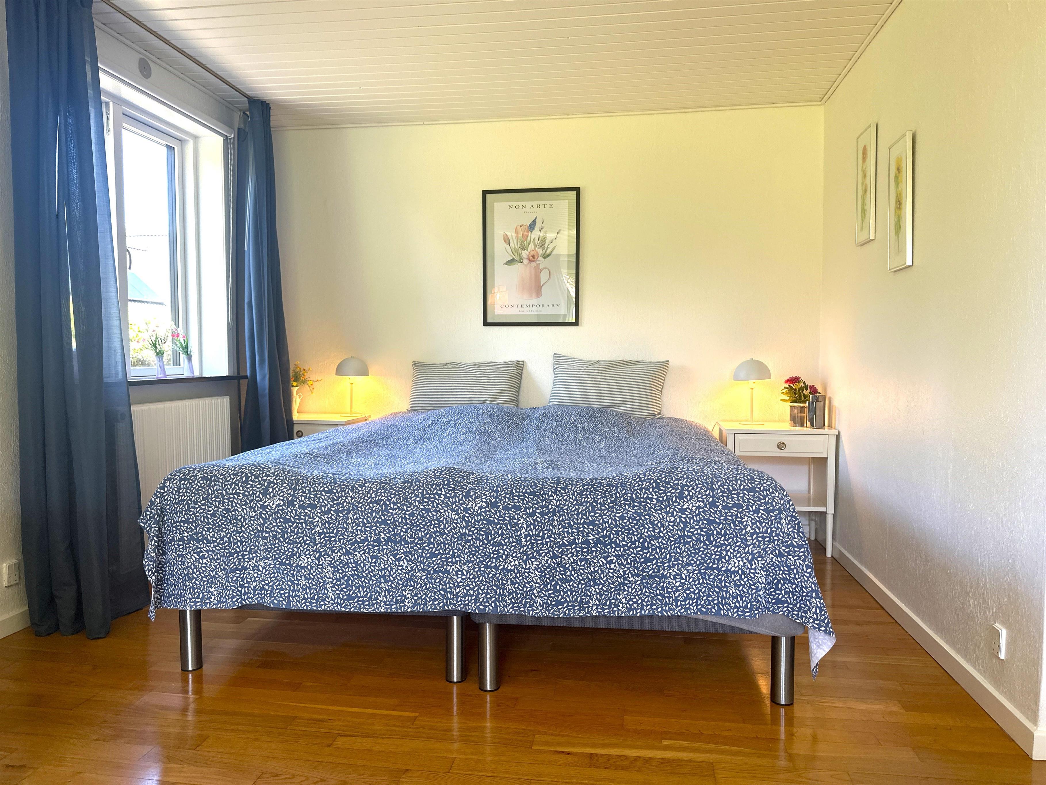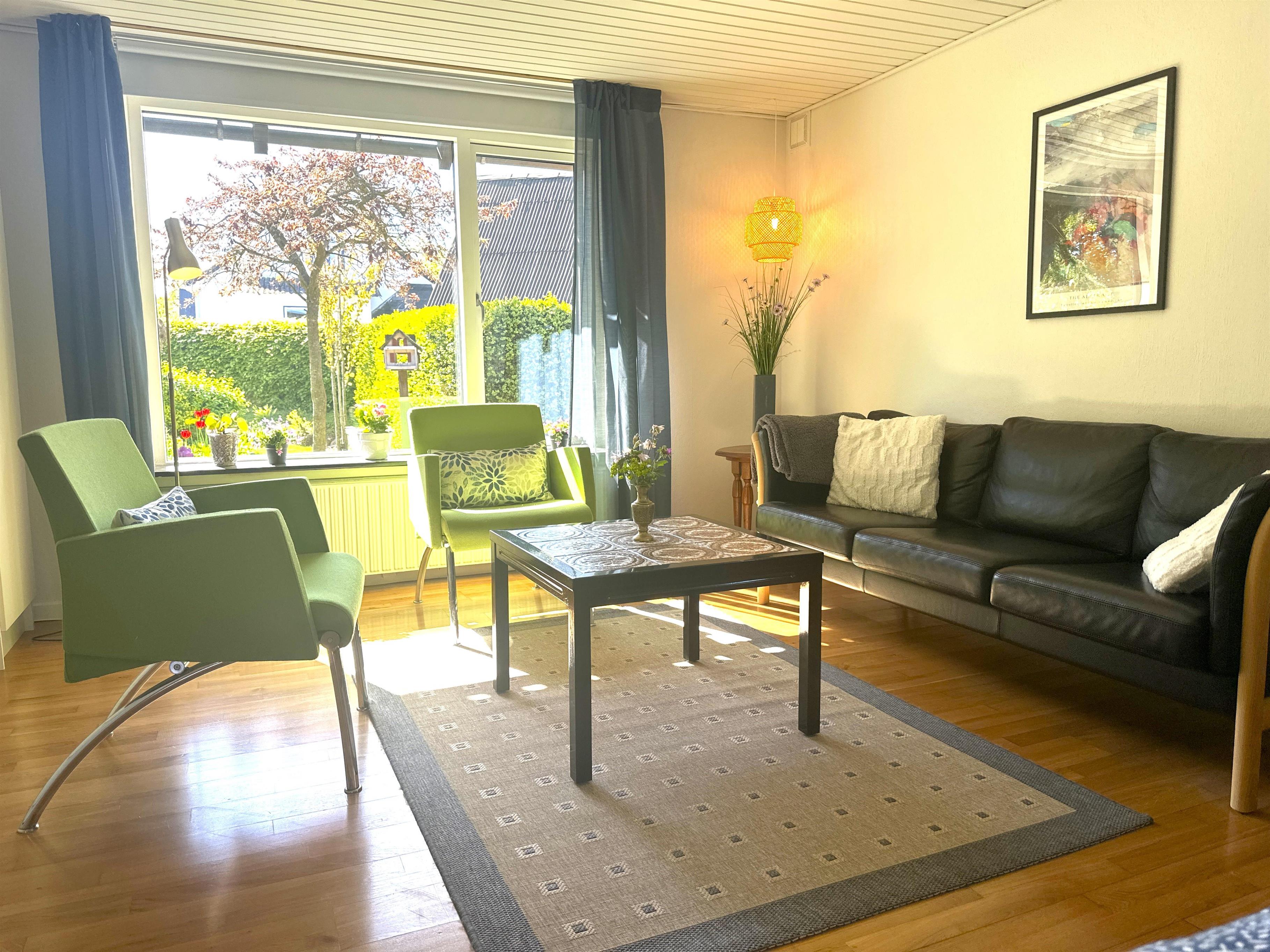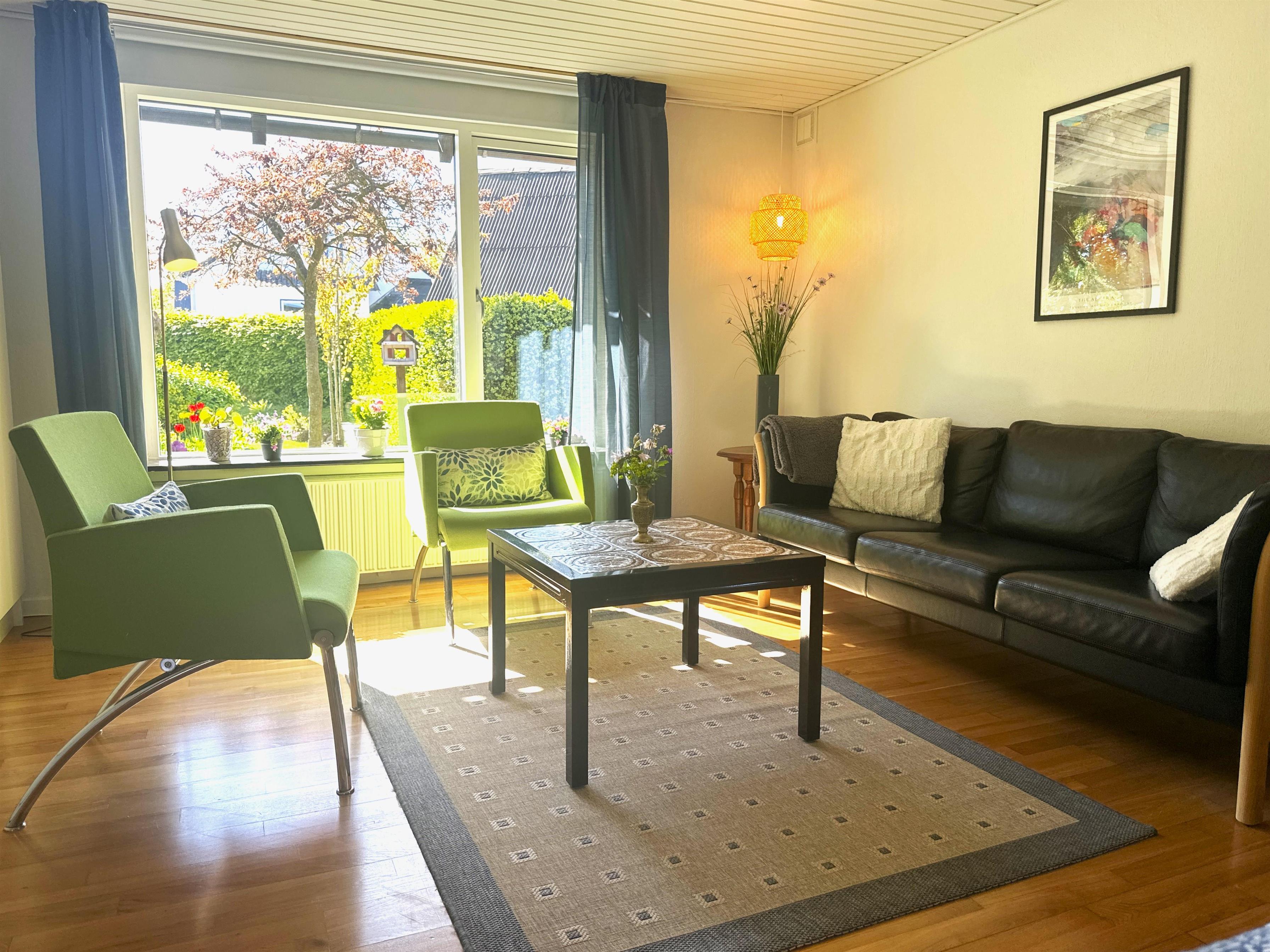 Boligen er nyrenoveret og fremstår lys, moderne og yderst indbydende. Her træder du ind i en skøn stue med store vinduer, der giver et dejligt naturligt lys og skaber en venlig atmosfære. Stuen er indrettet med både spiseplads og en komfortabel sofakrog, hvor du kan læne dig tilbage med en god bog, planlægge næste udflugt eller hygge dig efter en dag på farten.