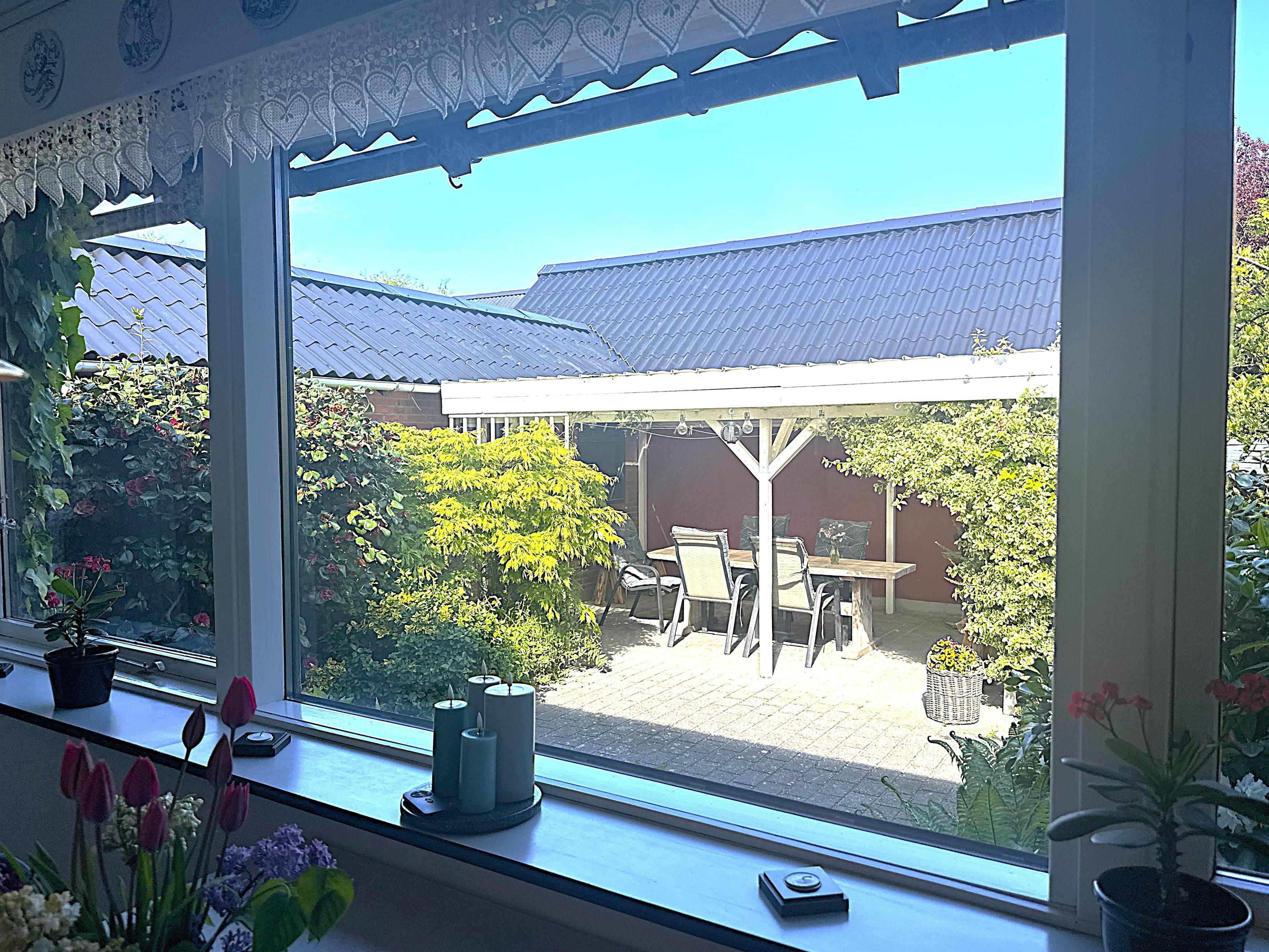 Den overdækkede terrasse er hjertet af udelivet – her kan du starte dagen med en kop kaffe, nyde frokosten i skyggen eller runde aftenen af med et godt glas vin. Uanset vejr og årstid er her altid et hyggeligt sted at opholde sig.