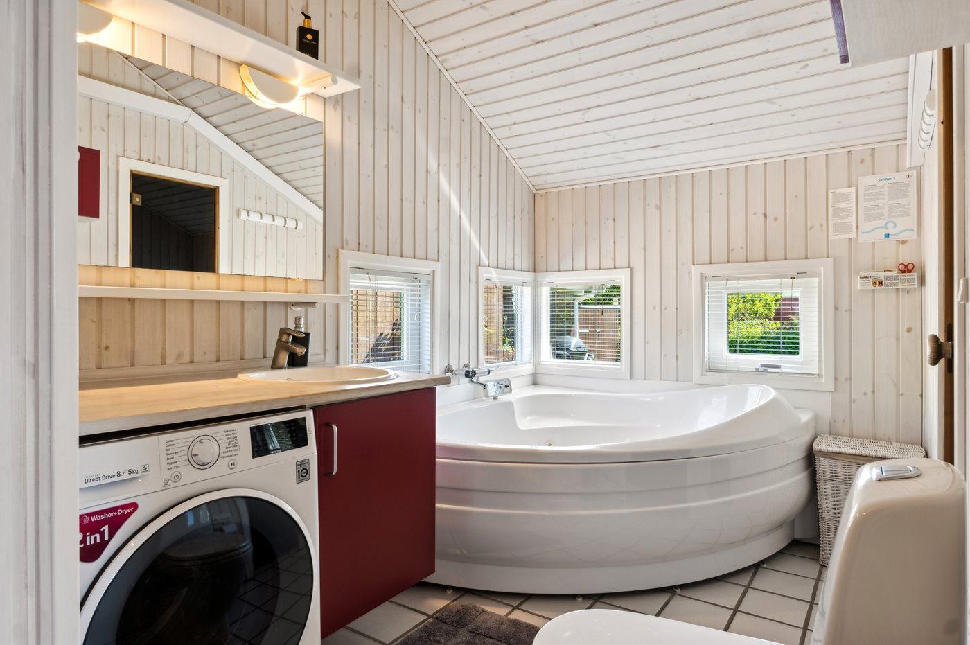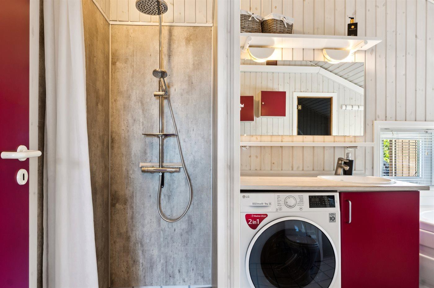 Der er 1 badeværelse med bruser og 1 toilet.. Der er gulvvarme på 1 badeværelse. I saunaen er der mulighed for afslapning.