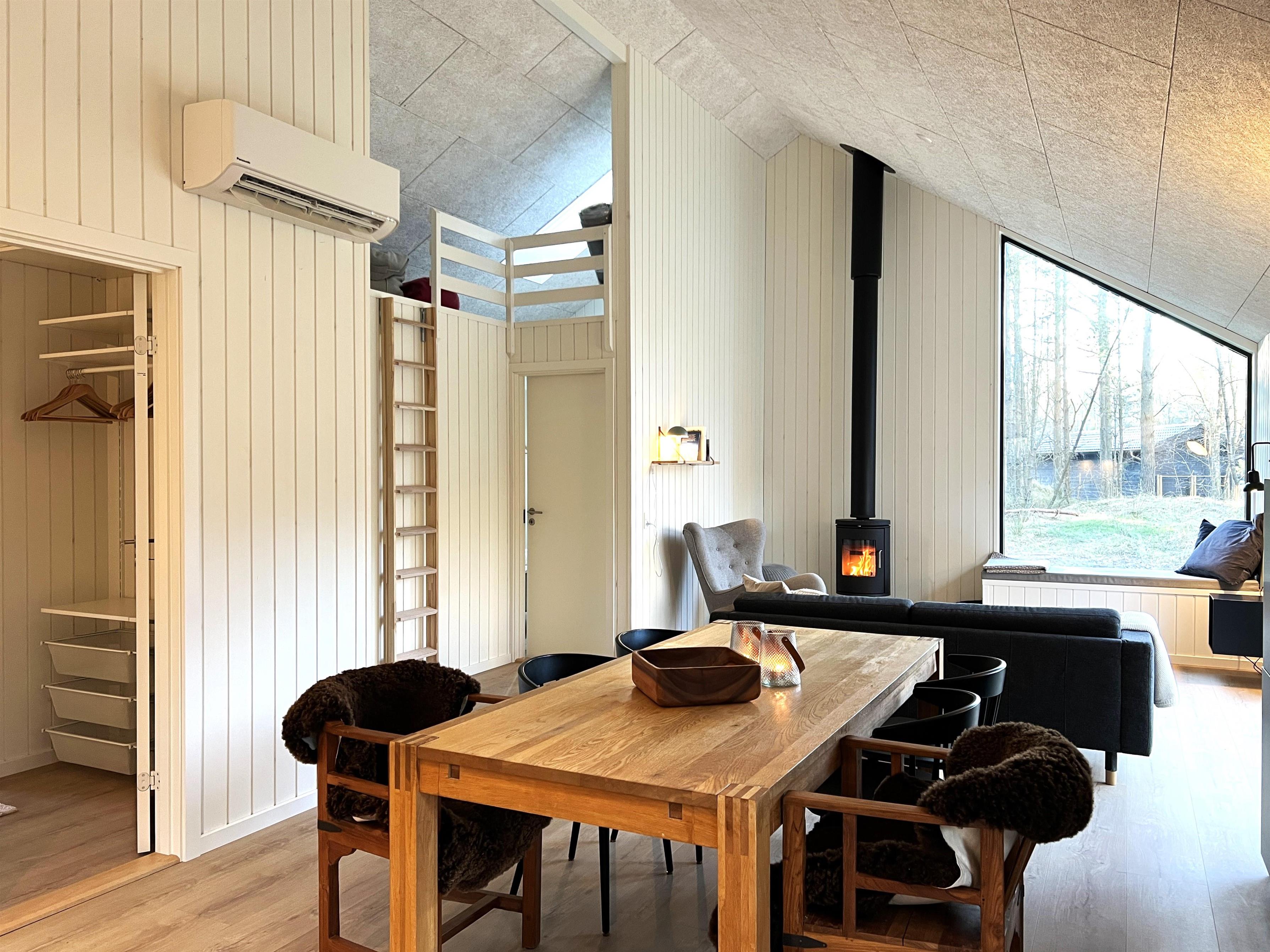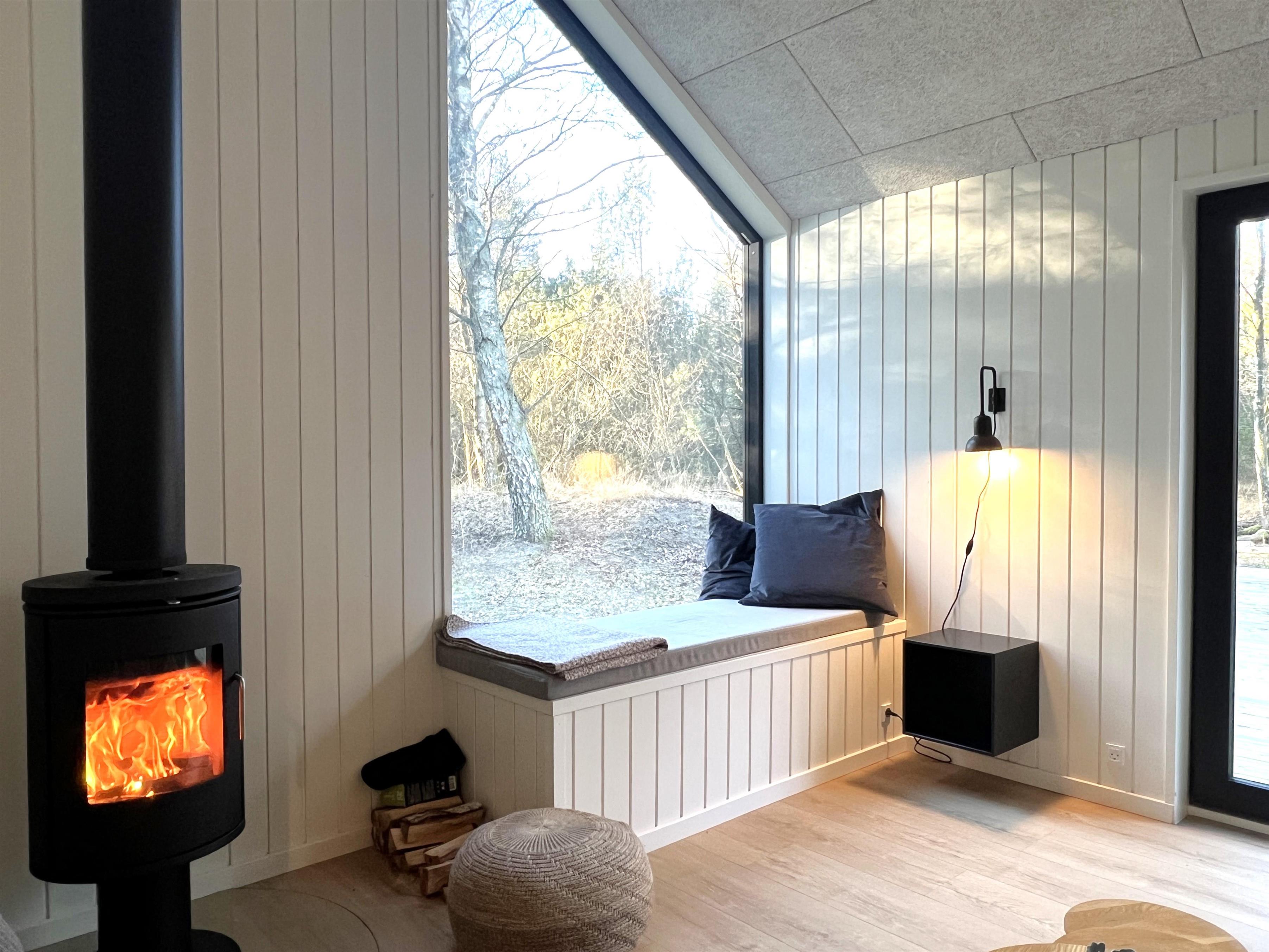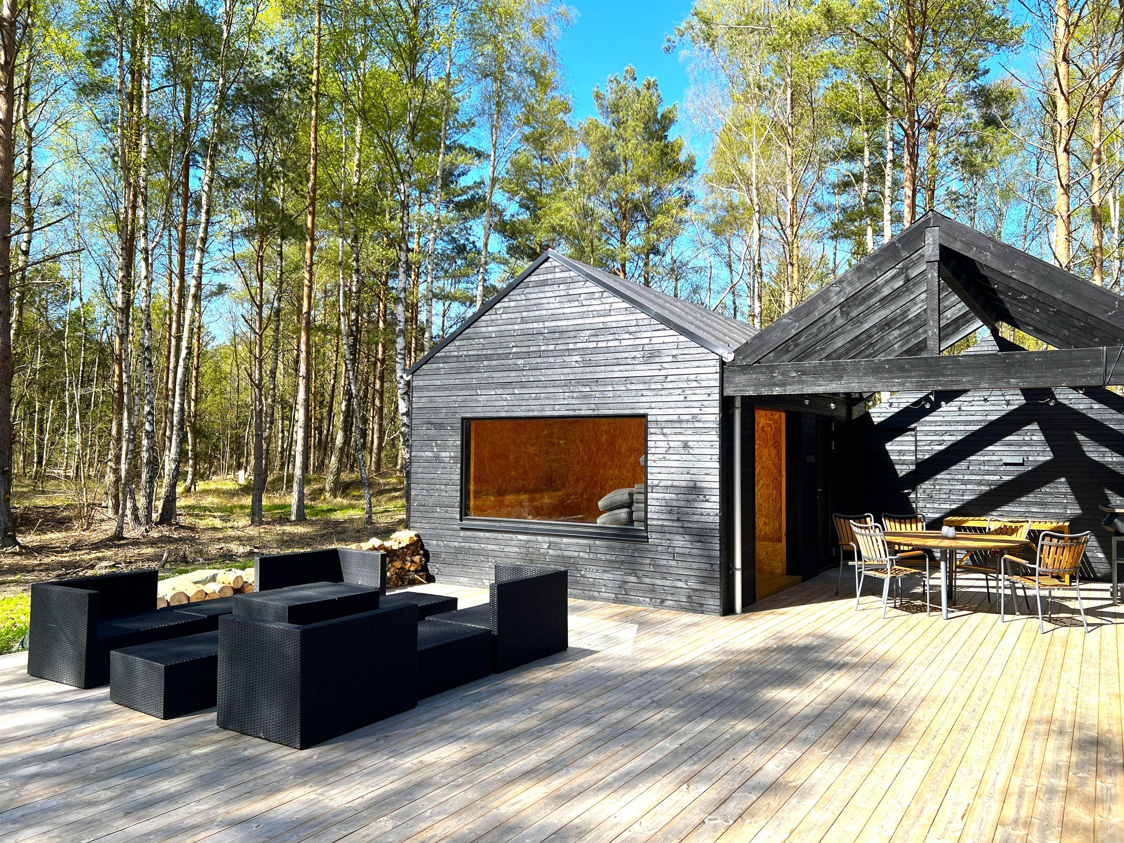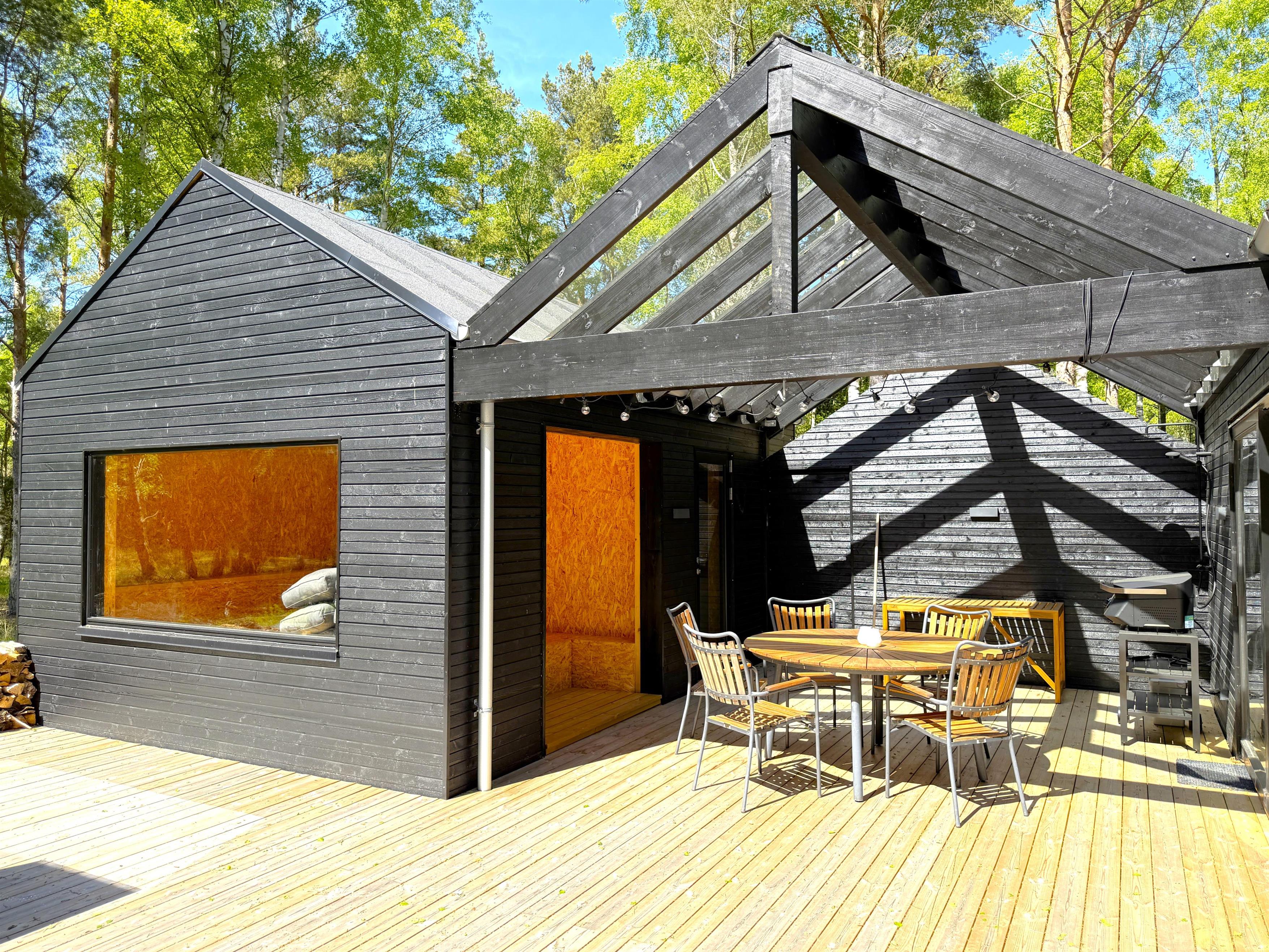 NYT hos Team Læsø. Dette nye, flotte, arkitekttegnede feriehus er netop blevet opført midt i Nordmarkens smukke natur, og indfanger den helt rigtige sommerhusatmosfære. Huset fremstår særdeles indbydende, lyst og rummeligt med mange lækre detaljer, og de store vinduespartier giver et flot lysindfald og en skøn udsigt til naturen og skoven. Der er et flot køkken-alrumrum med køkkenø og spiseplads i åben forbindelse med den store stue, hvor der også er installeret brændeovn. Her er flere hyggekroge, der indbyder til at sætte sig med en bog eller en god kop kaffe. Desuden tre fine soveværelser, hvoraf to har dobbeltsenge og det sidste har en køjeseng med 3/4 seng nederst - egen udgang fra alle soveværelser. Der er et dejligt stort badeværelse, både med badekar og brus, og også et velplaceret ekstra toilet. På husets lille 1. sal er der et ekstra rum med skrivebord. Fra køkken-alrummet er der terrassedøre til den store træterrasse, hvor husets gode havemøbler og grill kan benyttes. I forlængelse af træ-terrassen ligger en ekstra tilbygning, som bl.a. har en skøn shelter med et stort vinduesparti. Her kan de sene aftentimer tilbringes og det er rigtigt hyggeligt indrettet til både store og små. Der er desuden mange gode stier i området og kort afstand til stranden og havet. Husets komfortable indretning og placering lægger op til en dejlig, afslappende ferie, hvor man straks fornemmer den særegne Læsø-ro og unikke natur. Samtidigt ligger huset dejligt roligt placeret med cykelafstand til Læsøs golfbane, samt Østerby Havns hyggelige havnemiljø med fiskehandler, indkøb og restauranter.