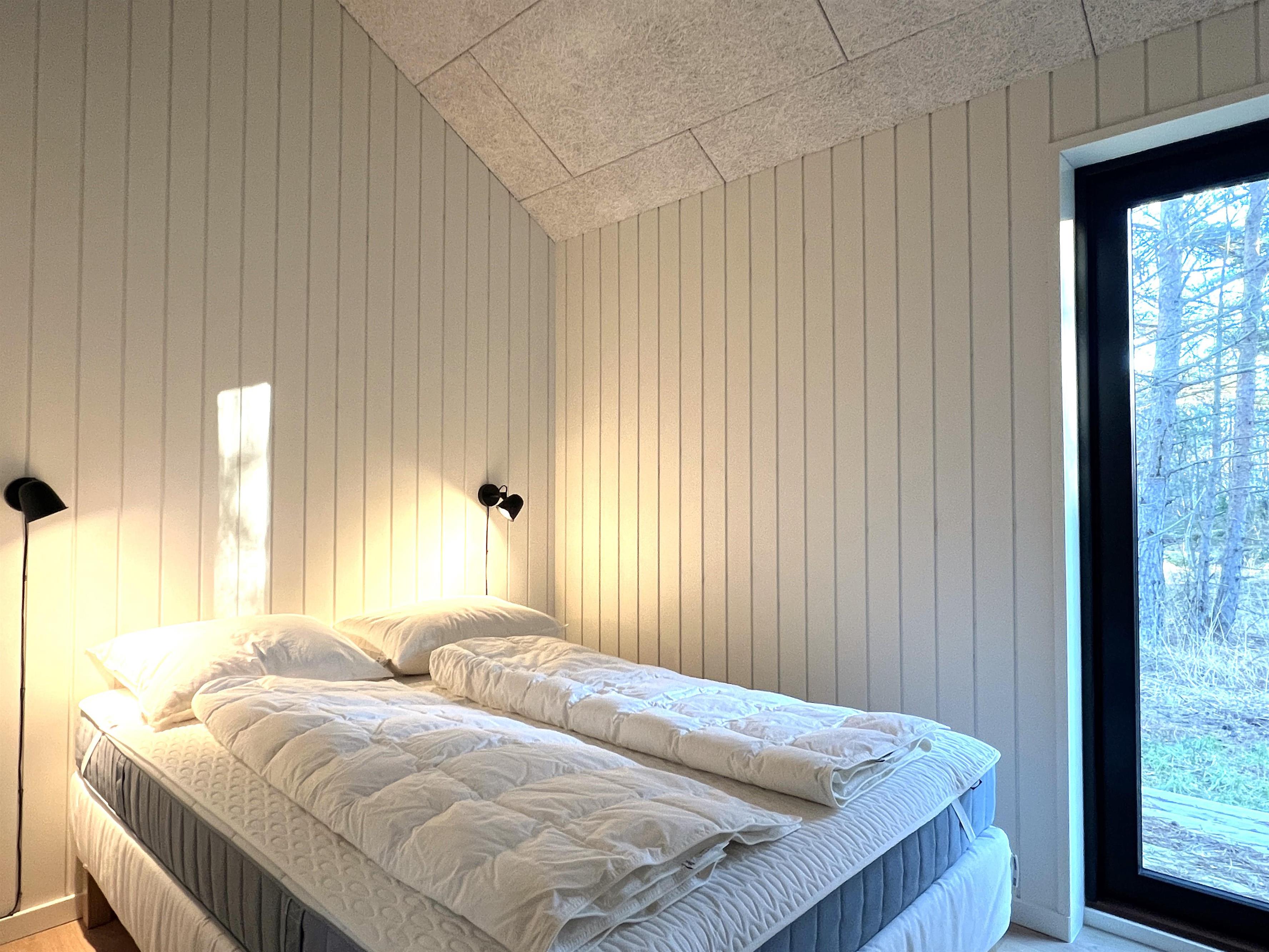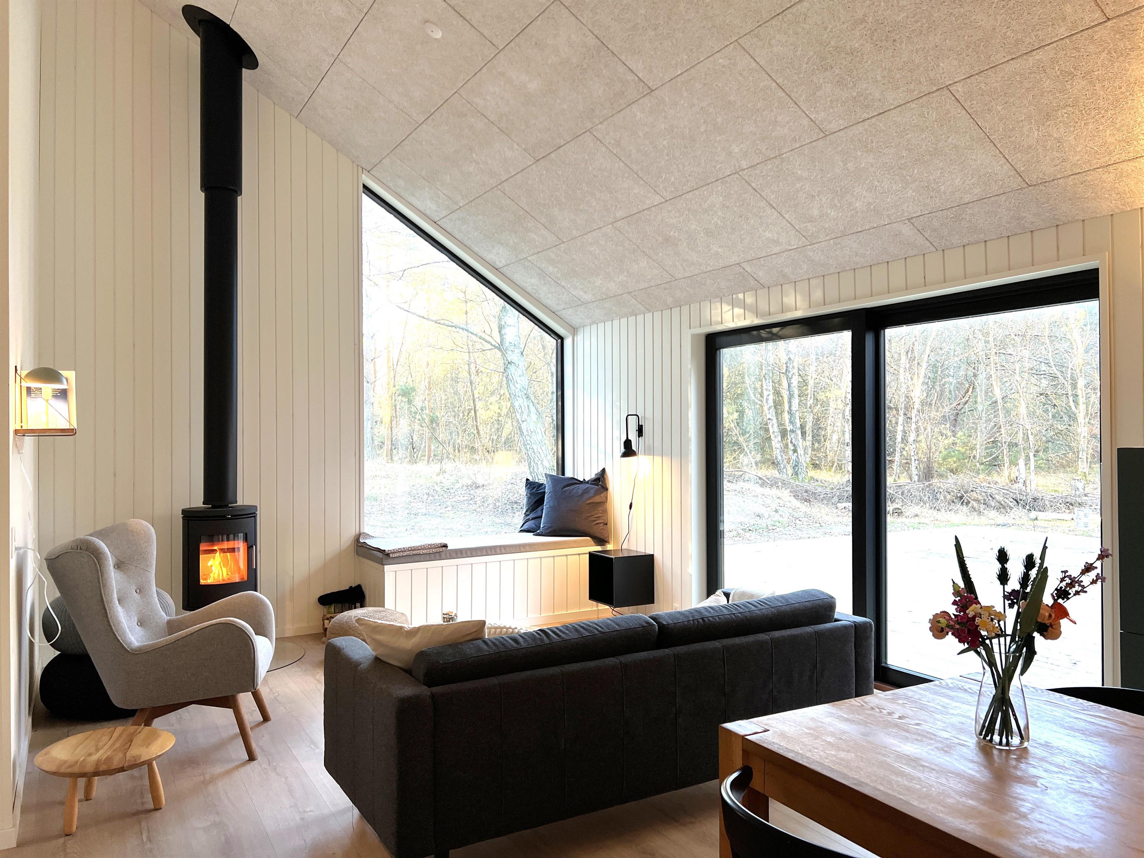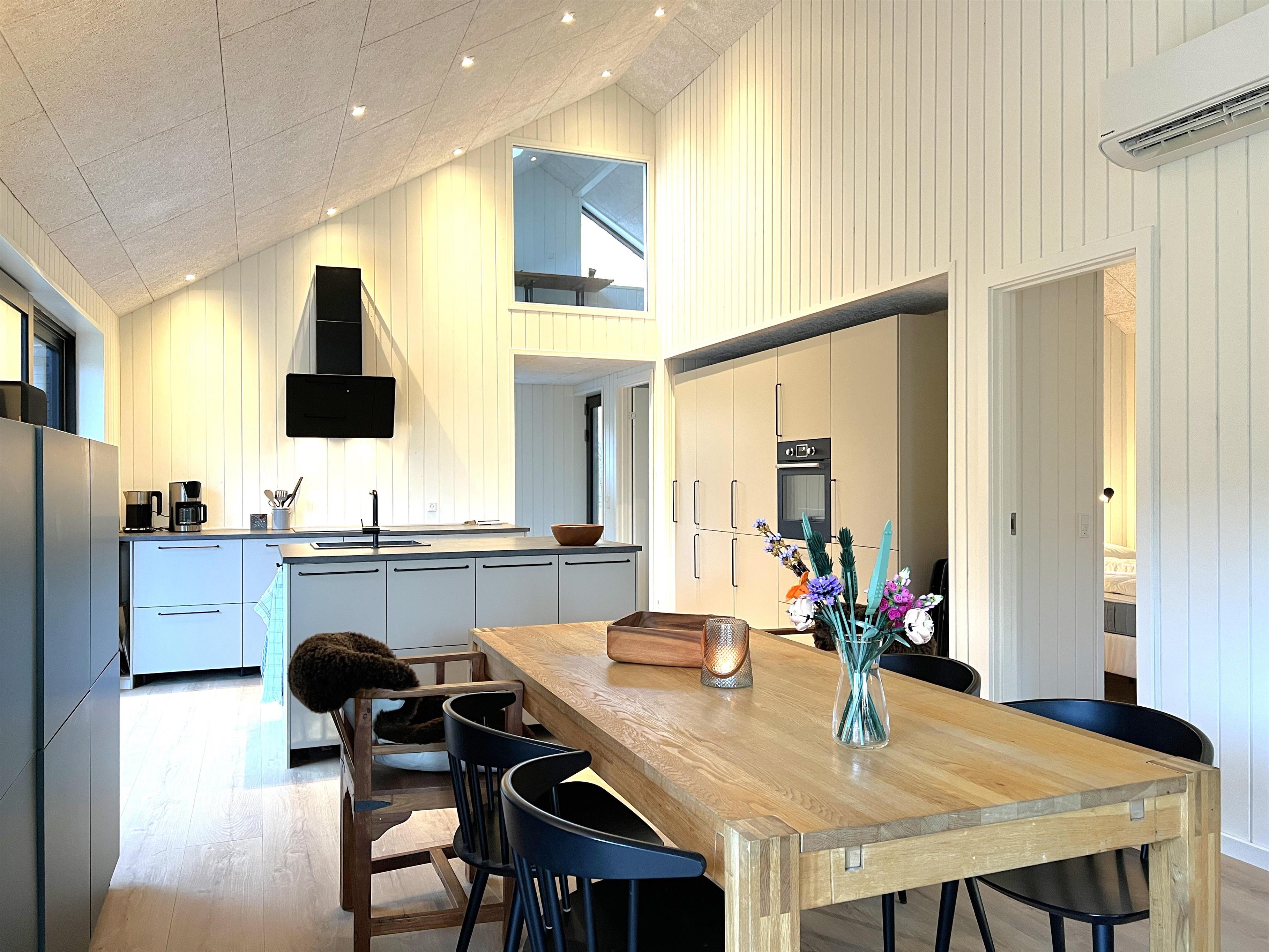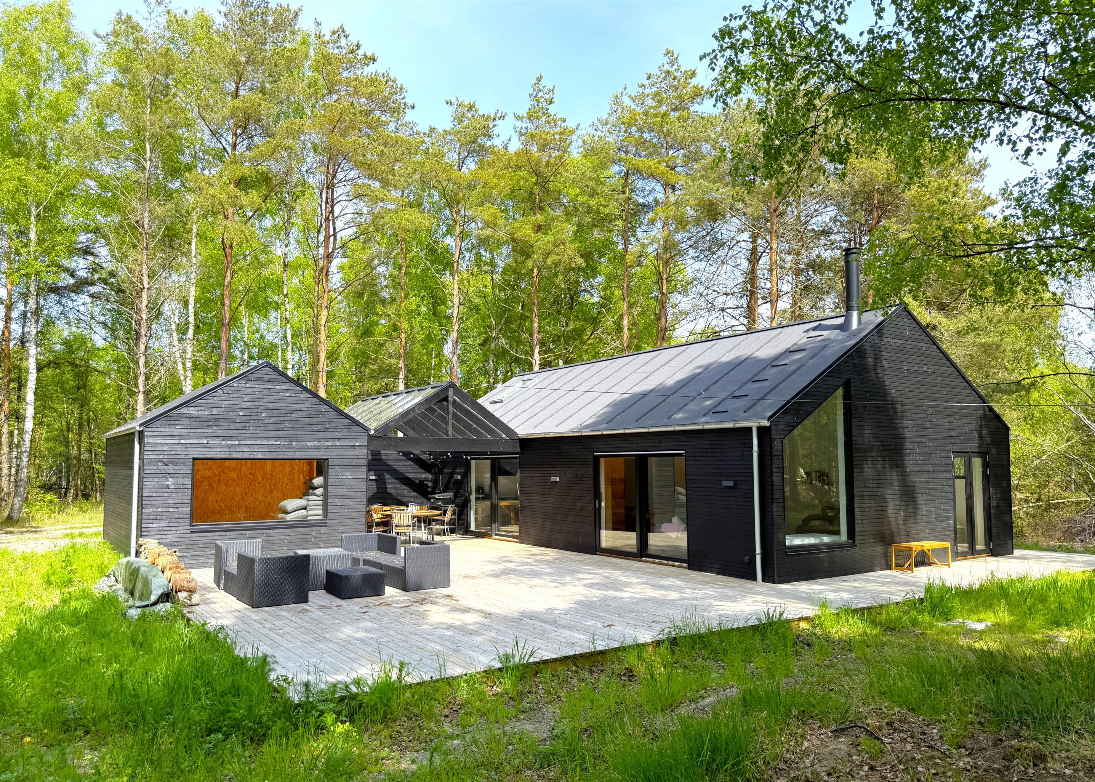 NYT hos Team Læsø. Dette nye, flotte, arkitekttegnede feriehus er netop blevet opført midt i Nordmarkens smukke natur, og indfanger den helt rigtige sommerhusatmosfære. Huset fremstår særdeles indbydende, lyst og rummeligt med mange lækre detaljer, og de store vinduespartier giver et flot lysindfald og en skøn udsigt til naturen og skoven. Der er et flot køkken-alrumrum med køkkenø og spiseplads i åben forbindelse med den store stue, hvor der også er installeret brændeovn. Her er flere hyggekroge, der indbyder til at sætte sig med en bog eller en god kop kaffe. Desuden tre fine soveværelser, hvoraf to har dobbeltsenge og det sidste har en køjeseng med 3/4 seng nederst - egen udgang fra alle soveværelser. Der er et dejligt stort badeværelse, både med badekar og brus, og også et velplaceret ekstra toilet. På husets lille 1. sal er der et ekstra rum med skrivebord. Fra køkken-alrummet er der terrassedøre til den store træterrasse, hvor husets gode havemøbler og grill kan benyttes. I forlængelse af træ-terrassen ligger en ekstra tilbygning, som bl.a. har en skøn shelter med et stort vinduesparti. Her kan de sene aftentimer tilbringes og det er rigtigt hyggeligt indrettet til både store og små. Der er desuden mange gode stier i området og kort afstand til stranden og havet. Husets komfortable indretning og placering lægger op til en dejlig, afslappende ferie, hvor man straks fornemmer den særegne Læsø-ro og unikke natur. Samtidigt ligger huset dejligt roligt placeret med cykelafstand til Læsøs golfbane, samt Østerby Havns hyggelige havnemiljø med fiskehandler, indkøb og restauranter.