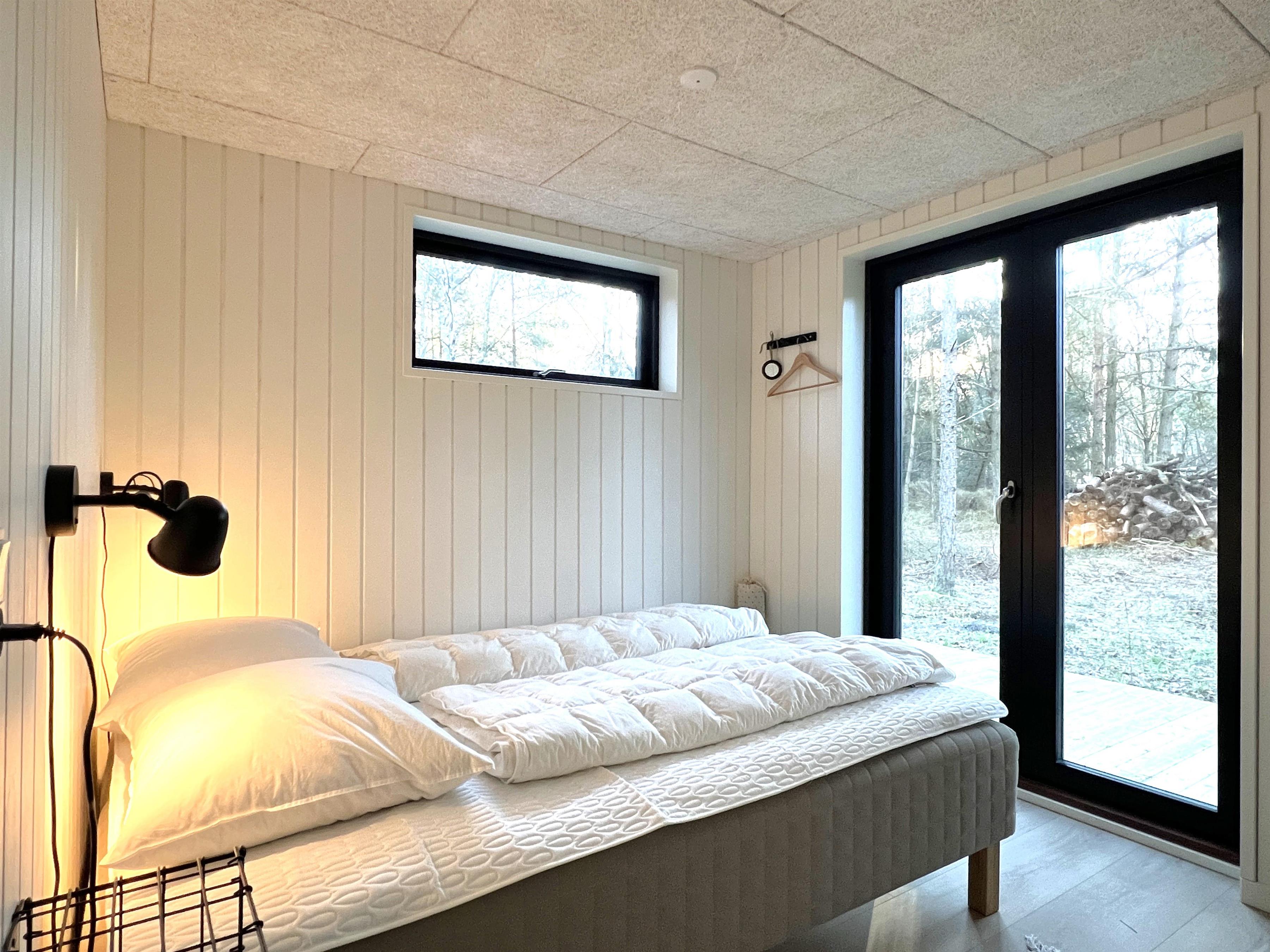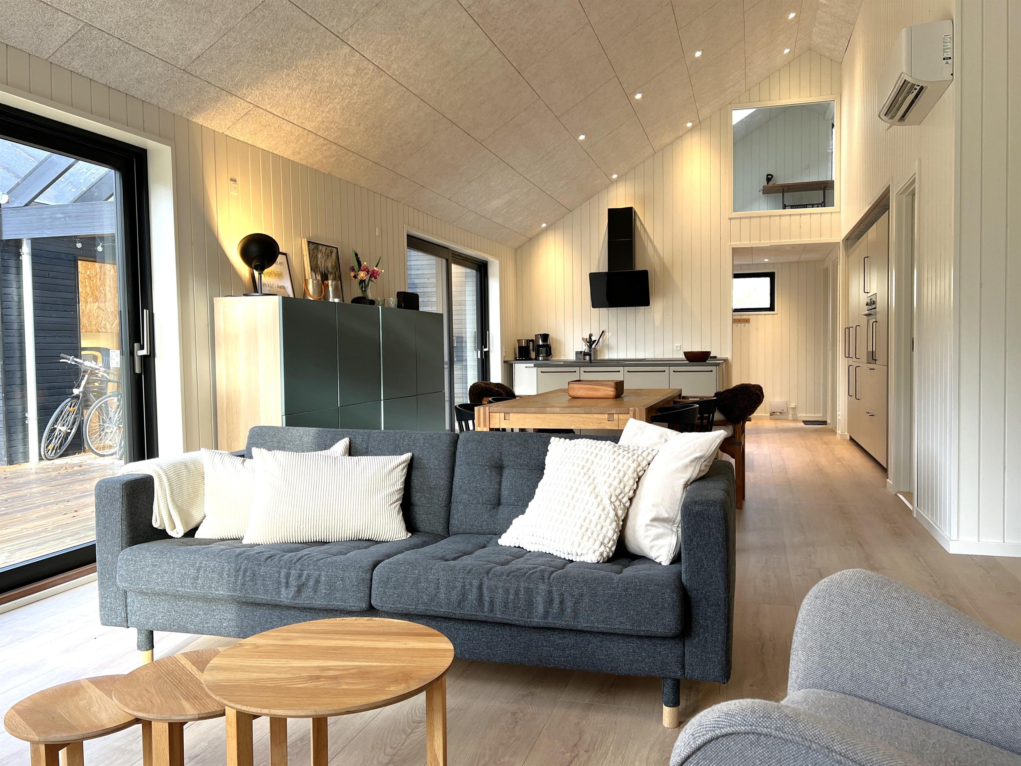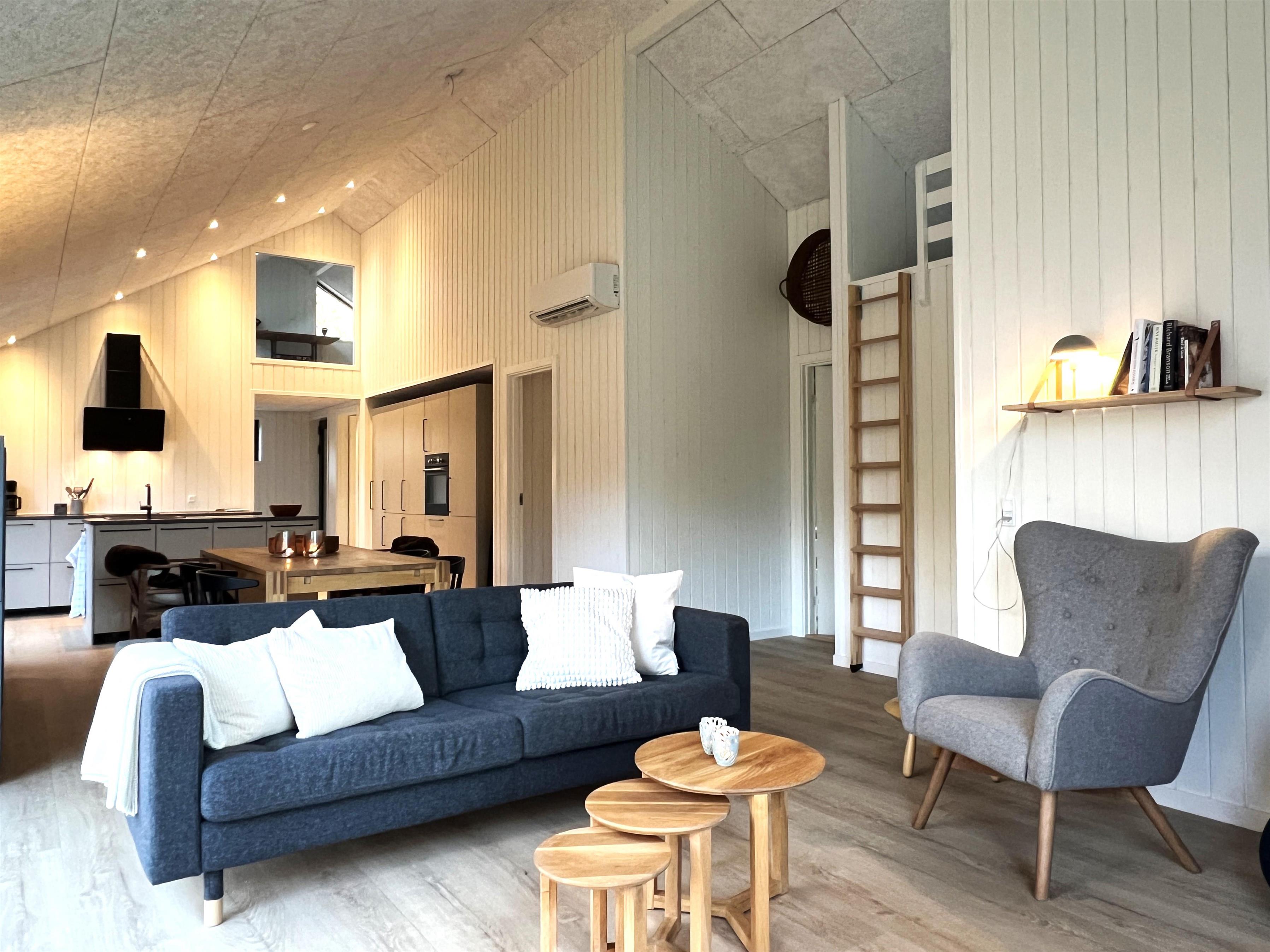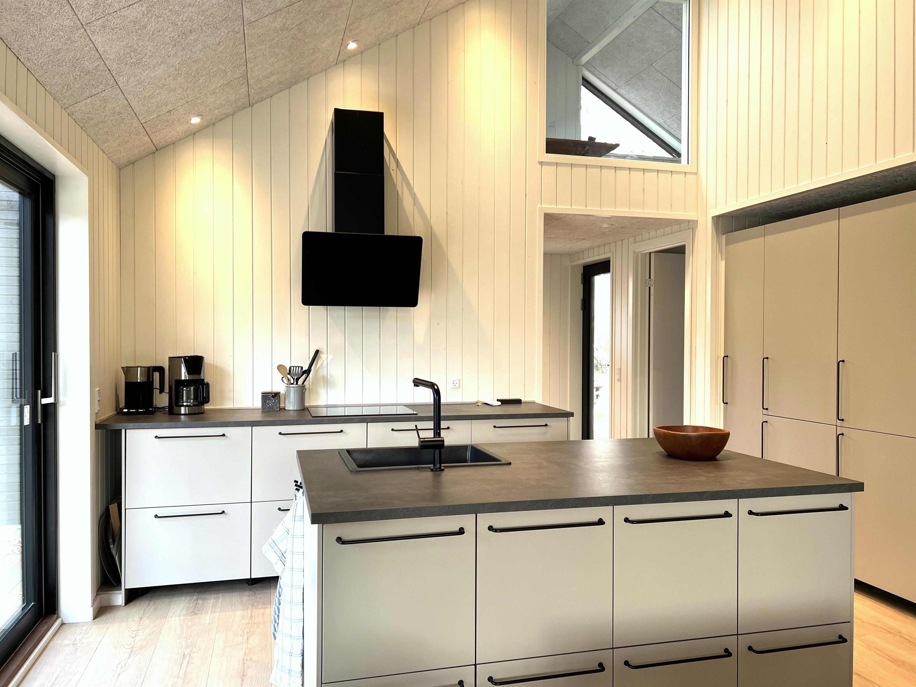 NYT hos Team Læsø. Dette nye, flotte, arkitekttegnede feriehus er netop blevet opført midt i Nordmarkens smukke natur, og indfanger den helt rigtige sommerhusatmosfære. Huset fremstår særdeles indbydende, lyst og rummeligt med mange lækre detaljer, og de store vinduespartier giver et flot lysindfald og en skøn udsigt til naturen og skoven. Der er et flot køkken-alrumrum med køkkenø og spiseplads i åben forbindelse med den store stue, hvor der også er installeret brændeovn. Her er flere hyggekroge, der indbyder til at sætte sig med en bog eller en god kop kaffe. Desuden tre fine soveværelser, hvoraf to har dobbeltsenge og det sidste har en køjeseng med 3/4 seng nederst - egen udgang fra alle soveværelser. Der er et dejligt stort badeværelse, både med badekar og brus, og også et velplaceret ekstra toilet. På husets lille 1. sal er der et ekstra rum med skrivebord. Fra køkken-alrummet er der terrassedøre til den store træterrasse, hvor husets gode havemøbler og grill kan benyttes. I forlængelse af træ-terrassen ligger en ekstra tilbygning, som bl.a. har en skøn shelter med et stort vinduesparti. Her kan de sene aftentimer tilbringes og det er rigtigt hyggeligt indrettet til både store og små. Der er desuden mange gode stier i området og kort afstand til stranden og havet. Husets komfortable indretning og placering lægger op til en dejlig, afslappende ferie, hvor man straks fornemmer den særegne Læsø-ro og unikke natur. Samtidigt ligger huset dejligt roligt placeret med cykelafstand til Læsøs golfbane, samt Østerby Havns hyggelige havnemiljø med fiskehandler, indkøb og restauranter.