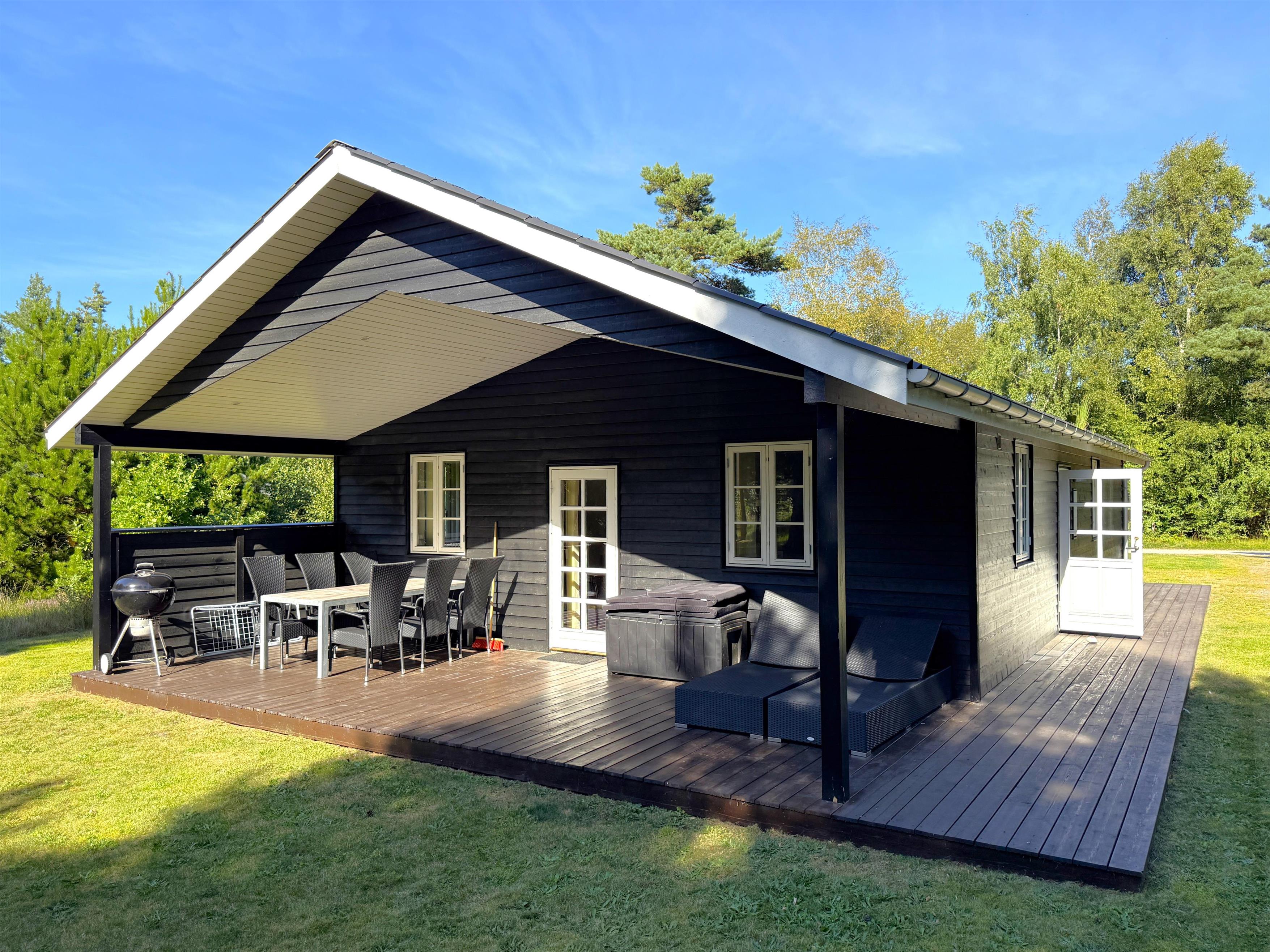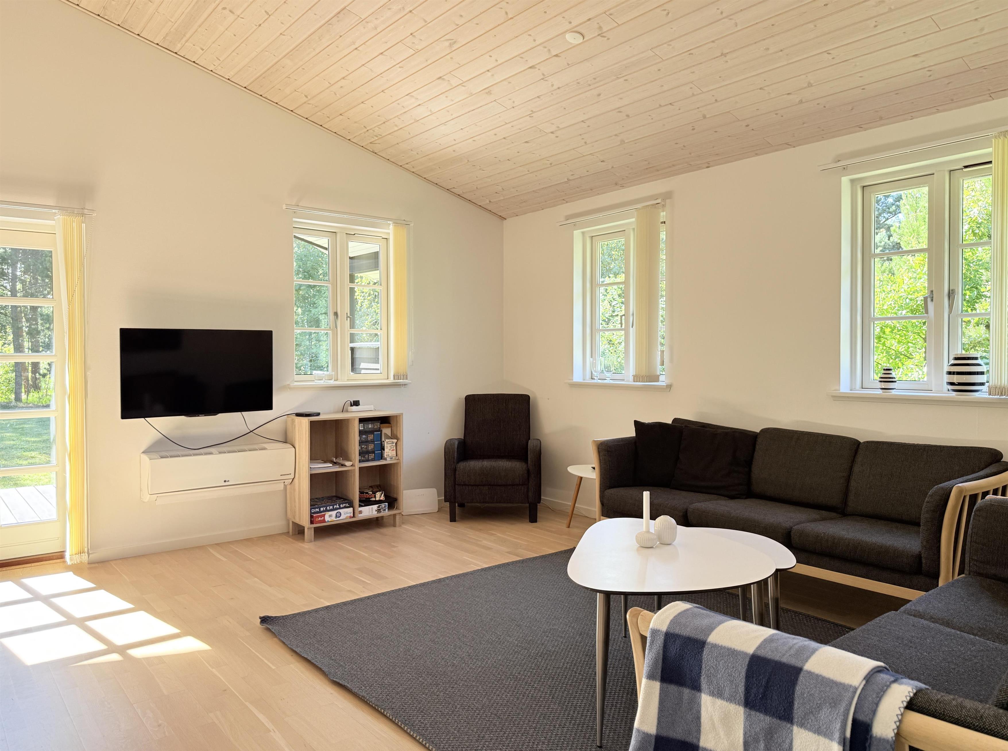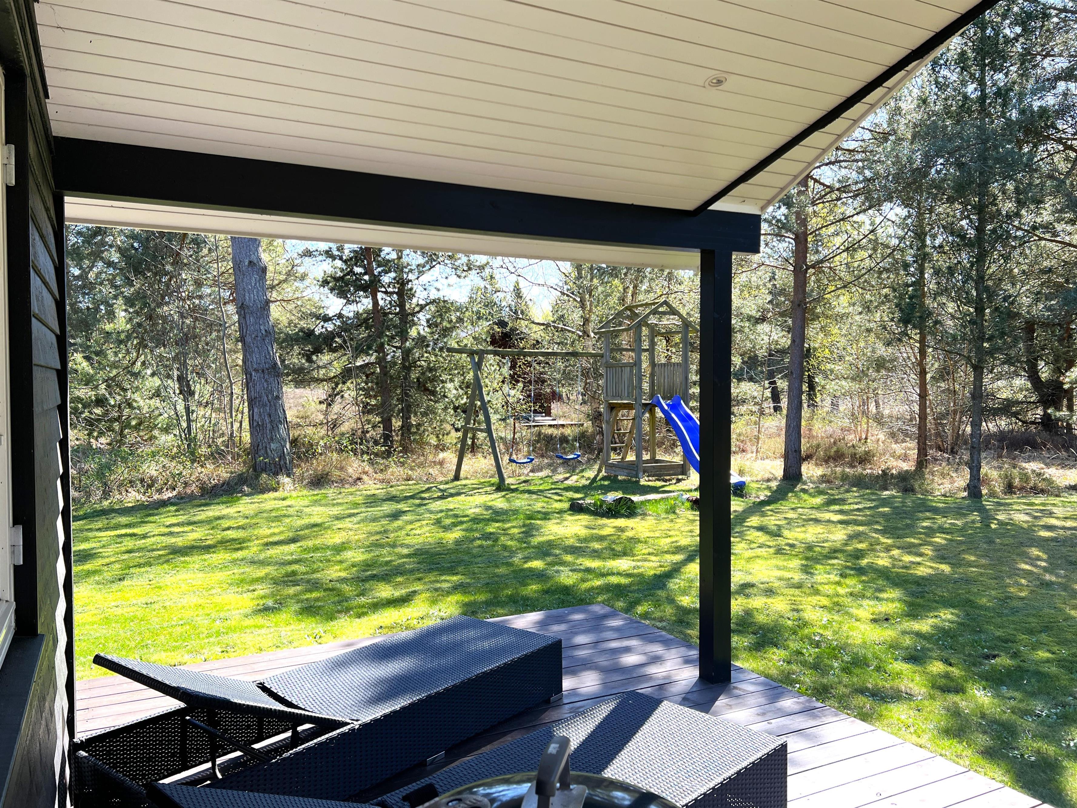 Det store feriehus fremstår lyst og rummeligt og med god plads til familien. Huset har et stort køkken-alrum med flot køkken, spiseplads og stue med TV. Der er tre gode soveværelser med behagelige dobbeltsenge i to af værelserne og to enkeltsenge i det tredje. Der er meget fin skabsplads i alle værelser. Lækkert badeværelse med brus og sauna. Fra stuen er der udgang til den skønne overdækkede træterrasse med havemøbler og solsenge, og her kan husets grill også benyttes. Her kan man finde mange solkroge, og terrassen vender mod det smukke naturområde, der gør at man fornemmer roen og naturen - ikke mindst på de skønne sommeraftener. Der er også en lille legeplads til børnene.