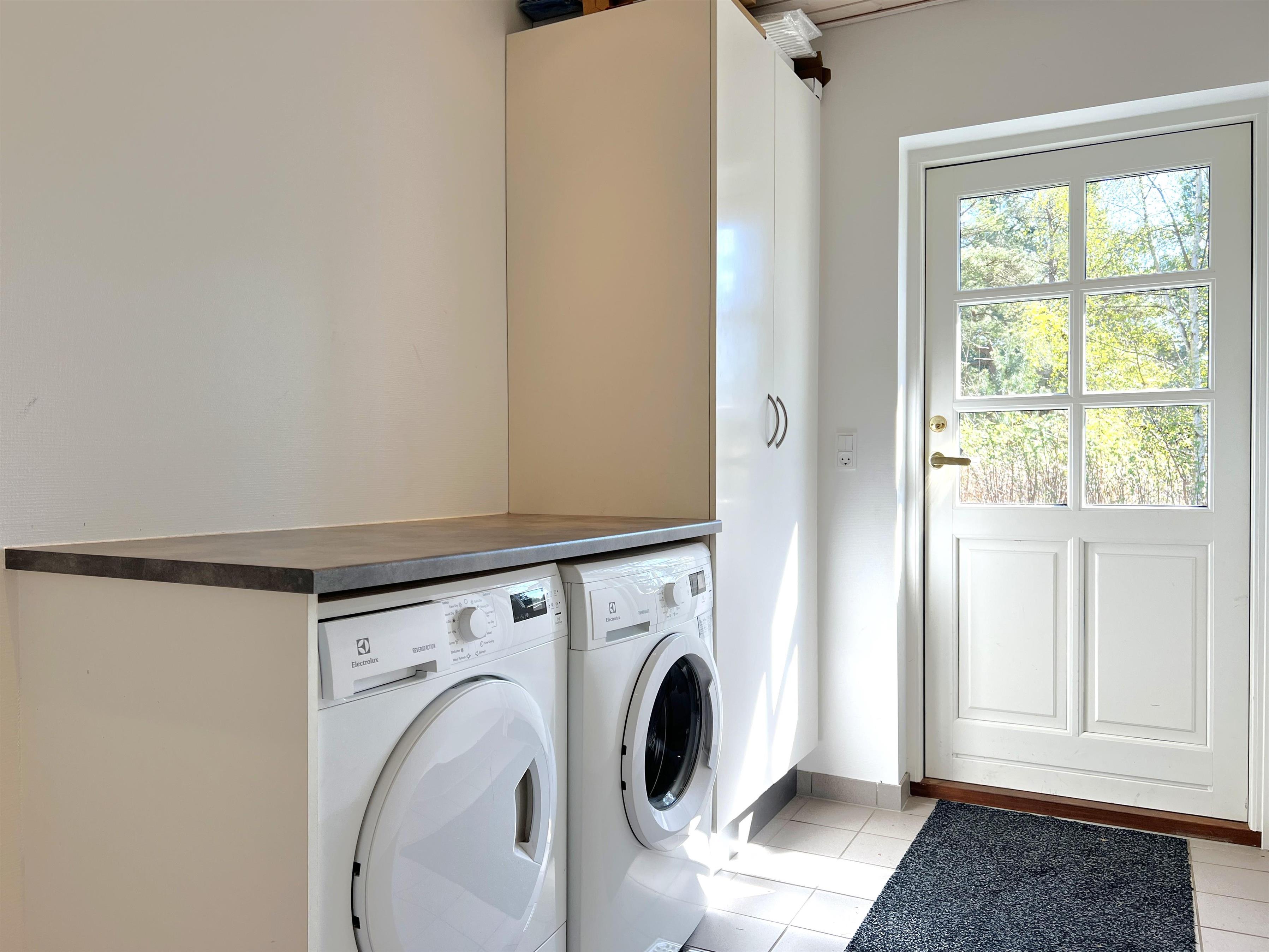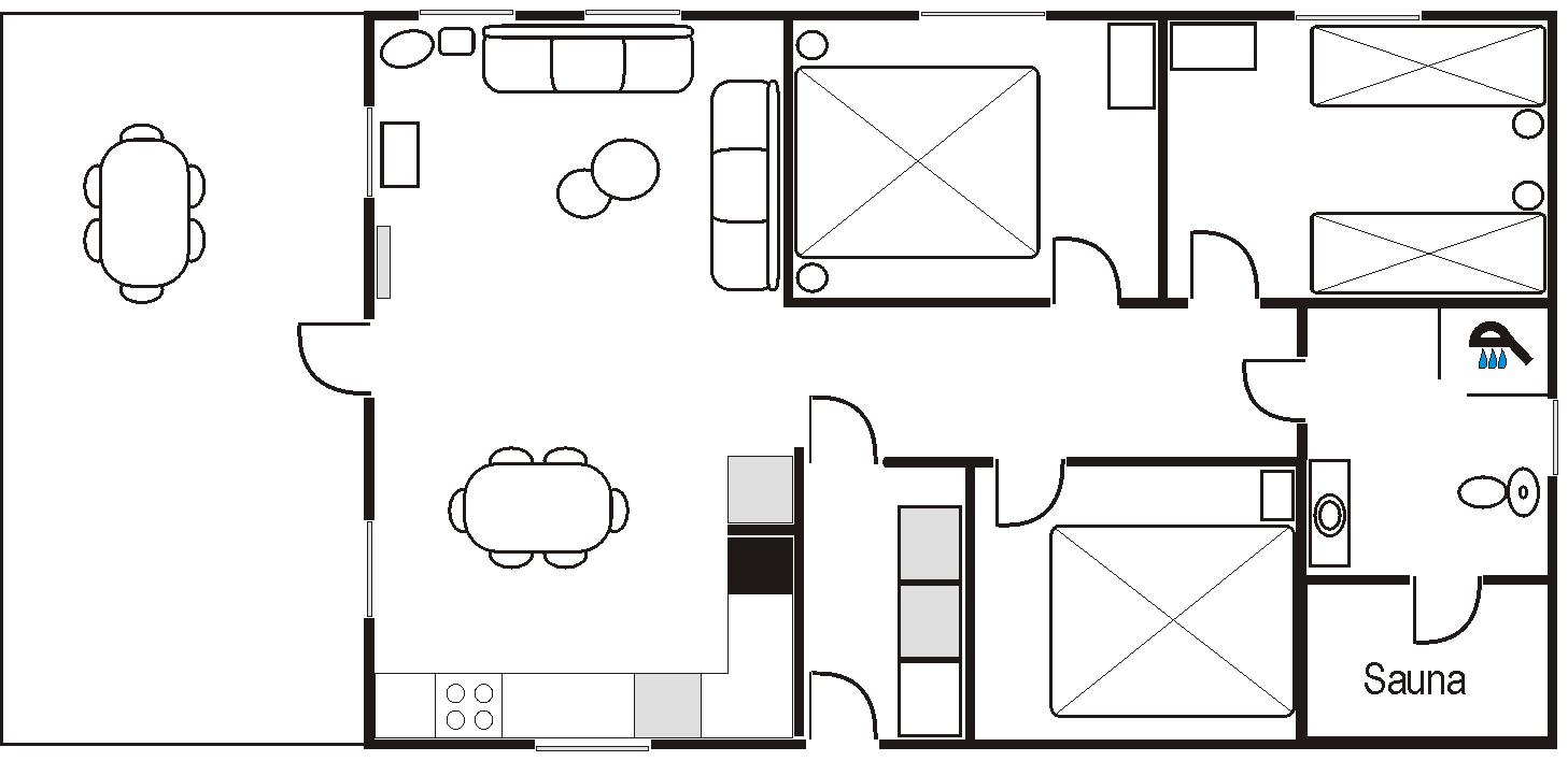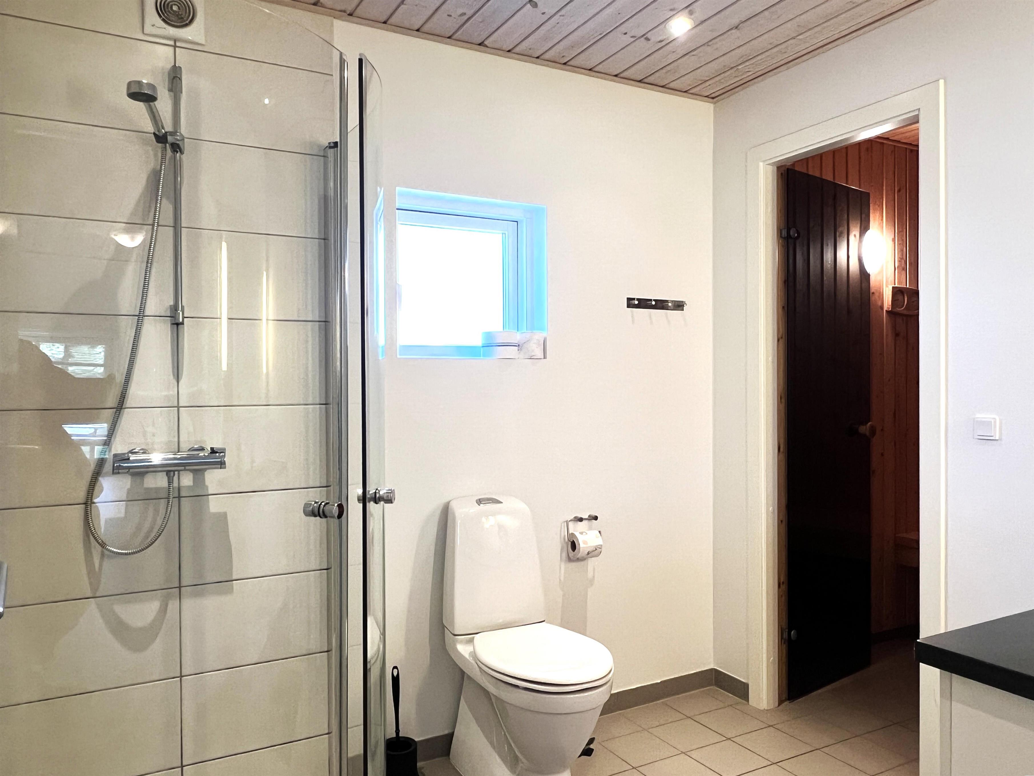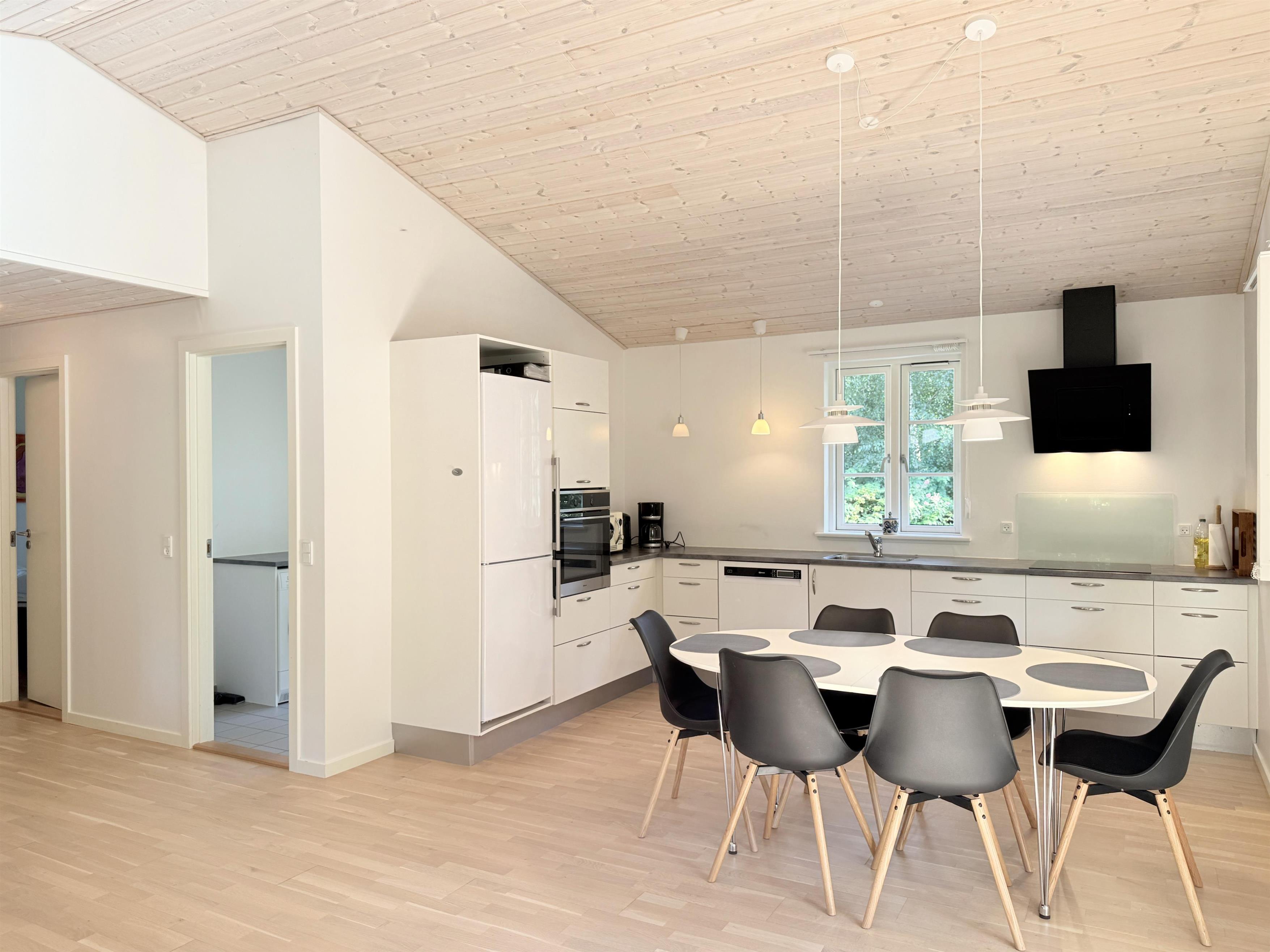 Det store feriehus fremstår lyst og rummeligt og med god plads til familien. Huset har et stort køkken-alrum med flot køkken, spiseplads og stue med TV. Der er tre gode soveværelser med behagelige dobbeltsenge i to af værelserne og to enkeltsenge i det tredje. Der er meget fin skabsplads i alle værelser. Lækkert badeværelse med brus og sauna. Fra stuen er der udgang til den skønne overdækkede træterrasse med havemøbler og solsenge, og her kan husets grill også benyttes. Her kan man finde mange solkroge, og terrassen vender mod det smukke naturområde, der gør at man fornemmer roen og naturen - ikke mindst på de skønne sommeraftener. Der er også en lille legeplads til børnene.