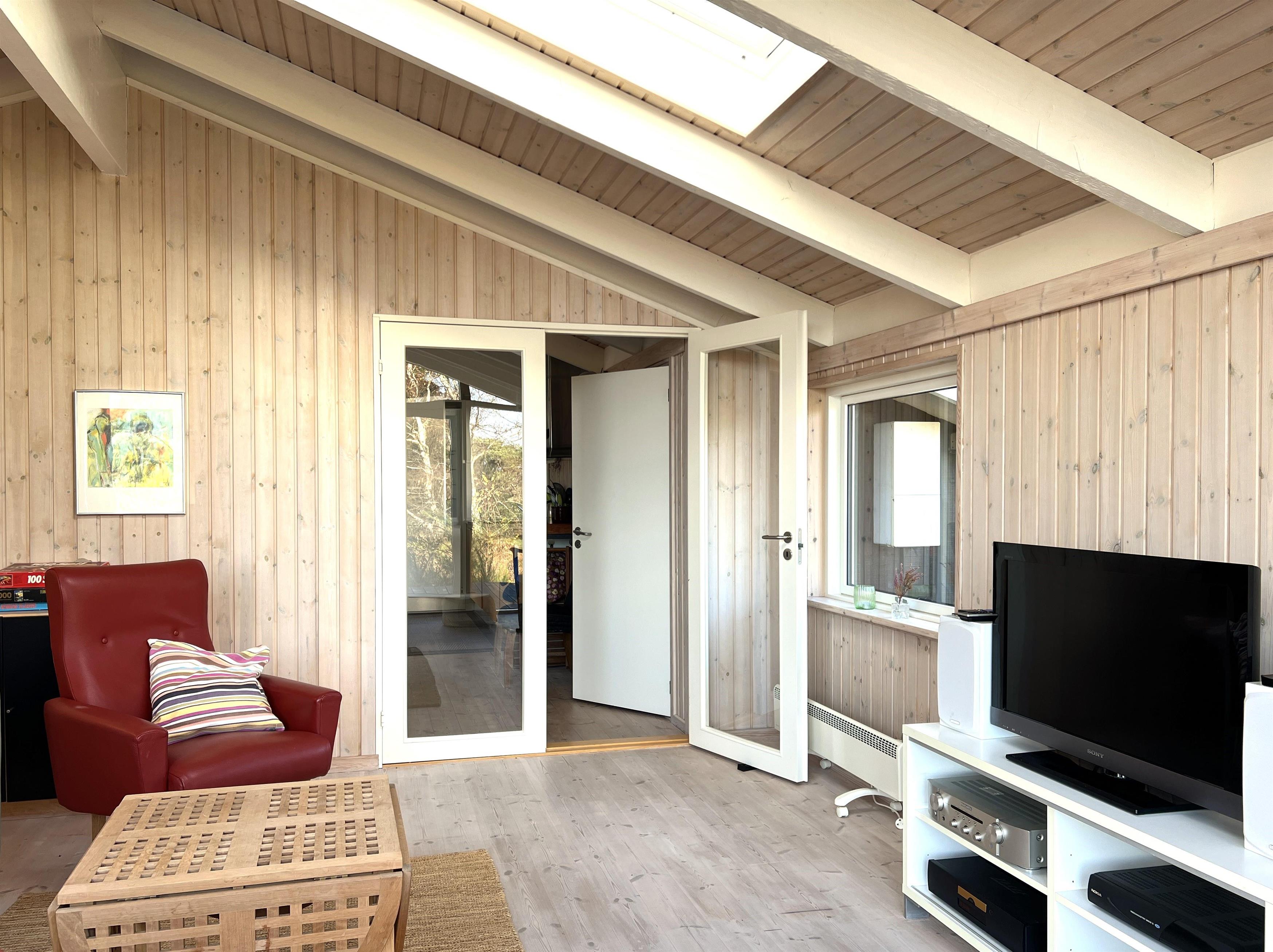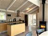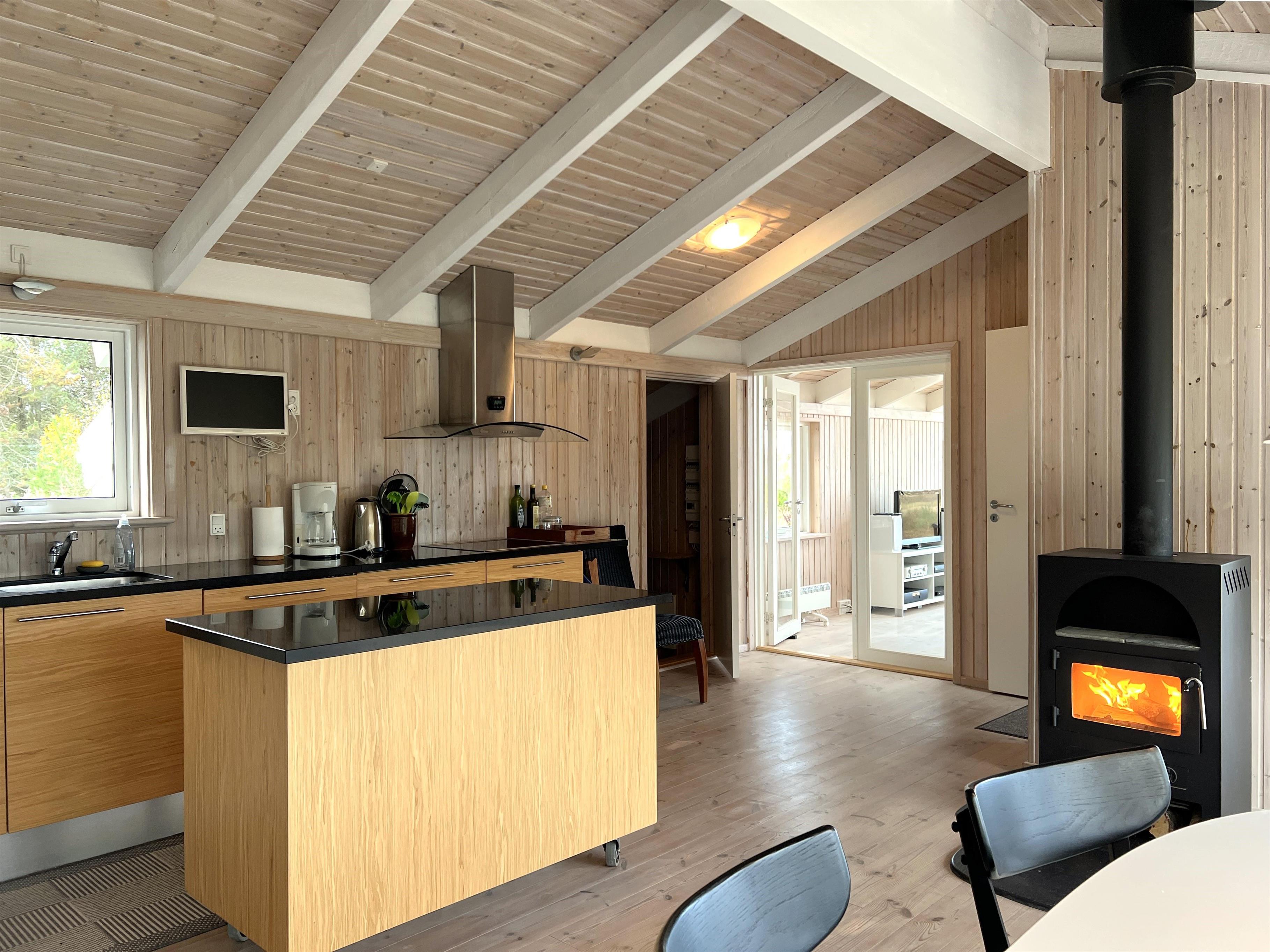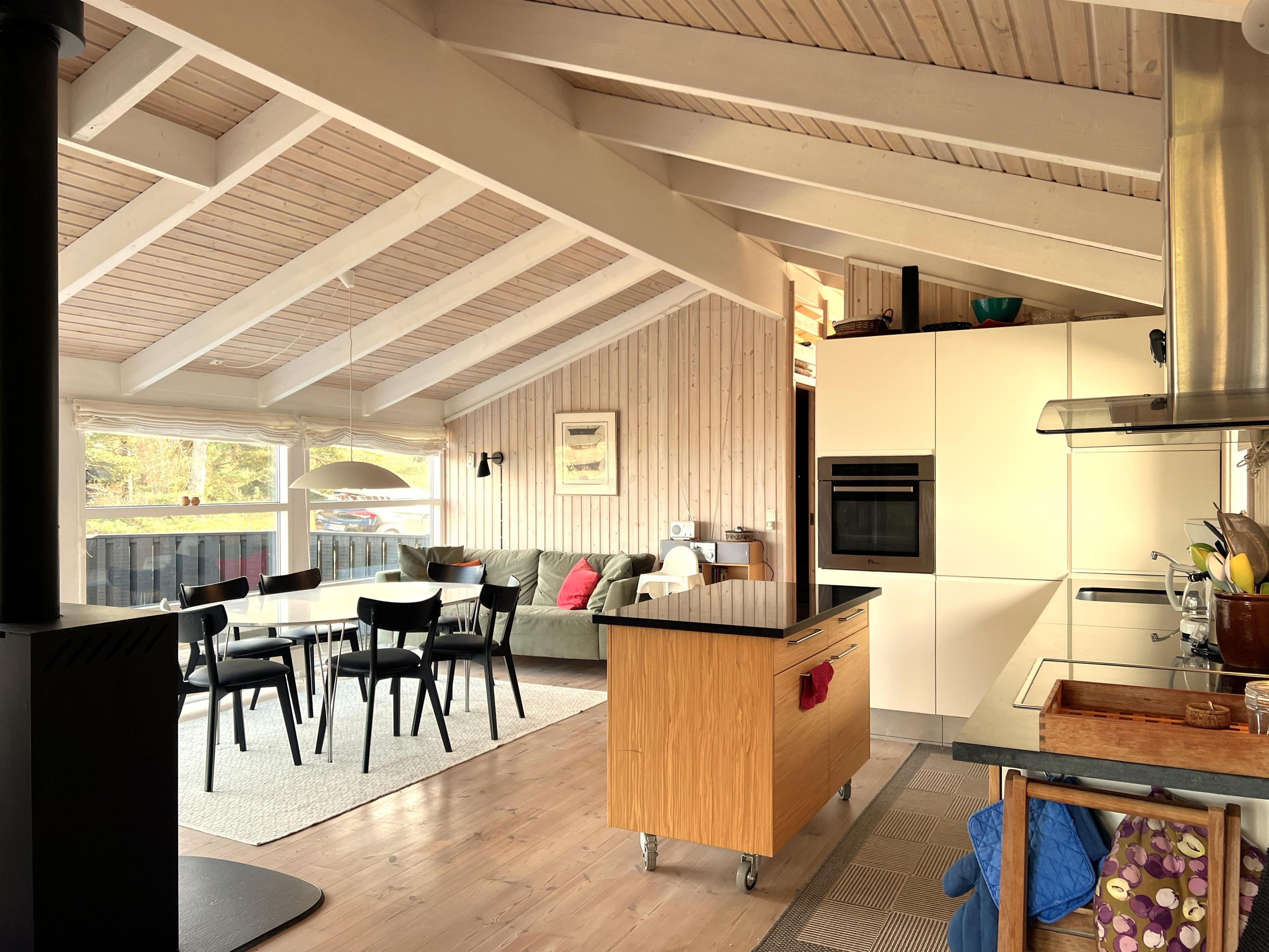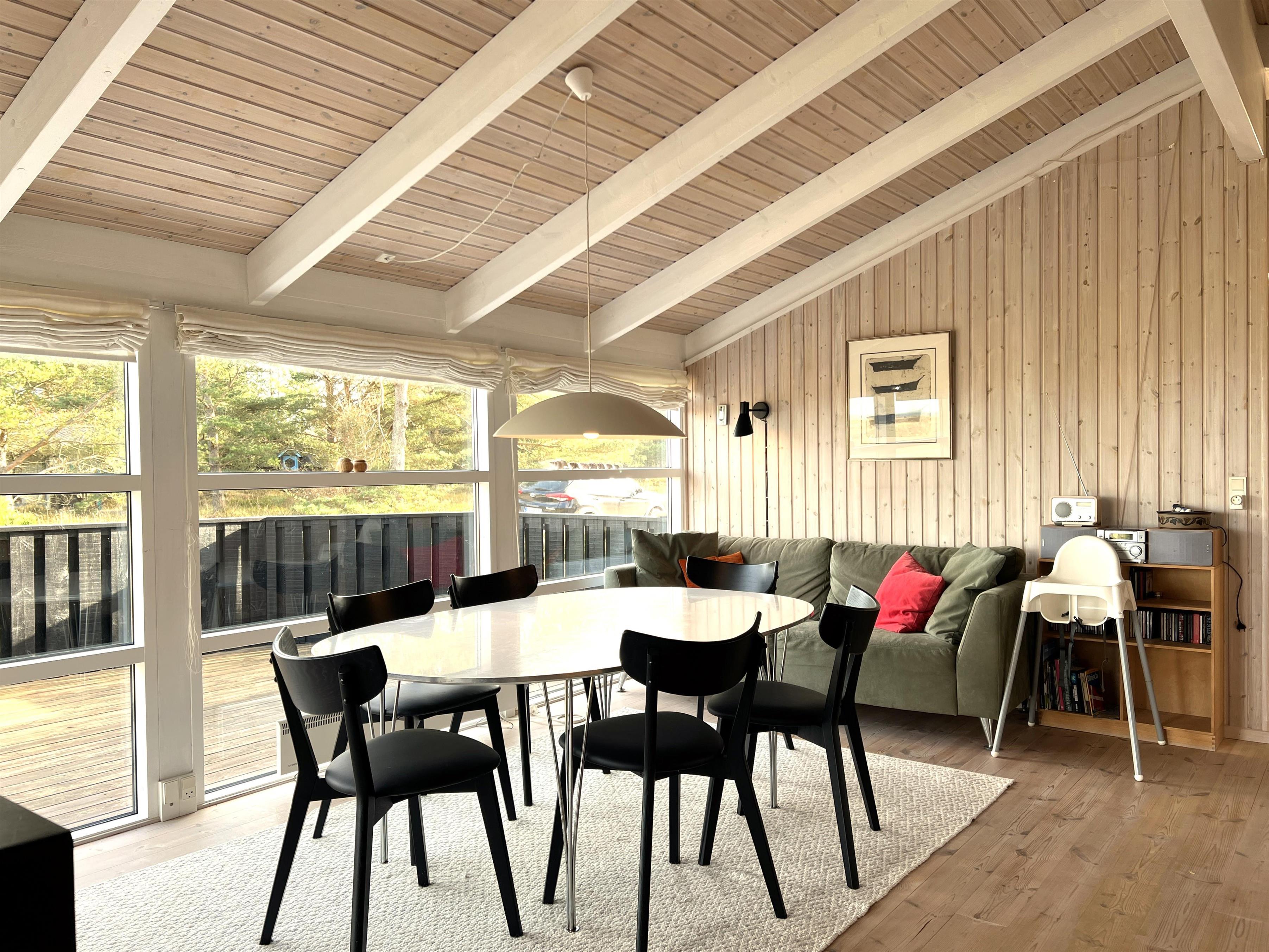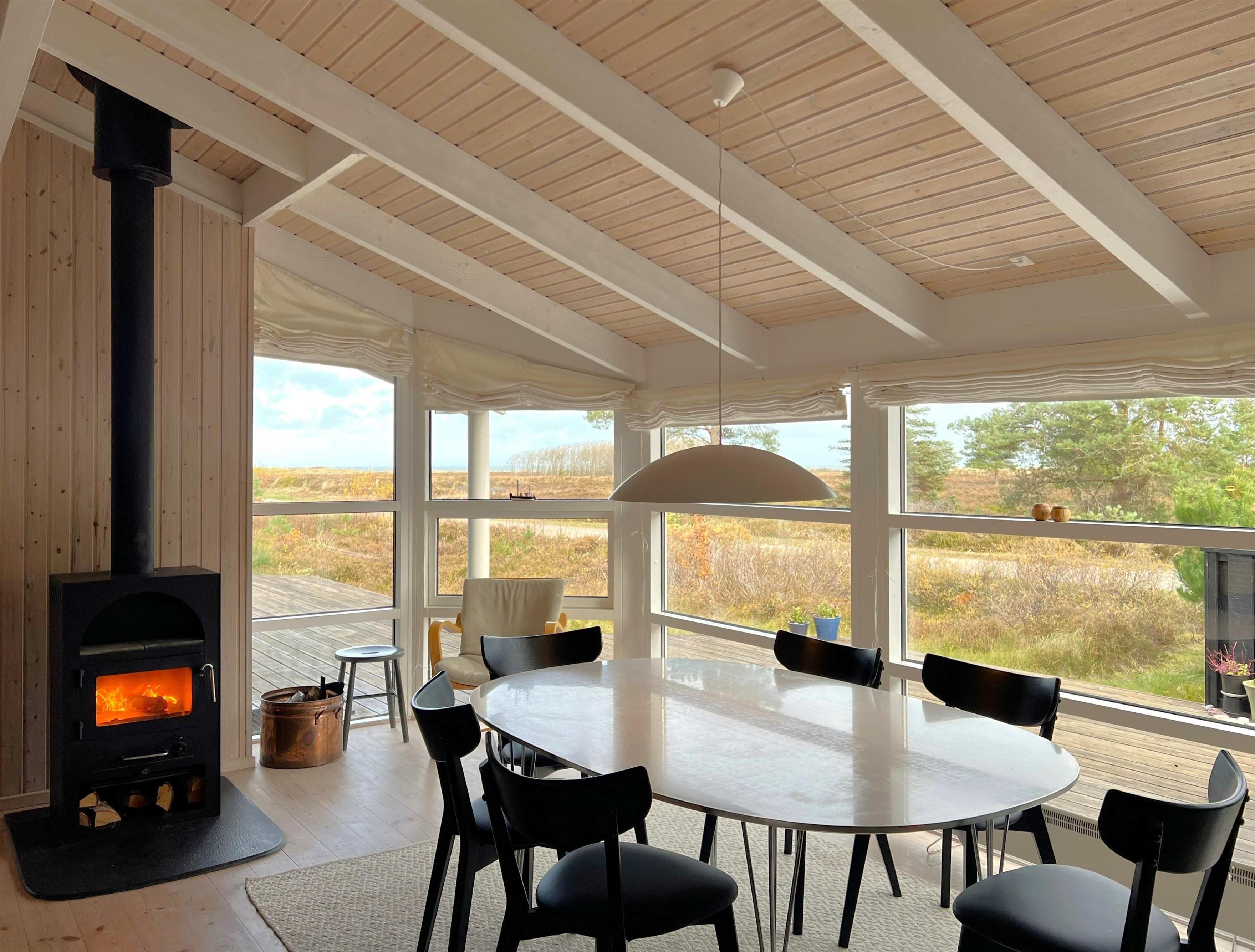 Selve huset indeholder et nyt, fint veludstyret køkken i åben forbindelse med spiseplads og brændeovn. Der er etableret en nyere, dejlig rummelig stue med store flotte vinduespartier, hvorfra udsigten til heden og havet virkelig kan nydes.