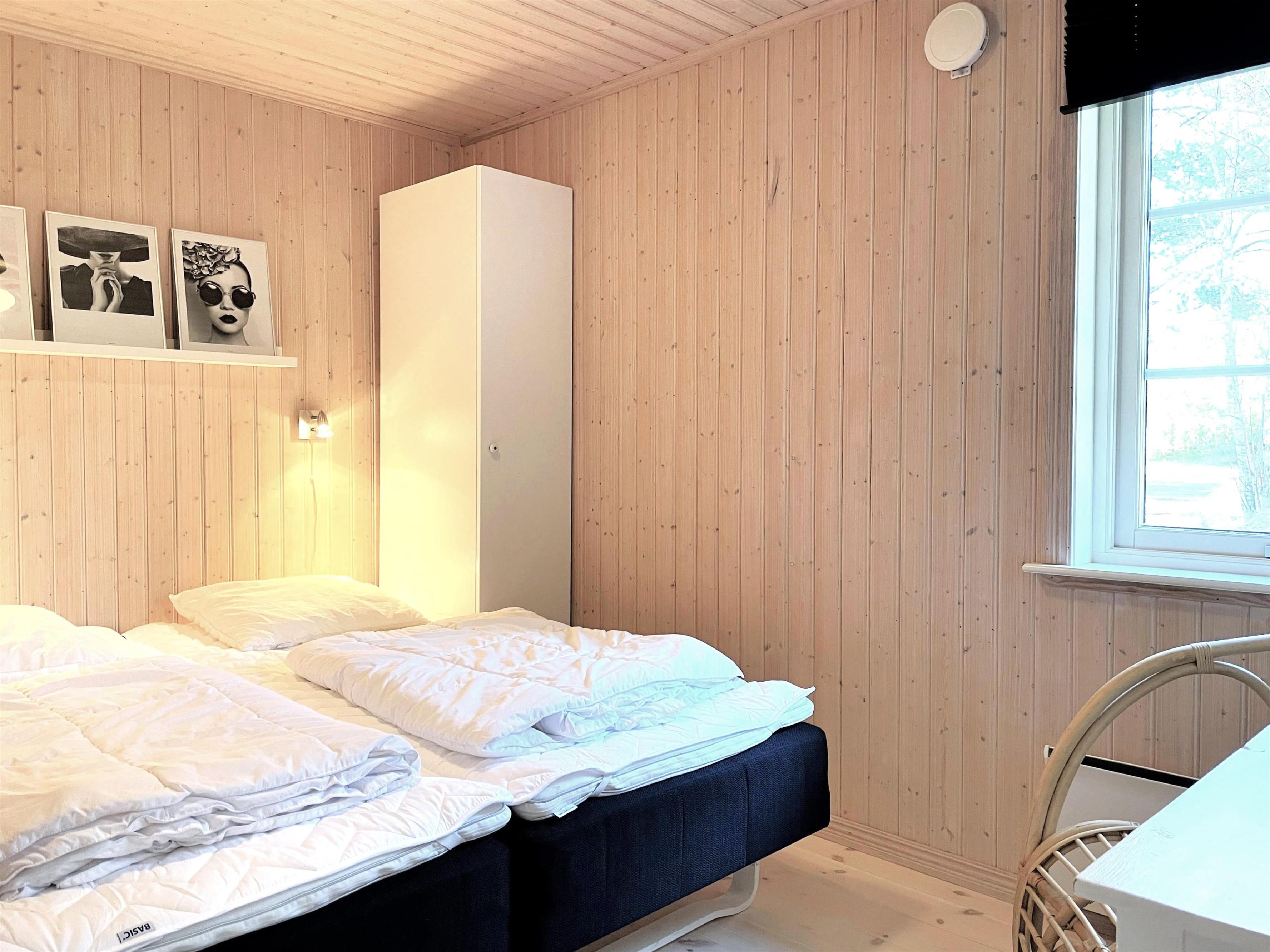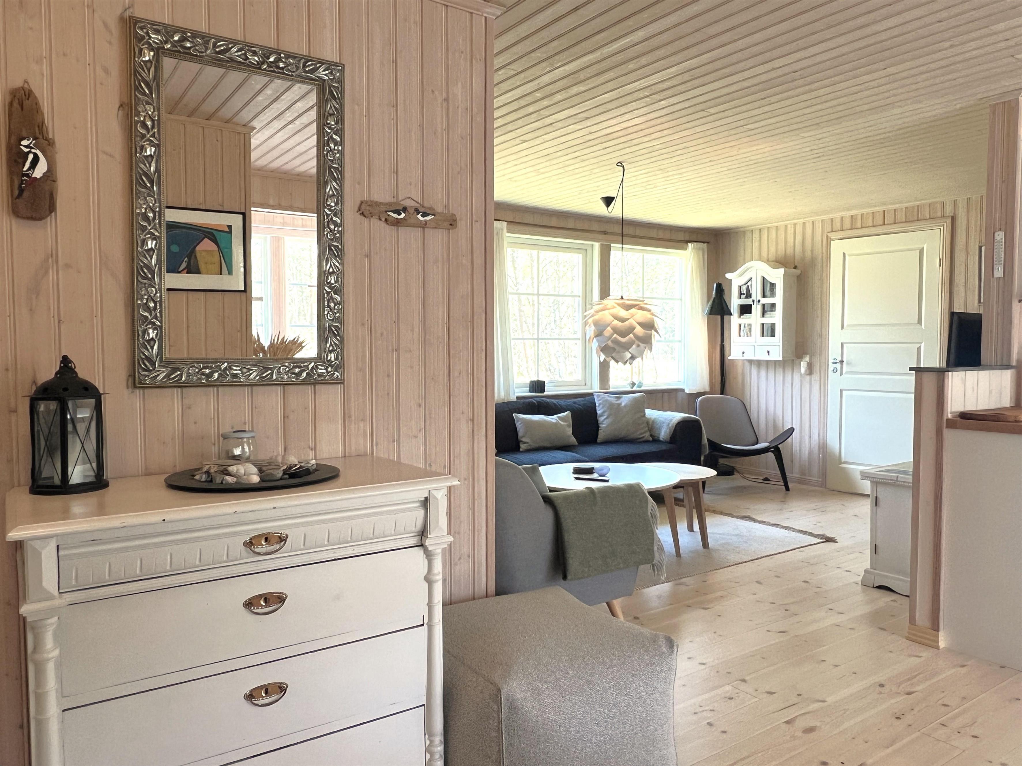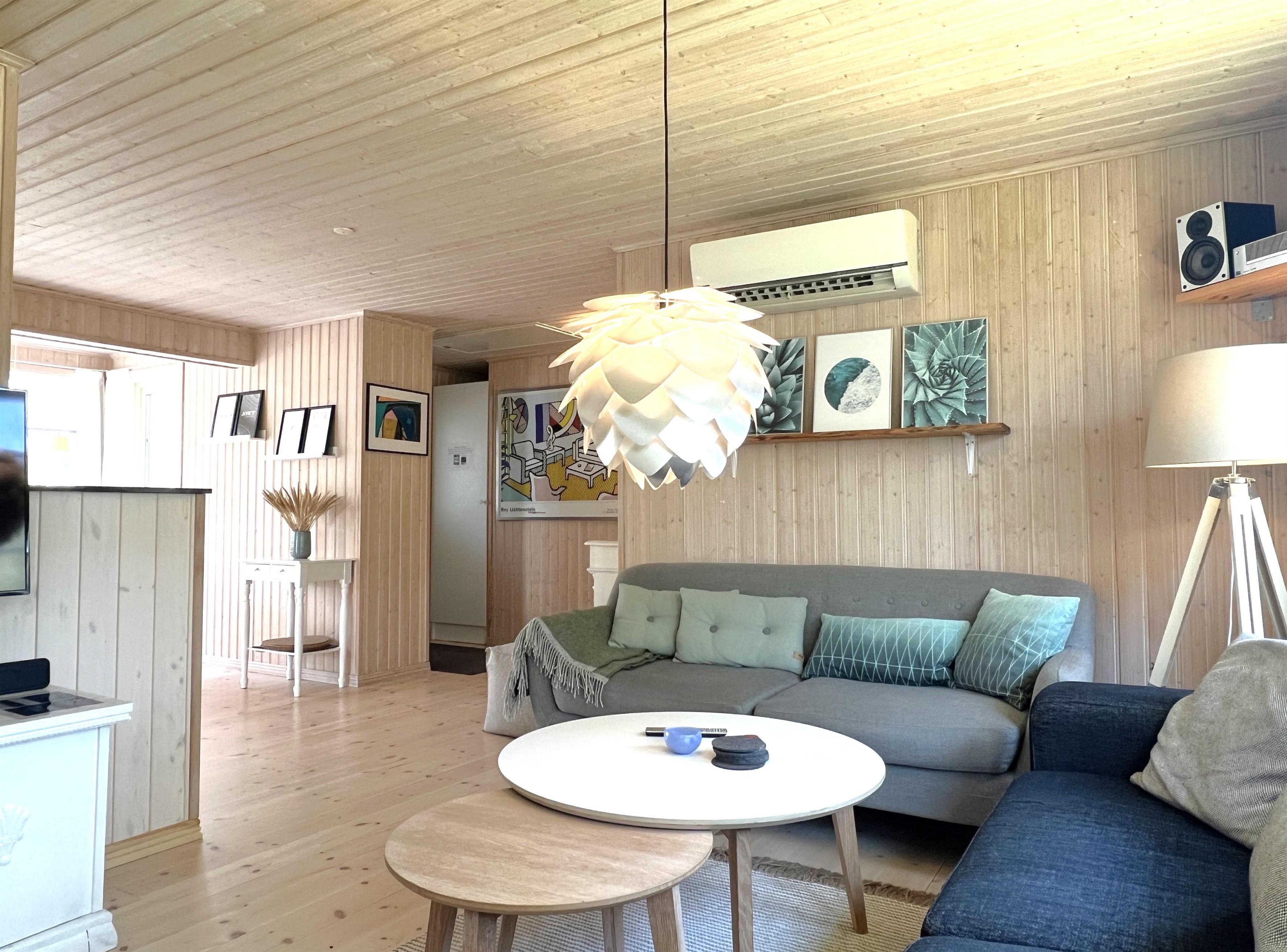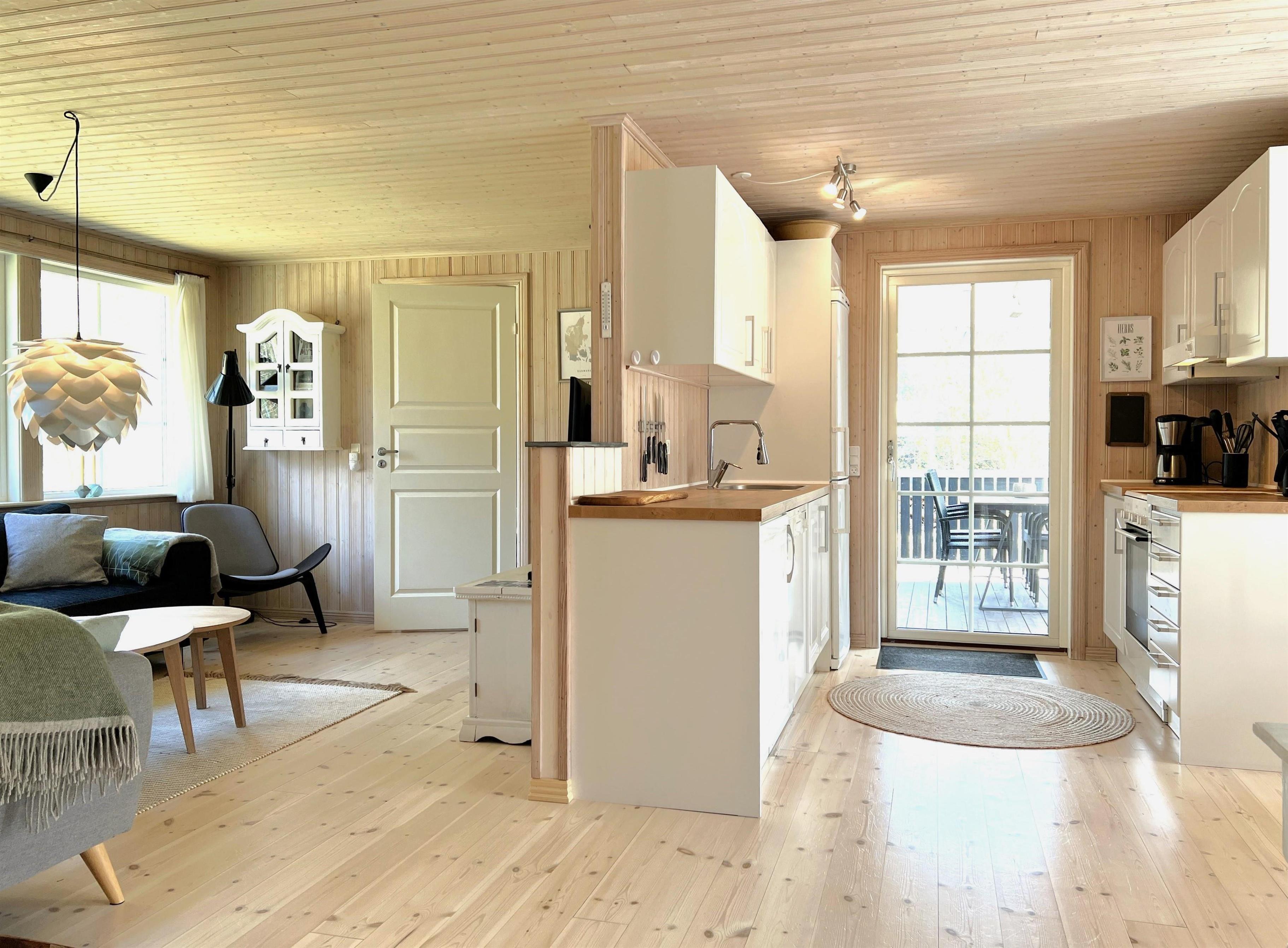 Huset har et dejligt stort fællesrum med et fint og veludstyret køkken, hvorfra der er udgang til overdækket træterrasse. I sammenhæng med køkkenet er der spiseplads og en hyggelig stue med brændeovn, behagelige møbler og smagfuld indretning. Der er tre soverum, henholdsvis to med dobbeltseng samt et med enkel/ køjeseng. Det ene soveværelse har desuden udgang til den overdækkede træterrasse. Rummeligt, flot badeværelse med marmorklinker og gulvvarme. Der er havemøbler, solsenge og gasgrill (inkl. gas) til fri afbenyttelse.