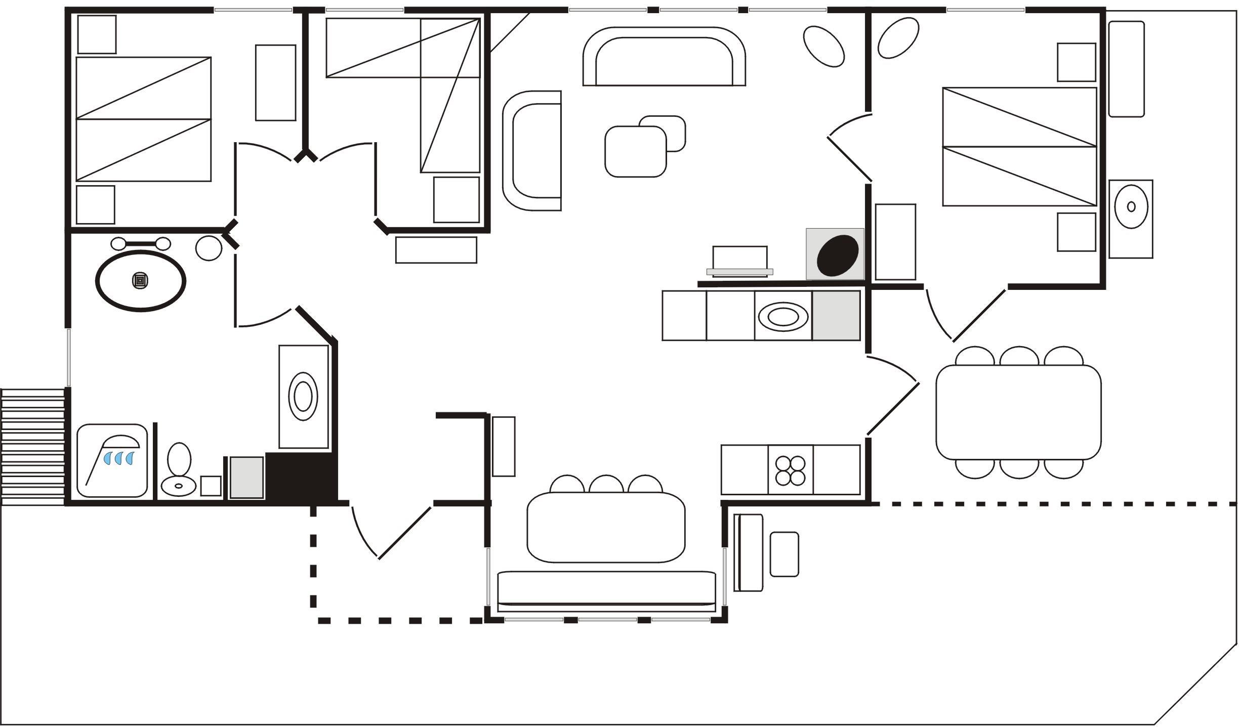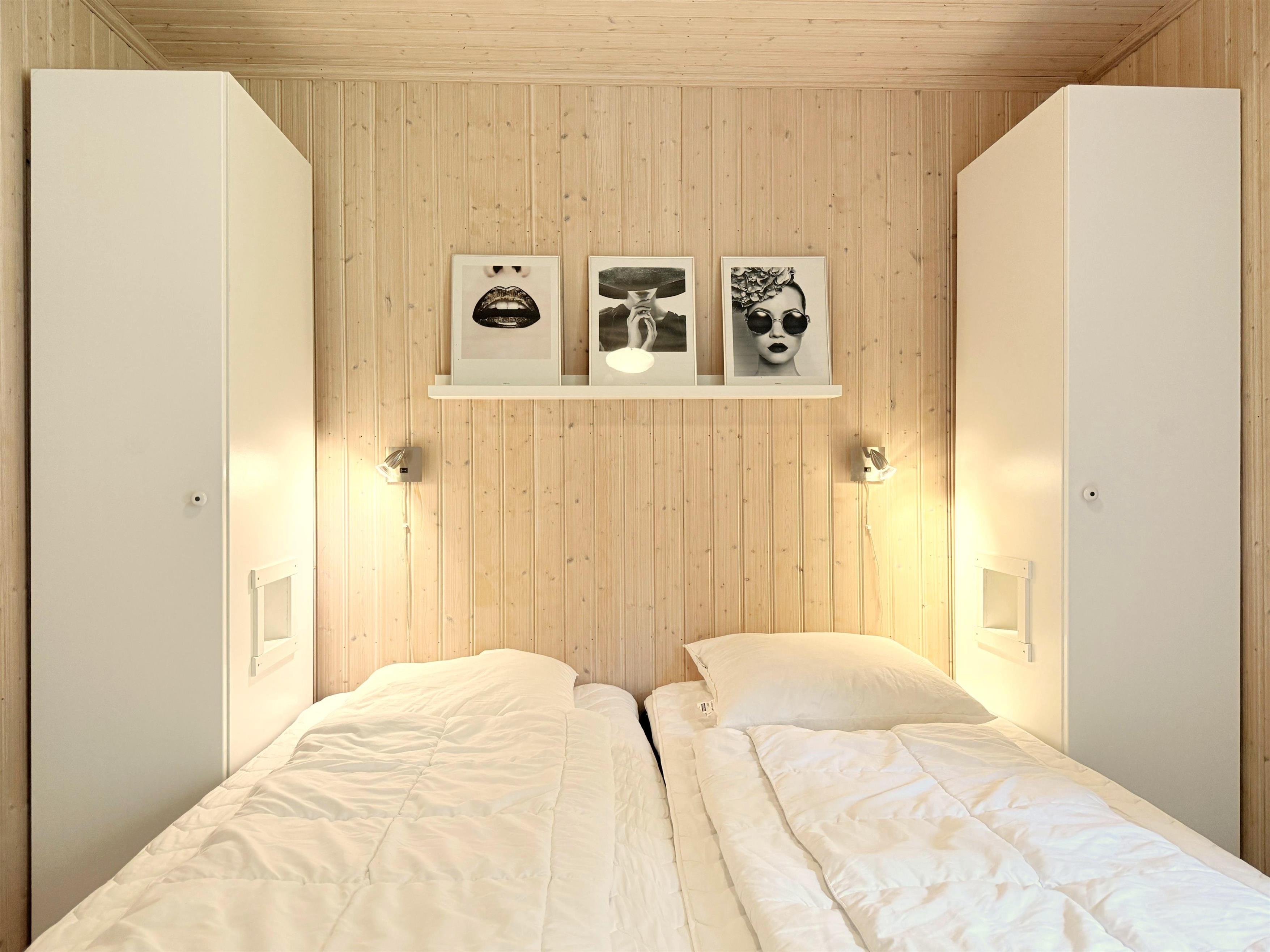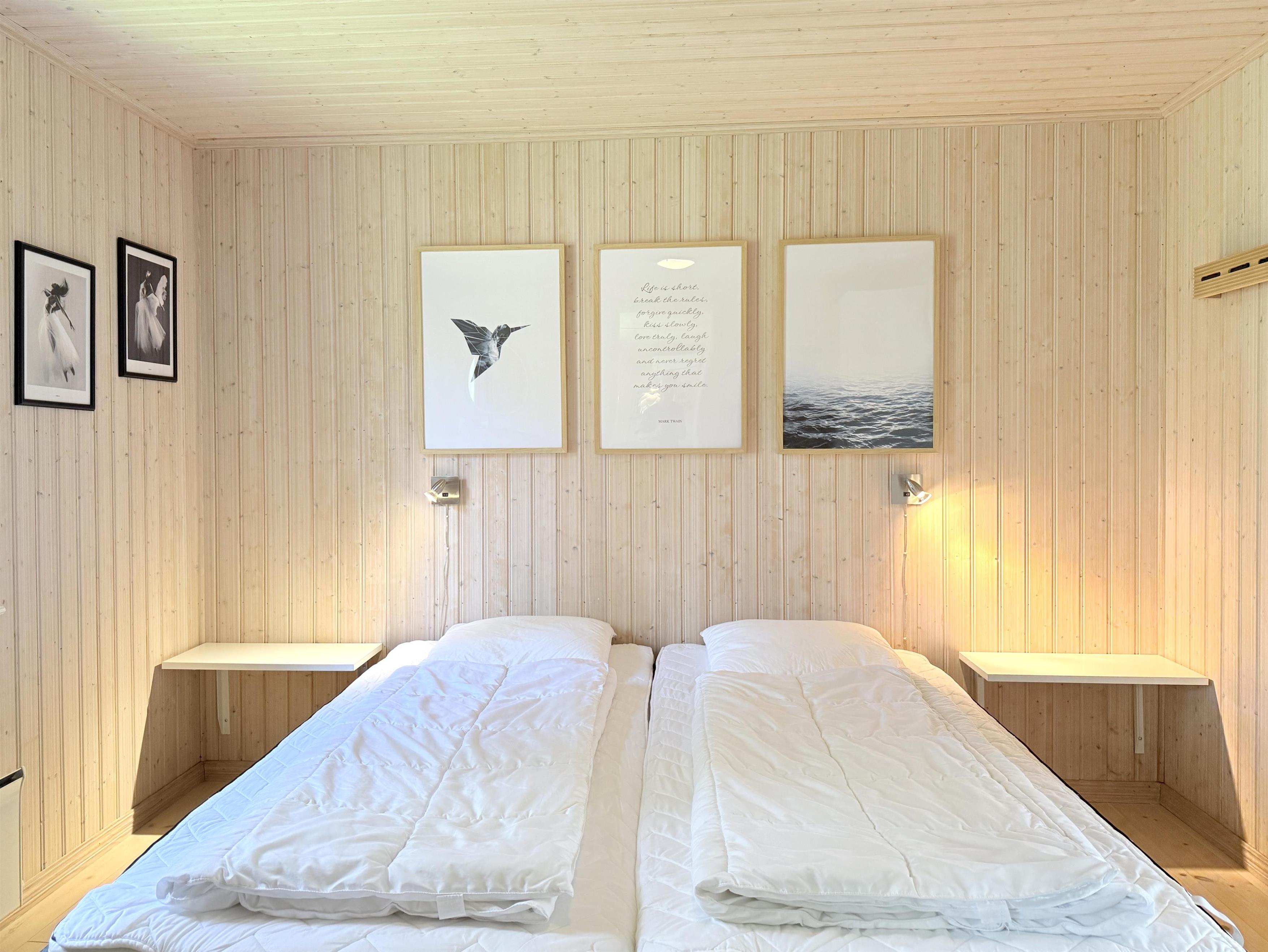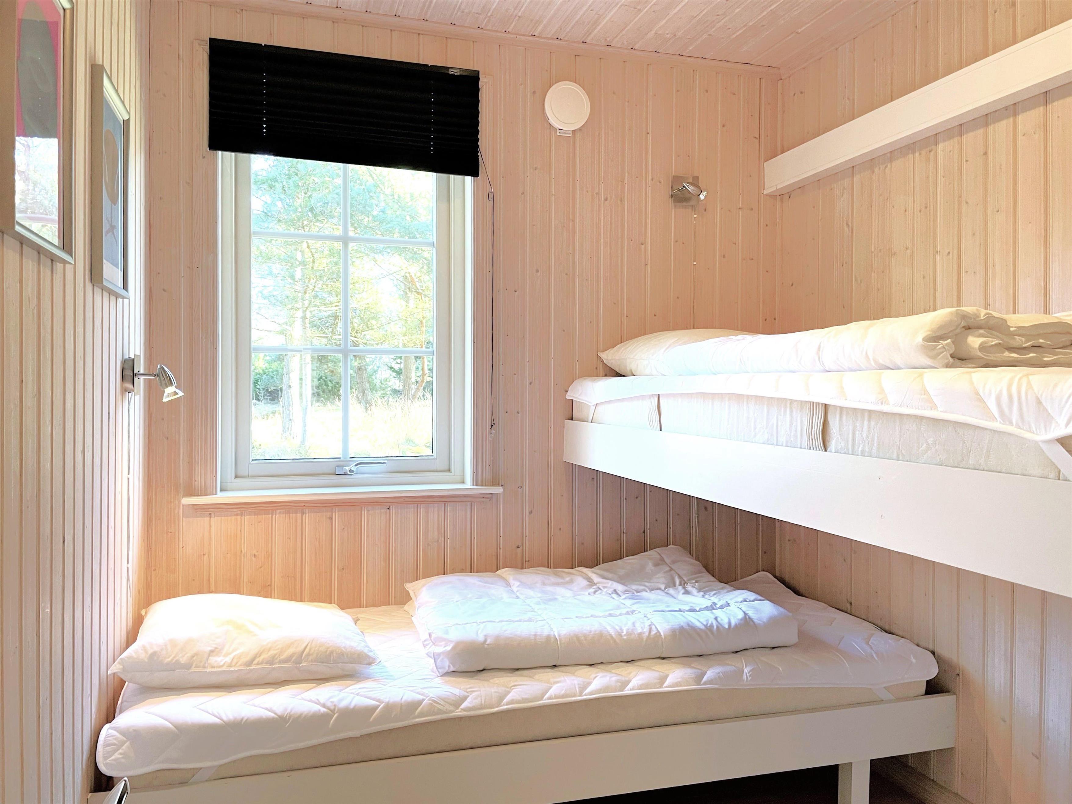Huset har et dejligt stort fællesrum med et fint og veludstyret køkken, hvorfra der er udgang til overdækket træterrasse. I sammenhæng med køkkenet er der spiseplads og en hyggelig stue med brændeovn, behagelige møbler og smagfuld indretning. Der er tre soverum, henholdsvis to med dobbeltseng samt et med enkel/ køjeseng. Det ene soveværelse har desuden udgang til den overdækkede træterrasse. Rummeligt, flot badeværelse med marmorklinker og gulvvarme. Der er havemøbler, solsenge og gasgrill (inkl. gas) til fri afbenyttelse.