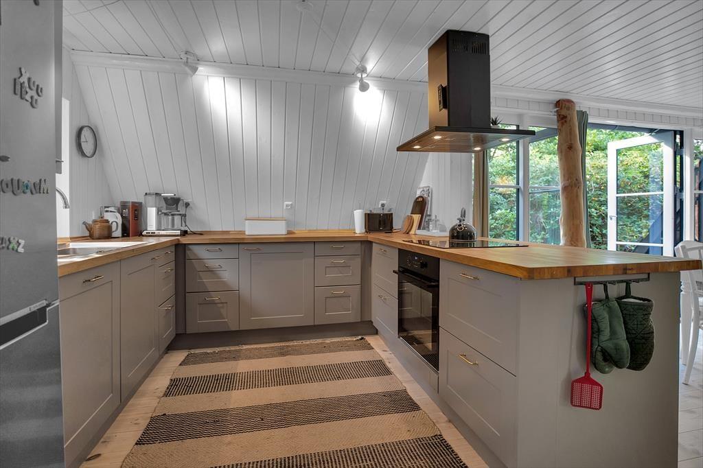 Huset, der er i 2 etager, indeholder i stueplan kombineret spise- og opholdsstue med brændeovn og varmepumpe samt lækkert køkken med opvaskemaskine. Der er udgang til stor flot træterrasse med udsigt til den hyggelige have hvor rådyrene krydser jævnligt.Derudover er der i stueplan badeværelse med brus. På 1. sal er 3 soveværelser, alle med dobbeltsenge samt 1 sovesofa til 2 i det ene. NB! Trappen til 1. sal er lidt stejl.
