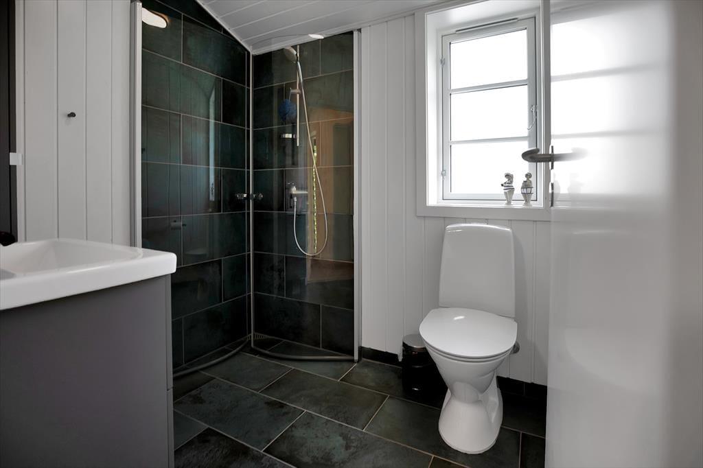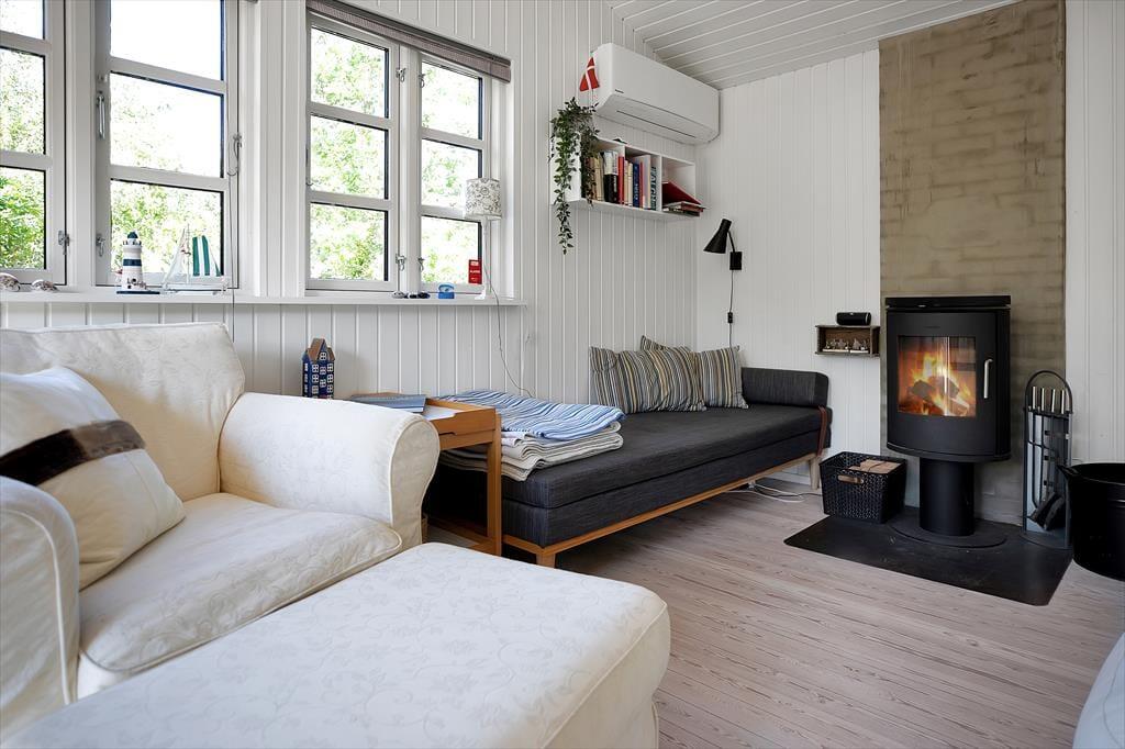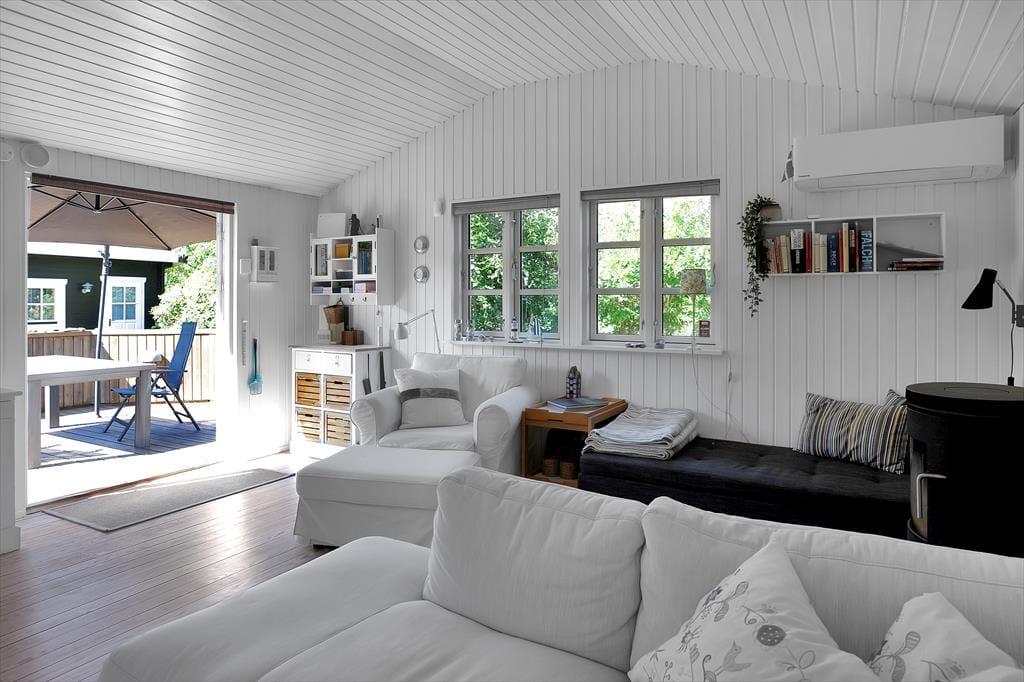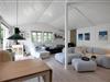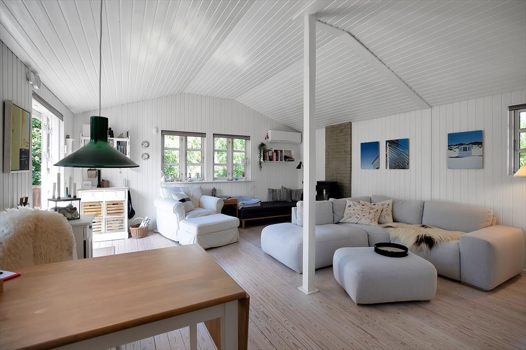 Sommerhus tæt på strand med udebruser og stor terrasse.