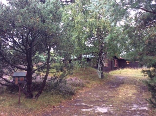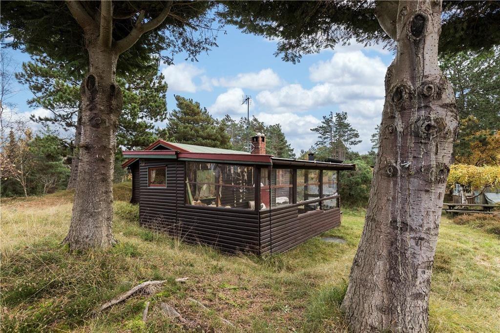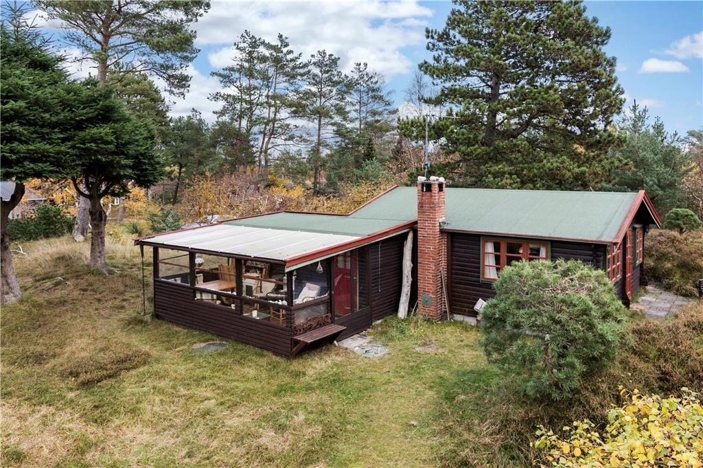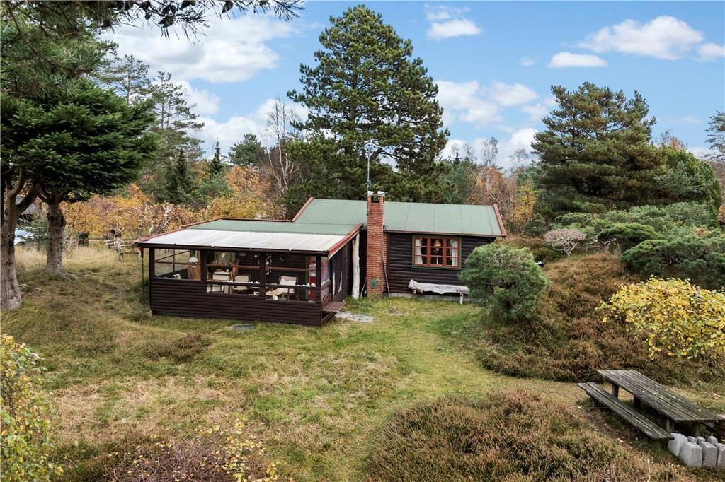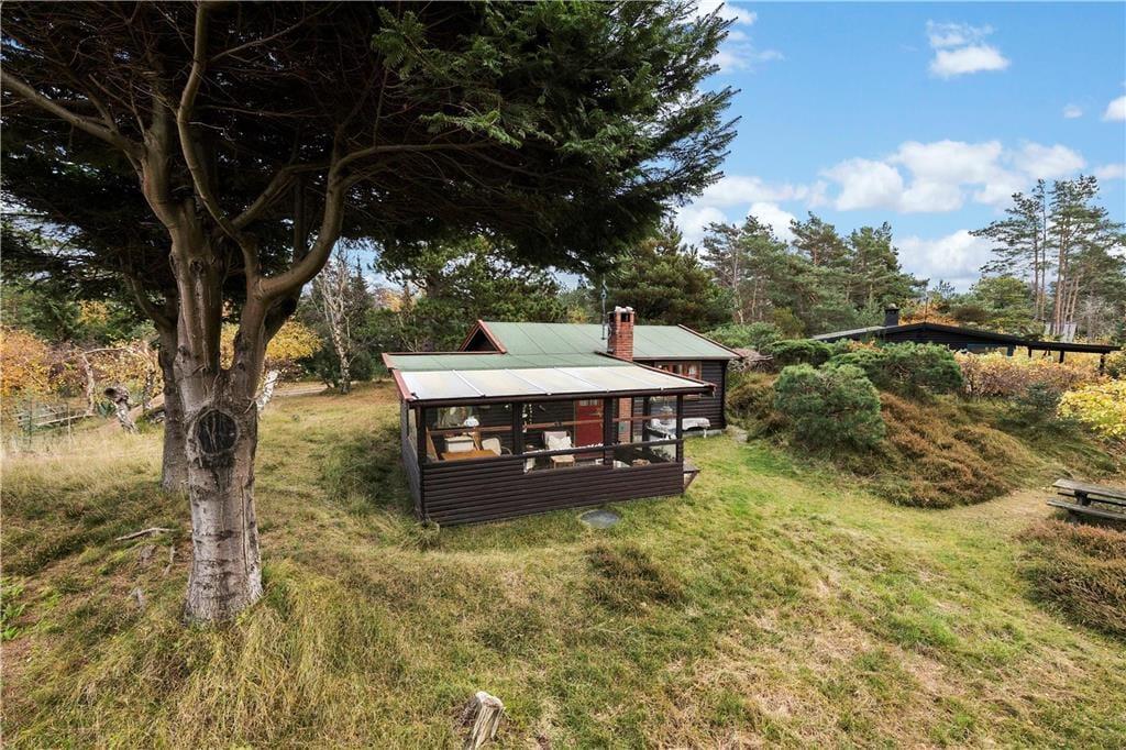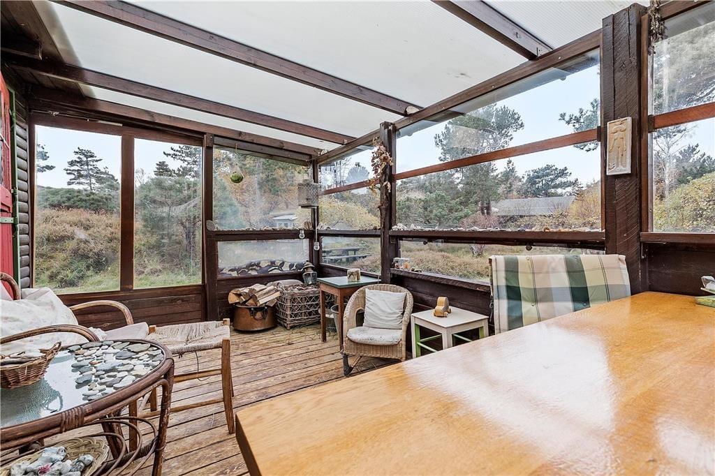 Bjælkehuset har en overdækket terrasse, nærmest en havestue, hvor du kan sidde med en kop kaffe og kigge ud på den mest fantastiske naturgrund med lyng og små stier, kigge på stjernehimlen eller lytte til bølgerne skvulpe.