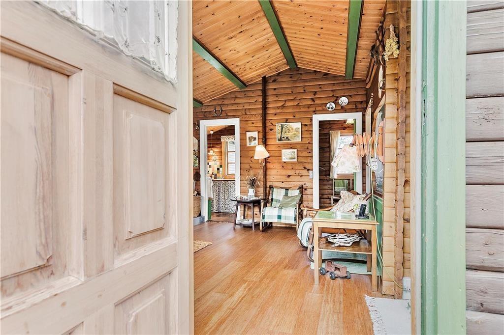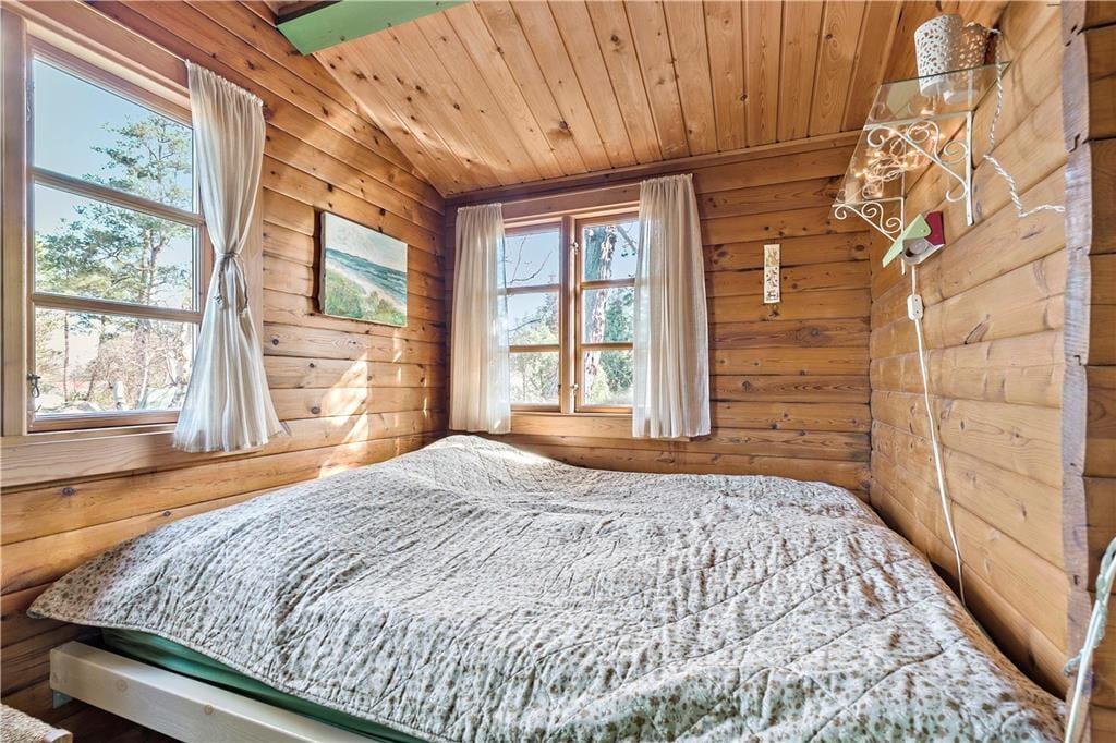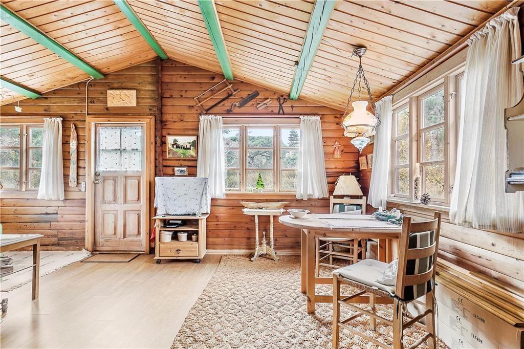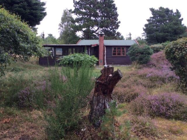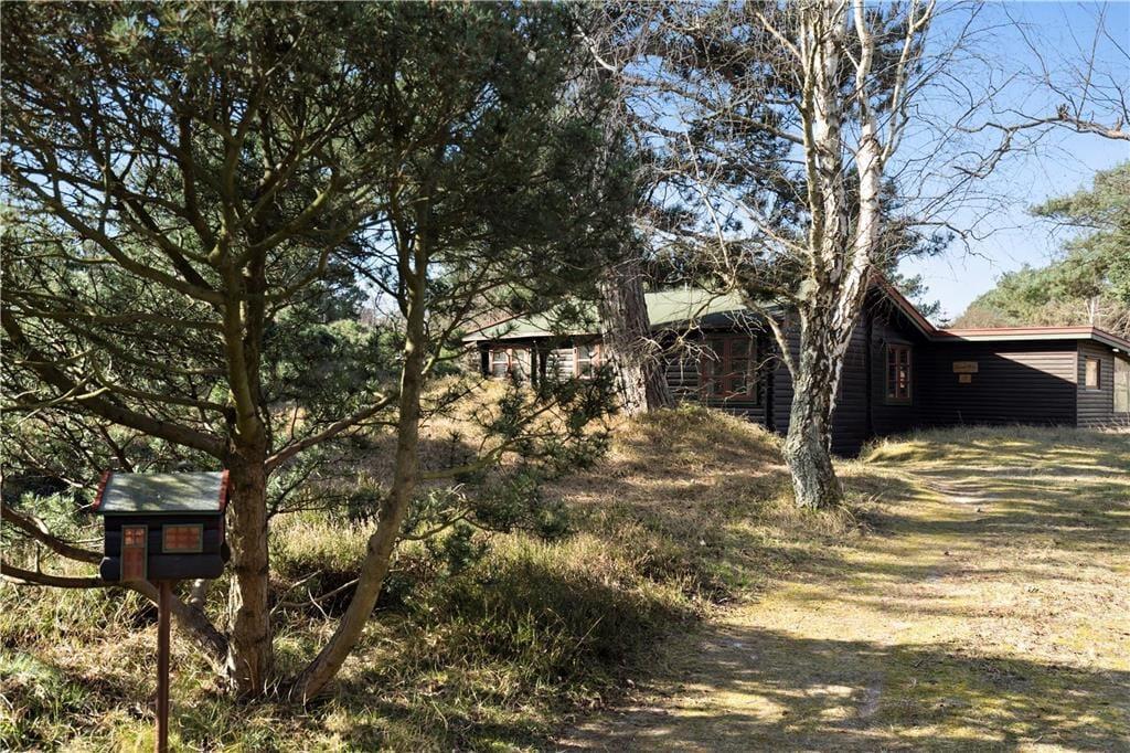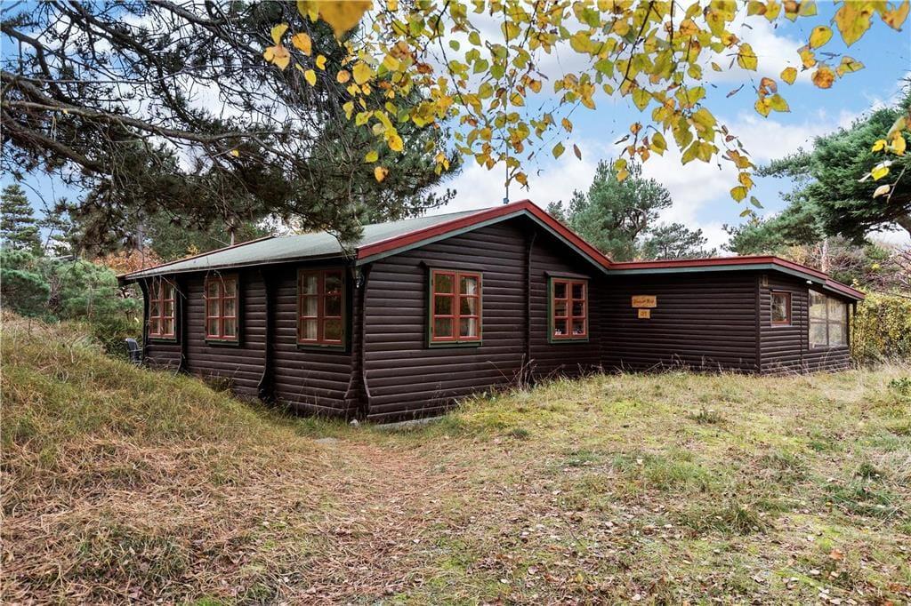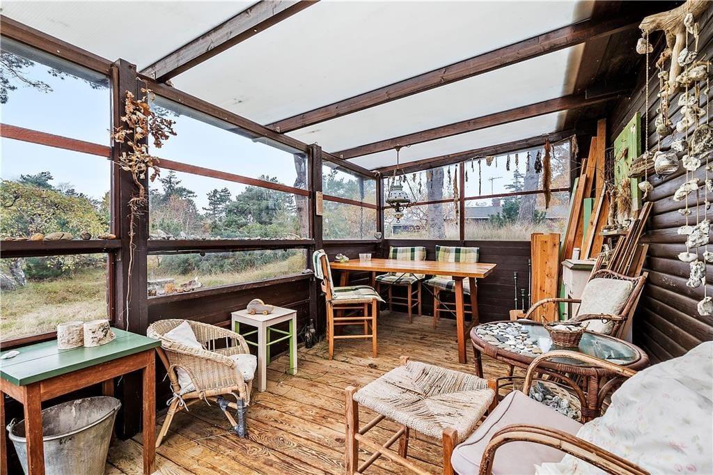 Bjælkehuset har en overdækket terrasse, nærmest en havestue, hvor du kan sidde med en kop kaffe og kigge ud på den mest fantastiske naturgrund med lyng og små stier, kigge på stjernehimlen eller lytte til bølgerne skvulpe.