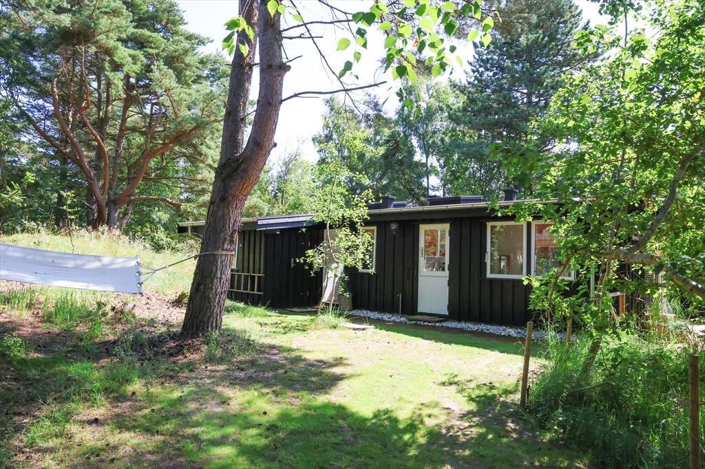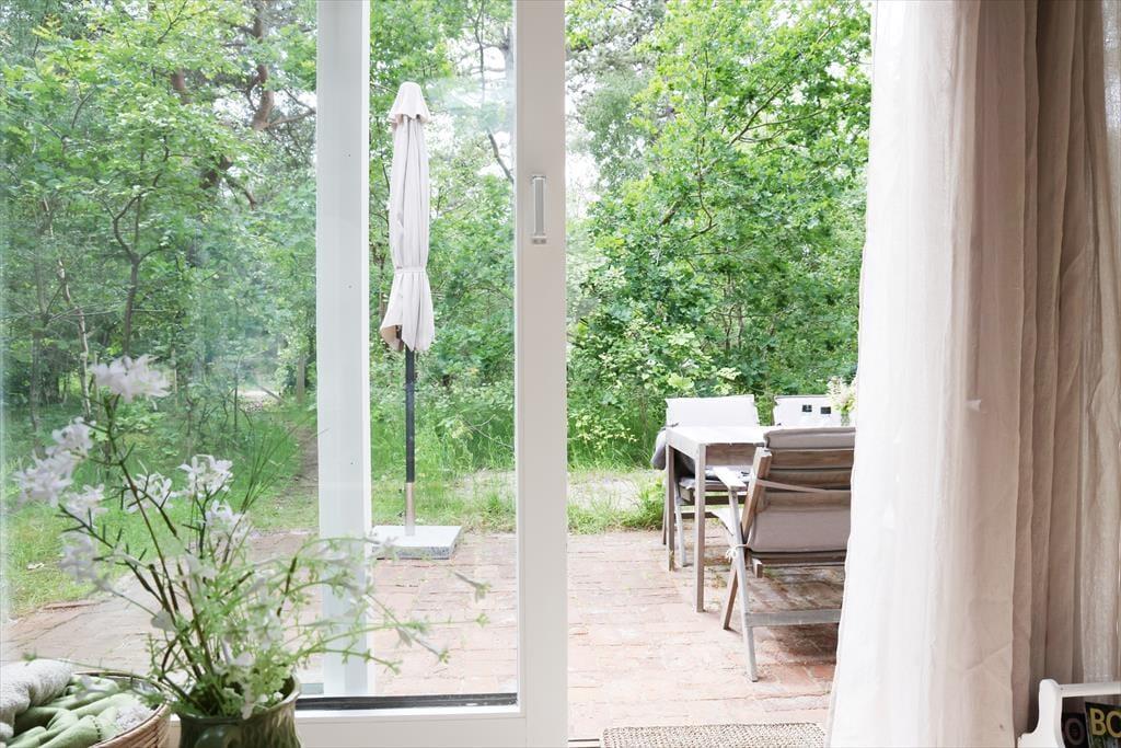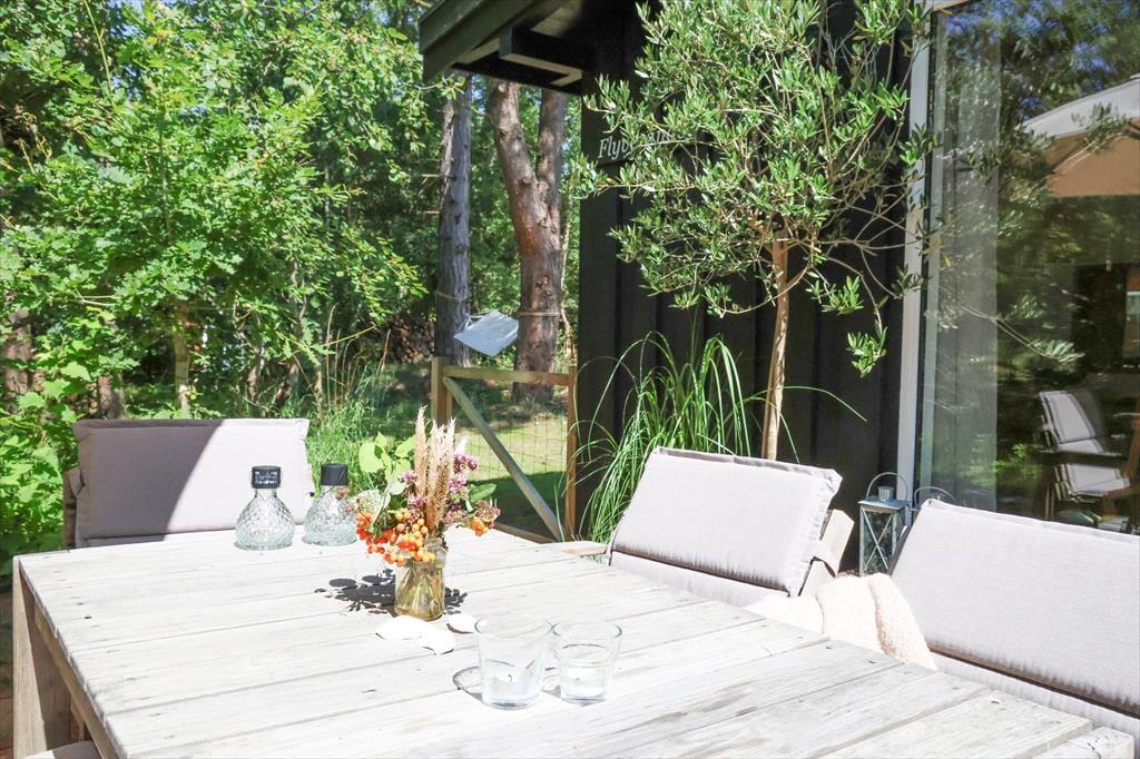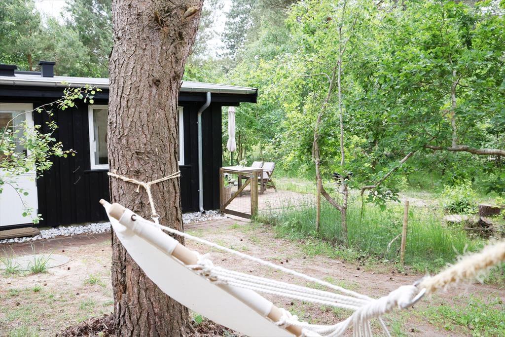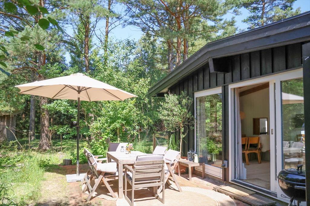 Sommerhuset er beliggende i et roligt område, så der er rig mulighed for at sidde i ro og mag og nyde en god frokost på terrassen. Den store terrasse med udgang fra stuen er sydvest-vendt så kommer masser af sol eftermiddag og aften. Udendørs kan timerne gå for børnene med at klatre i træer, lege gemmer eller fanger, og når det bliver tid til en dukkert, så er den rigtig gode sandstrand kun få minutters gang fra huset.