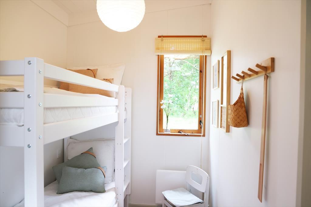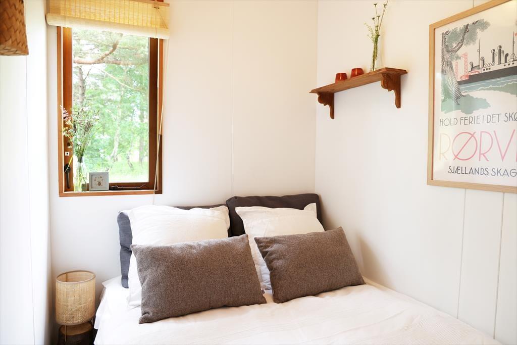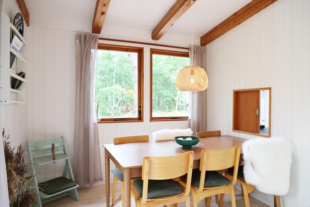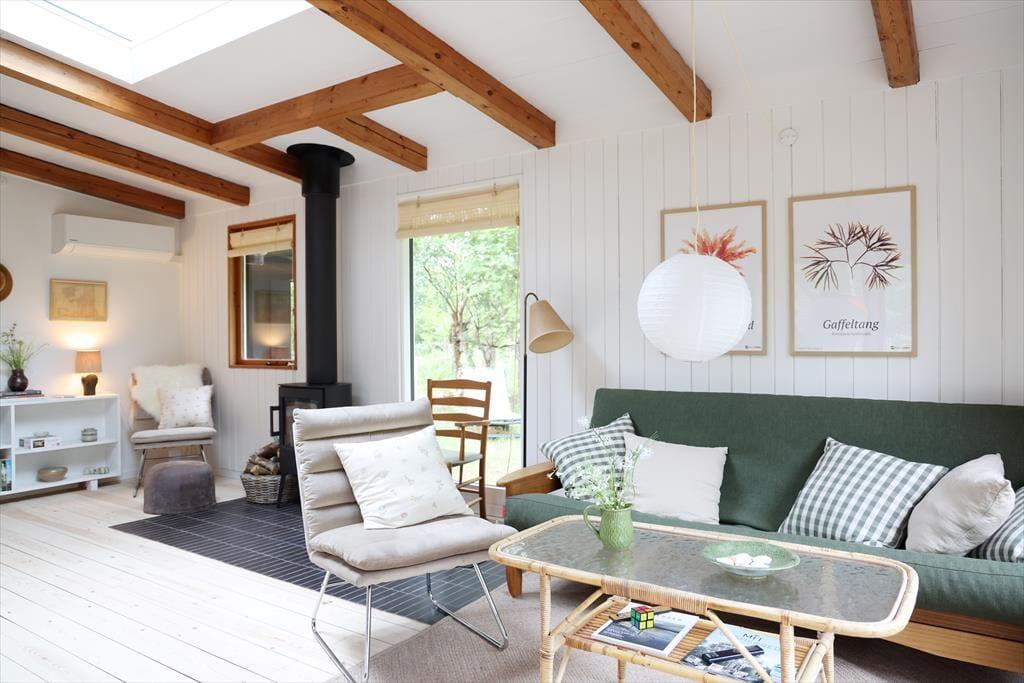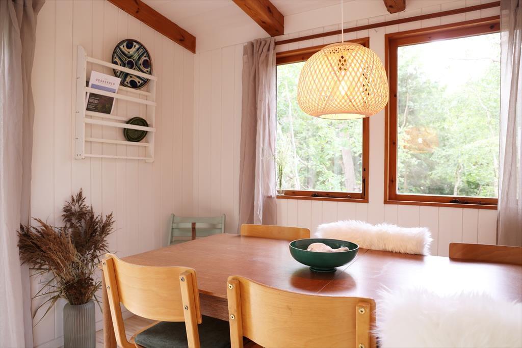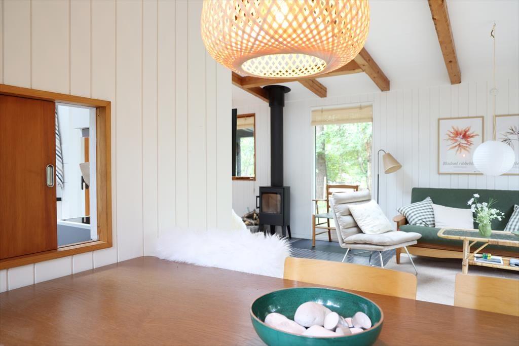 Sommerhuset har i 2024 gennemgået en større renovering og fremstår lyst og indbydende. De mange vinduer giver masser af lysindfald og udsyn fra huset og ud til den skønne naturgrund. Sommerhusets hjerterum er opholdsstuen og spisestuen i et, hvor mange gode stunder kan nydes med en god middag, eller med en god bog i sofaen imens der lyttes til at brændeovnen knitrer. I huset er der 2 gode værelser, det ene kan benyttes som familieværelse med køjeseng og en skydedør imellem ind til dobbeltsengen. I husets andet store soveværelse kan du ligge i sengen og vågne op med udsigten til den skønne naturgrund.