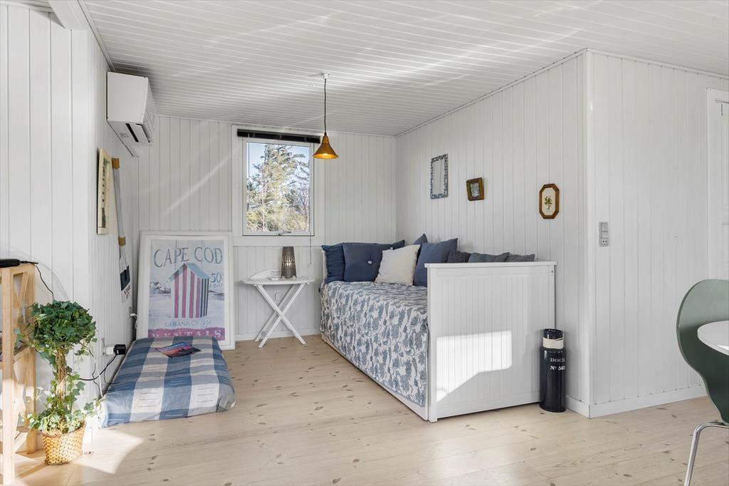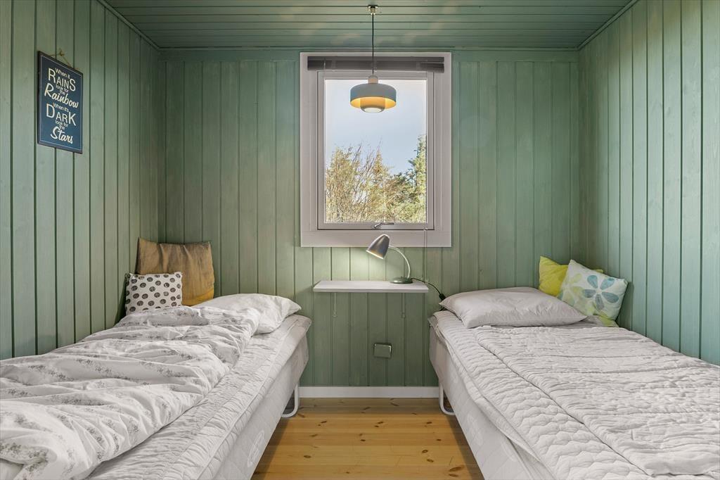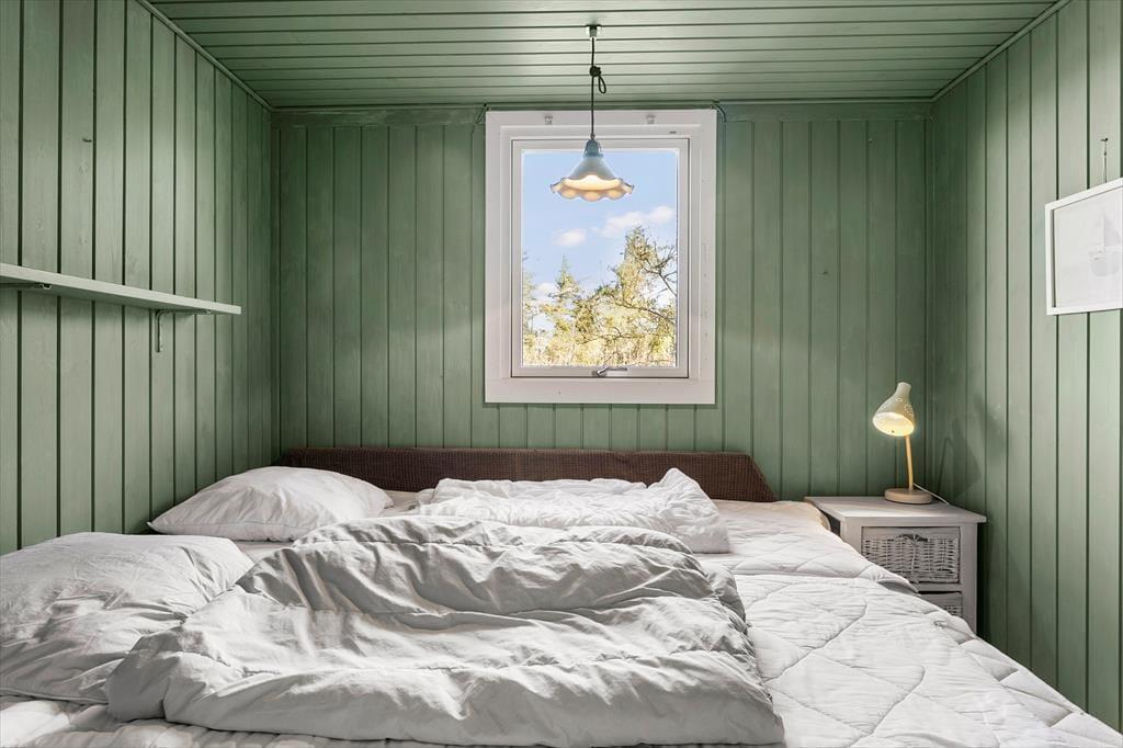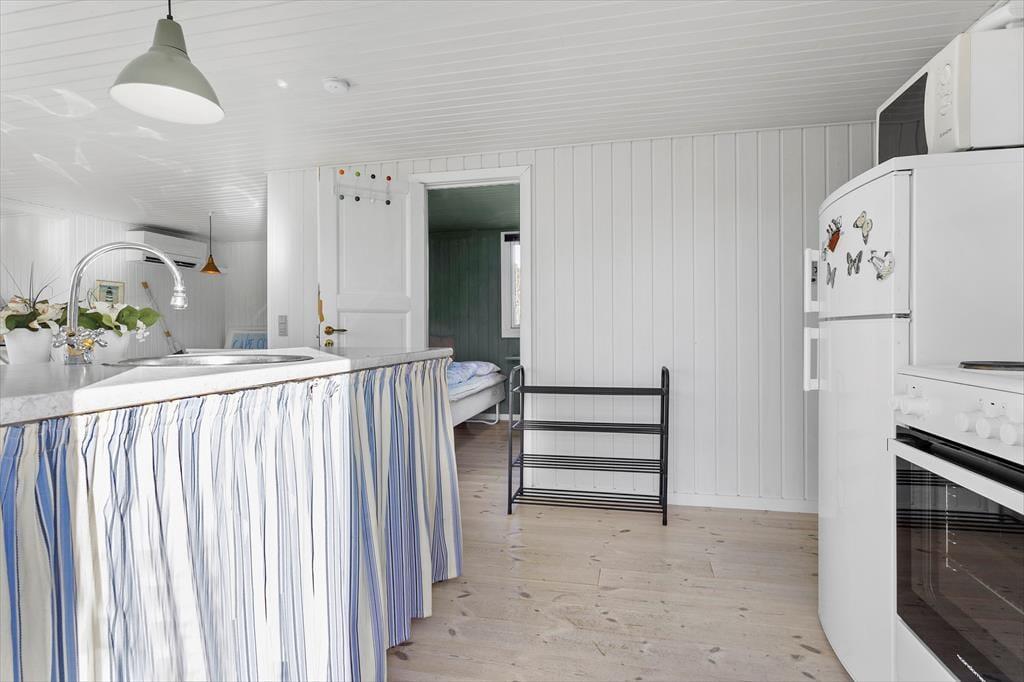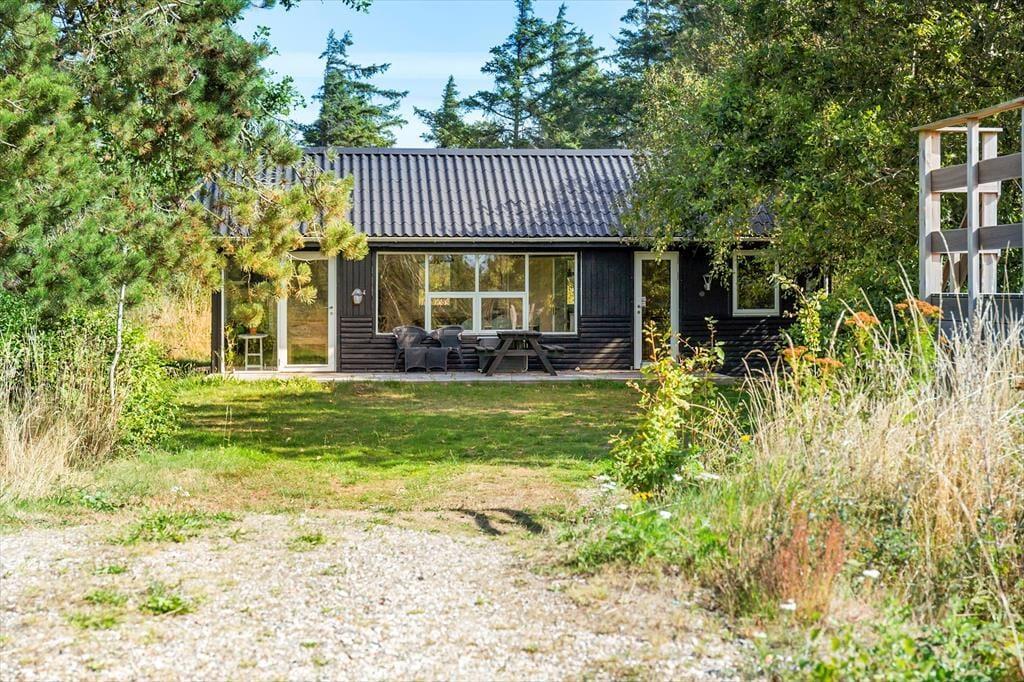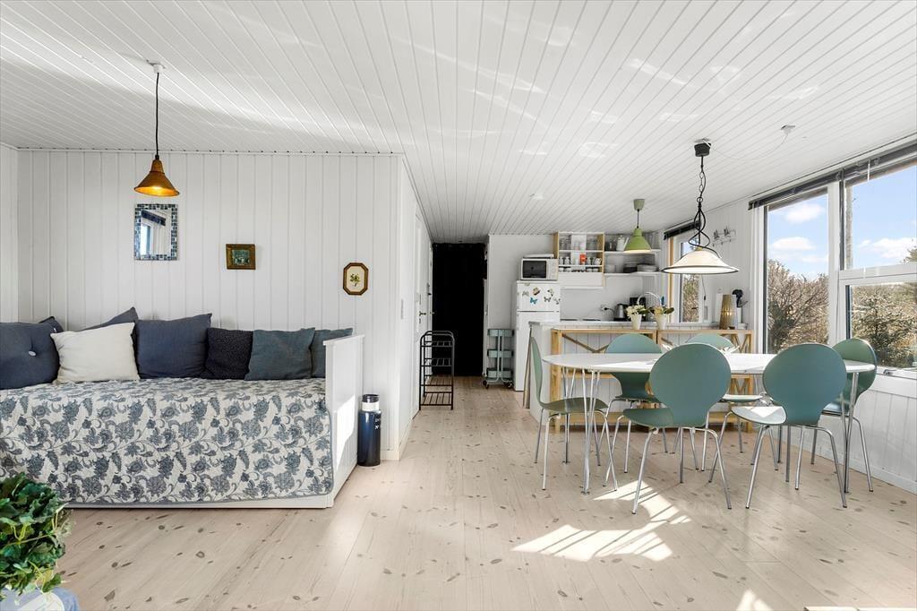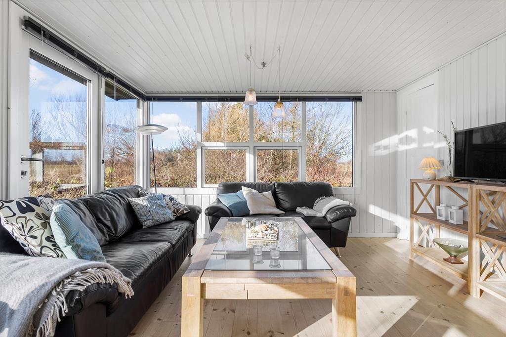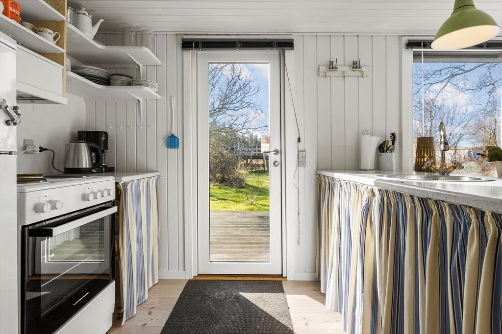 Atmosfæren er rar og indbydende inde døre i sommerhuset, der blev renoveret i 2022. I stuen sørger de mange vinduer for et godt lysindfald, og det sikrer jer også en fin udsigt til den grønne naturgrund, uanset om I slapper af i sofaafdelingen, spiller brætspil ved spisebordet eller står i det åbne køkken. I en niche i rummet er der etableret en ekstra hyggekrog, og en varmepumpe med køl gør det nemt at regulere temperaturen. Et badeværelse med bruser ligger i den ene ende af huset, og på de tre soveværelser er der i alt sengepladser til seks personer.