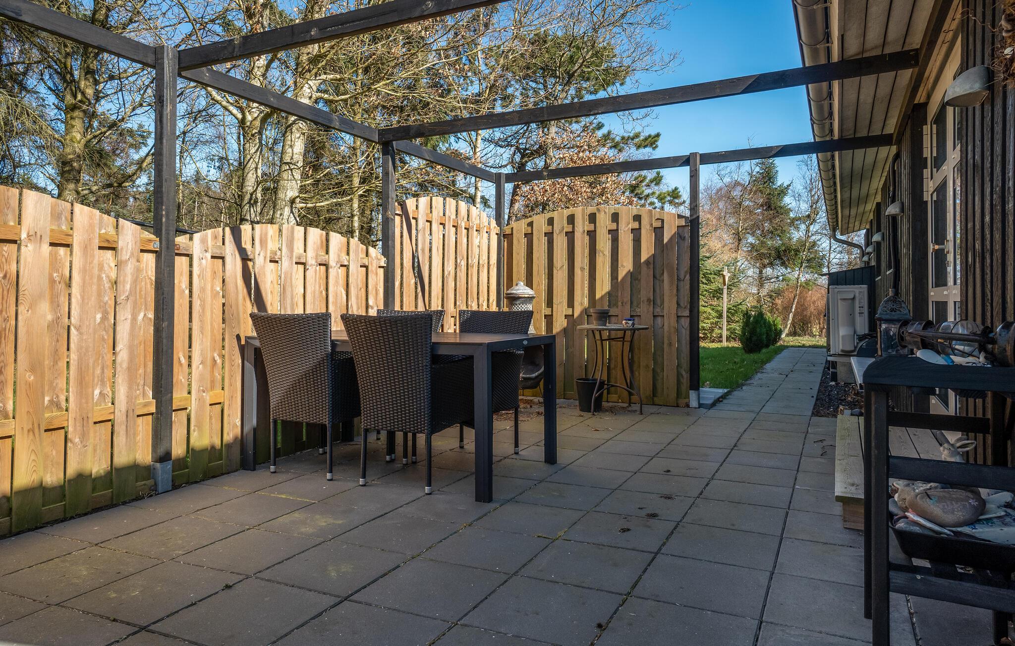 I kan også se frem til et skønt udeareal, som er dejligt privat, når I sidder ud om sommeren. Der er overdækning på terrassen, så her kan I fortsat sidde ude, når duggen falder om aftenen. På de lune sommerdage kan I nyde solen og en god bog, mens børnene boltrer sig på græsplænen.