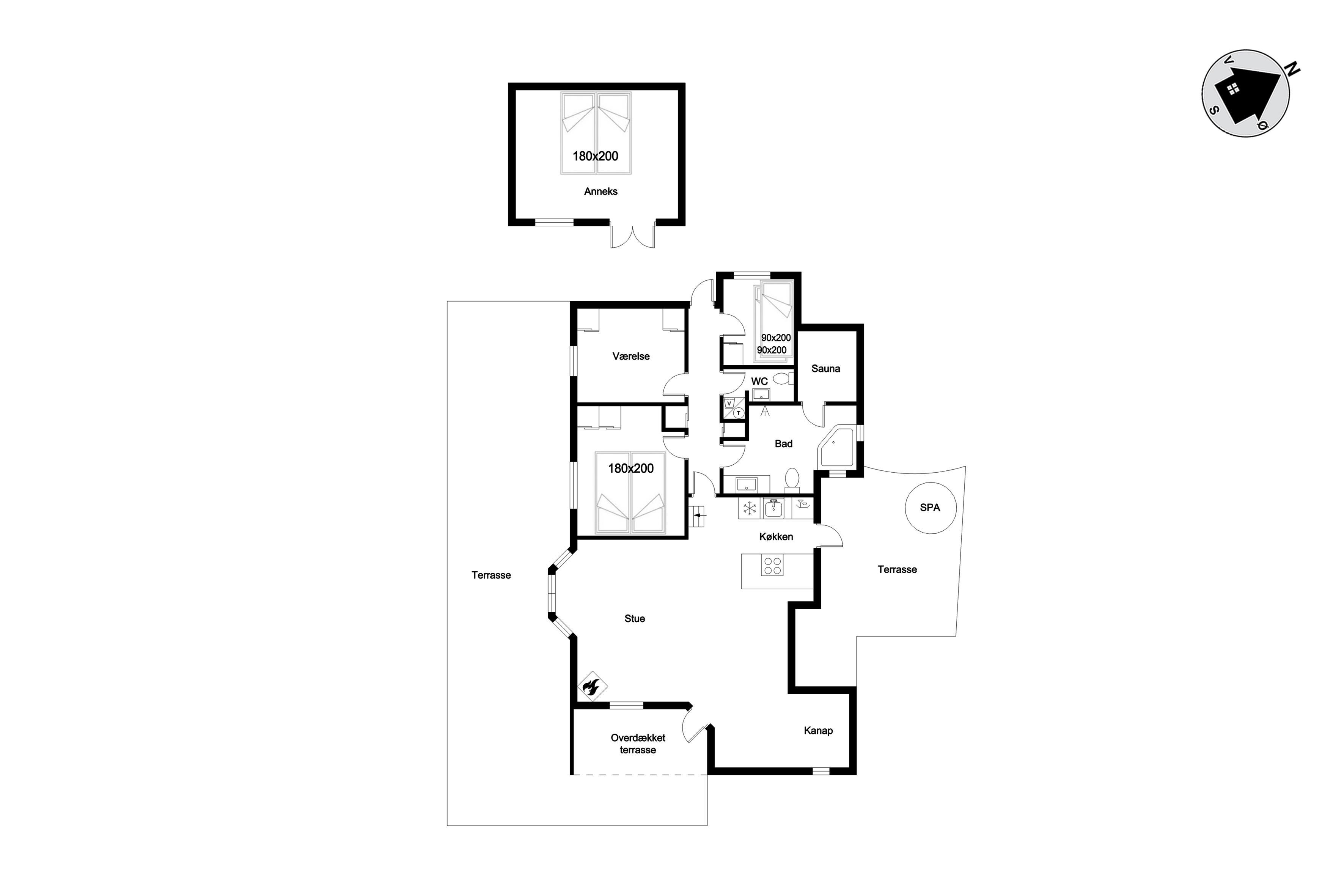 Sommerhuset har fire soveværelser, hvor sovepladserne fordeler sig på tre dobbeltsenge og to køjesenge. To af disse sengepladser findes i et hyggeligt anneks, perfekt til dem, der ønsker lidt ekstra privatliv. Derudover er der en barneseng til de mindste gæster.