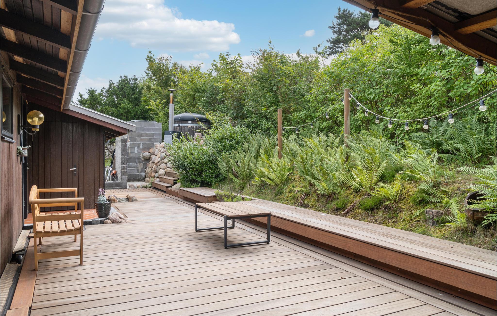 Der er lagt op til nogle skønne feriedage i dette tidløse sommerhus, som har havudsigt fra terrassen.