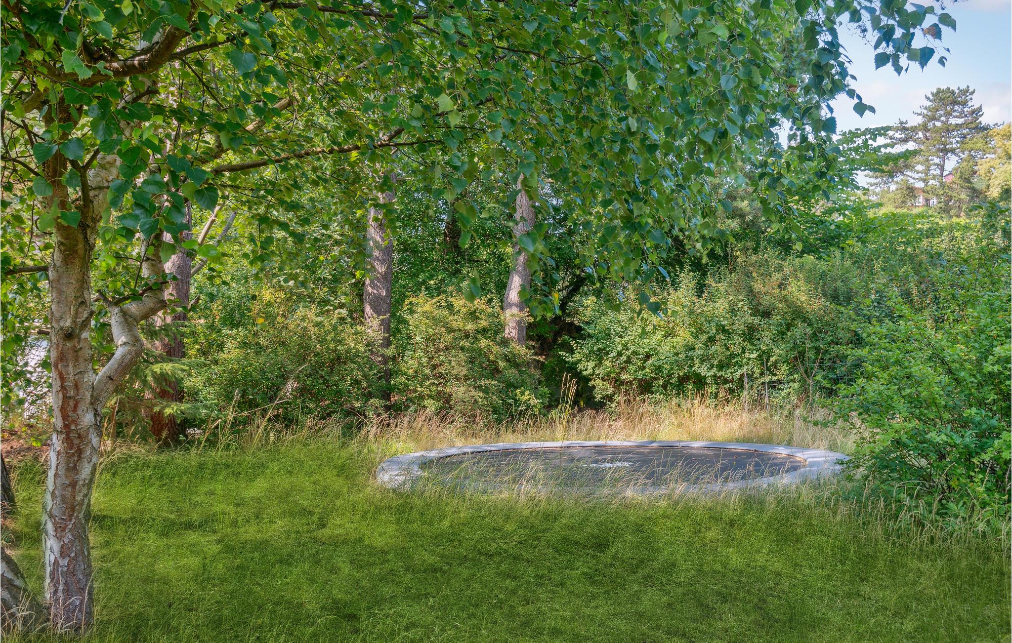 Grunden ligger omkranset af ældre træer og er en rolig lille oase, hvor I kan nyde solen efter en lang dag på farten. På de lune sommeraftener kan I gøre lækre måltider klar på grillen, mens børnene springer om kap på trampolinen. Her er hyggelige kroge med både sol og skygge og gode muligheder for både leg og afslapning.