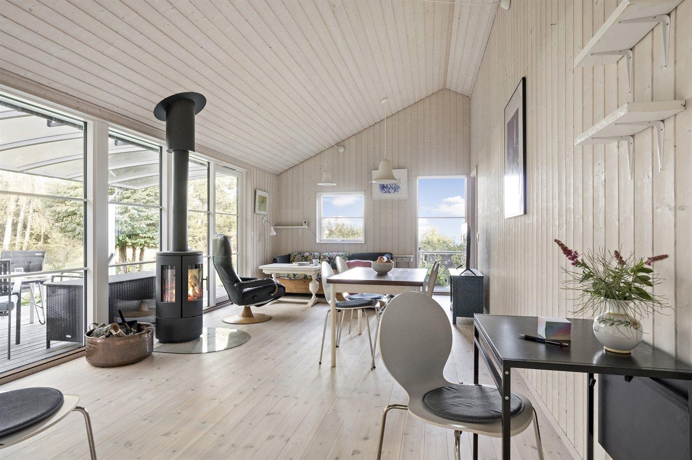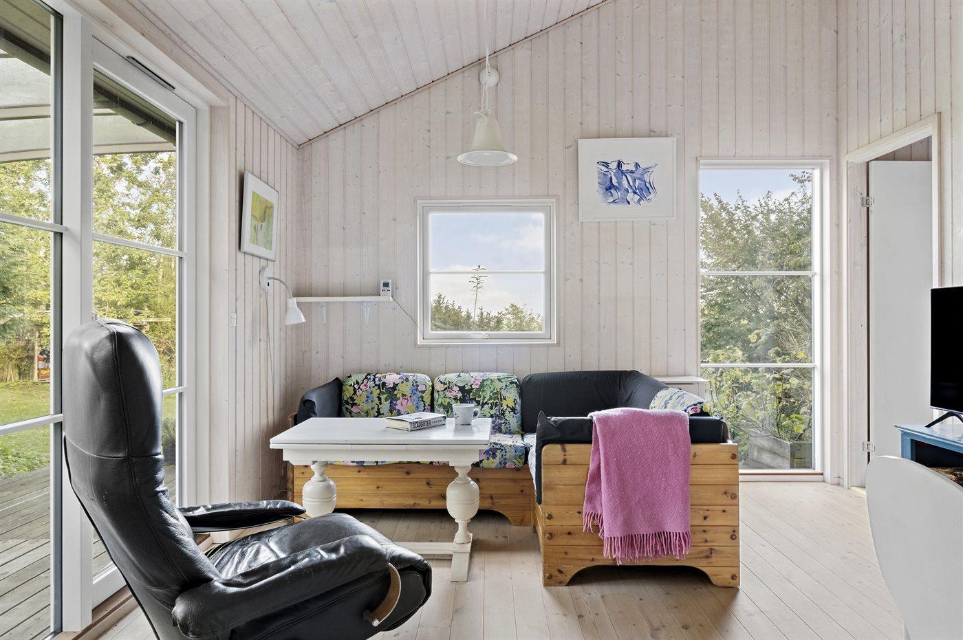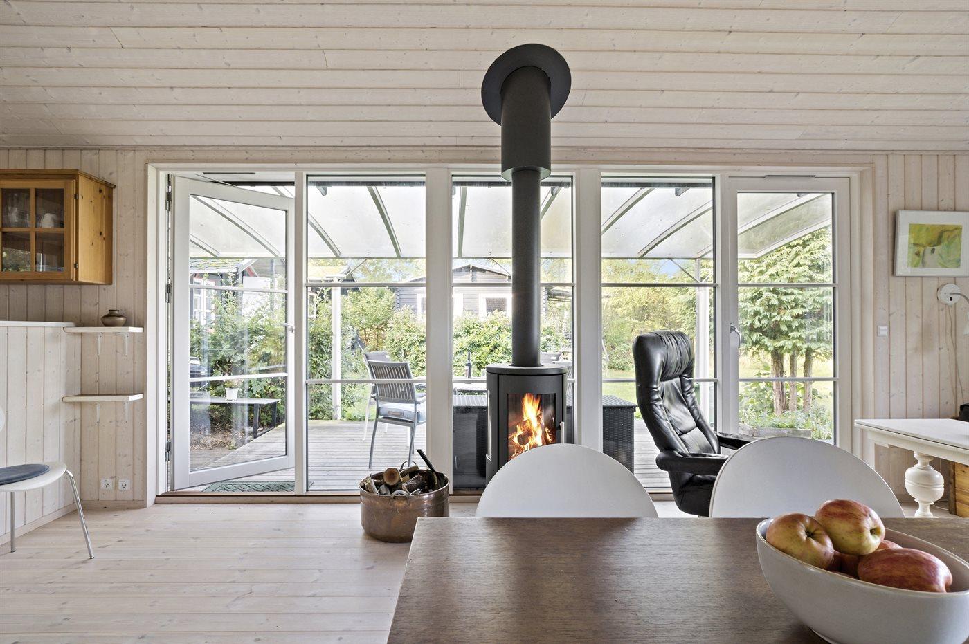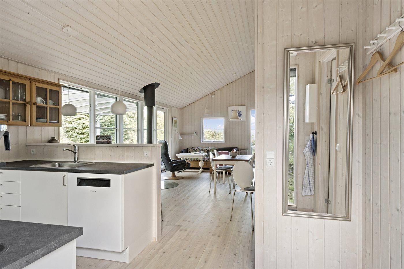 Huset er indrettet med et køkken-alrum, som ligger i åben forbindelse med stuen og med udgang til en flot overdækket terrasse. Indvendigt er alt holdt i lyse materialer med loft til kip i alle rum. I selveste huset findes der 2 soveværelser med hver 2 sovepladser og cirka 10 meter fra huset ligger der et anneks på 25 m2 med yderligere 2 sovepladser.