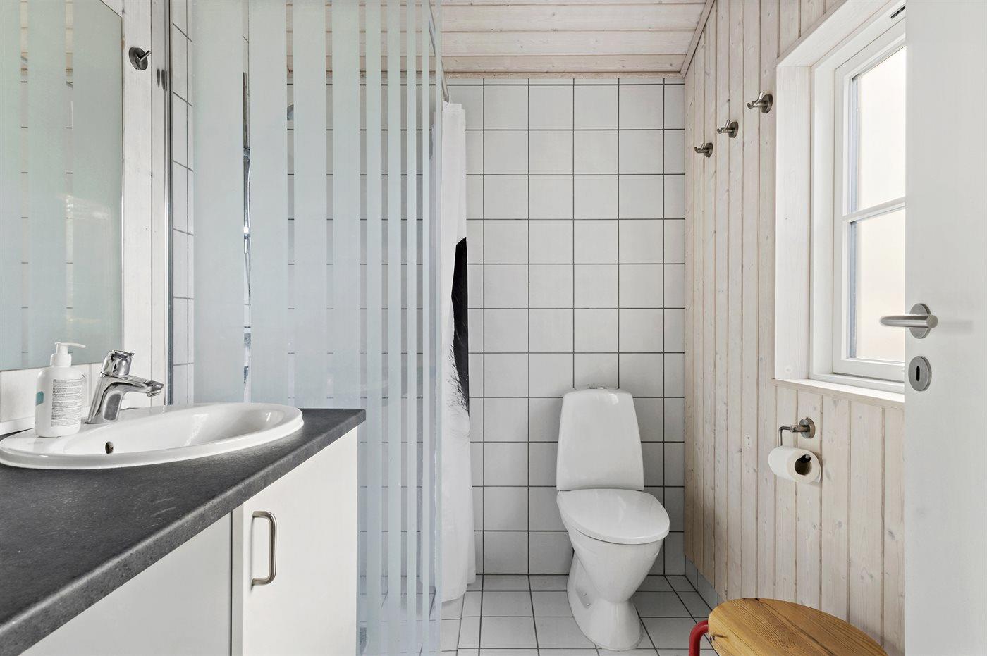 Badeværelse med bruseniche. Huset opvarmes med en energivenlig luft-til-luft varmepumpe og der findes desuden en brændeovn. Der er fibernet (bemær, at dækningen i annekset er mindre god og ikke rækker til streaming).