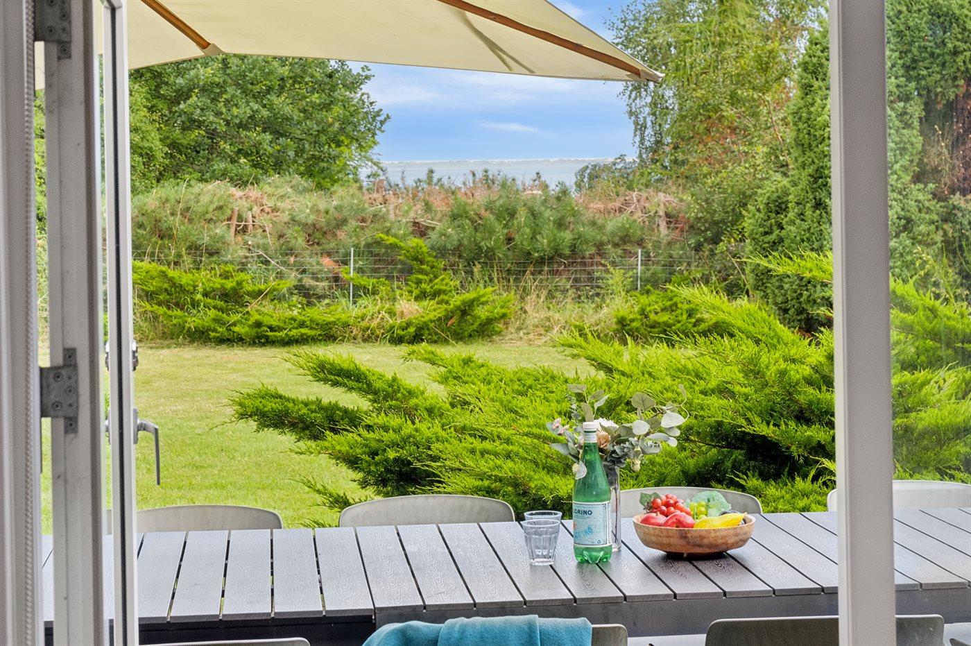 Fra huset er der udgang til 2 dejlige sydvendte terrasser og til den prægtige og ugenerte naturgrund med flere store træer. Her er rig mulighed for leg med børnene og der er gynge og sandkasse. Ved stranden er også et fællesareal med mulighed for boldspil. Foran huset mod nord er også en dejlig læfyldt terrasse. Der er udebruser.