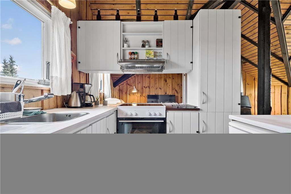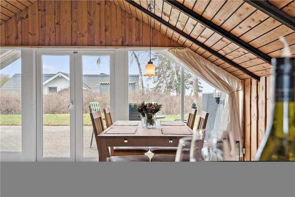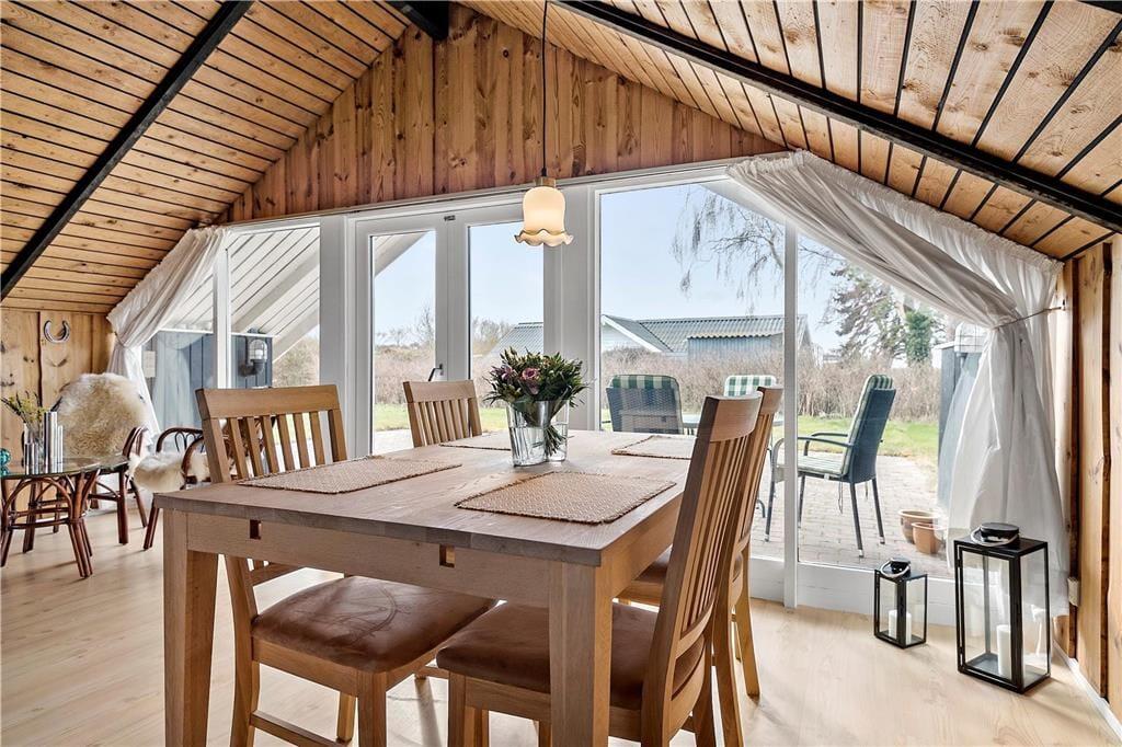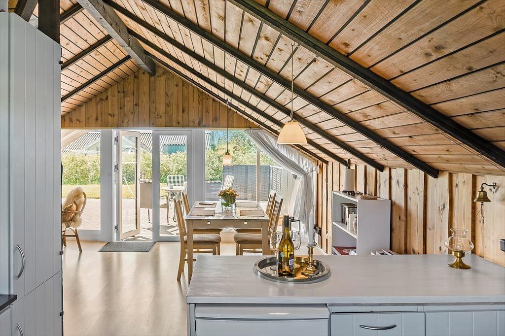 Spiseplads nær det åbne køkken som indeholder elkomfur med bageovn, mikroovn, køleskab samt alt det gængse i køkkengrej.