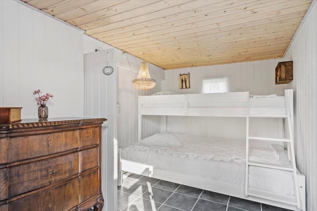 Begge soveværelser, er udstyret med 1 køjeseng og under den, 1 dobbeltseng med en bredde på 140cm, så der er plads til 3 personer i hvert soveværelse. Pladsen på badeværelset er godt udnyttet. Badeværelset har toilet, bruser og håndvask. Huset har varmepumpe.