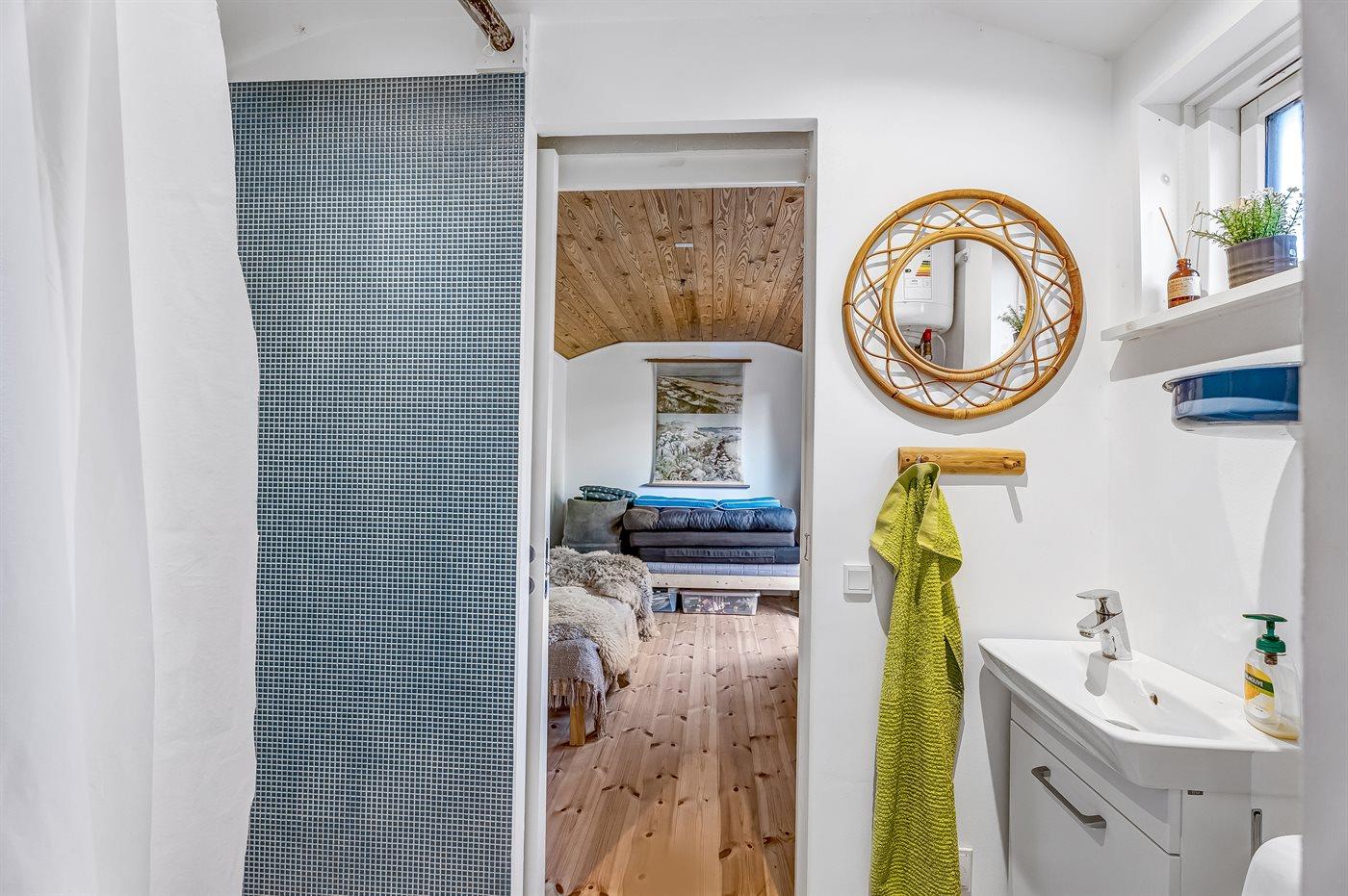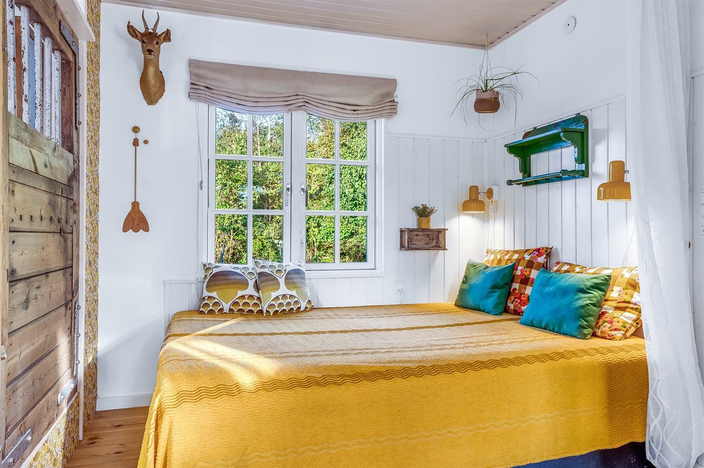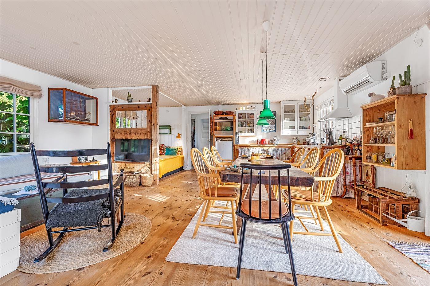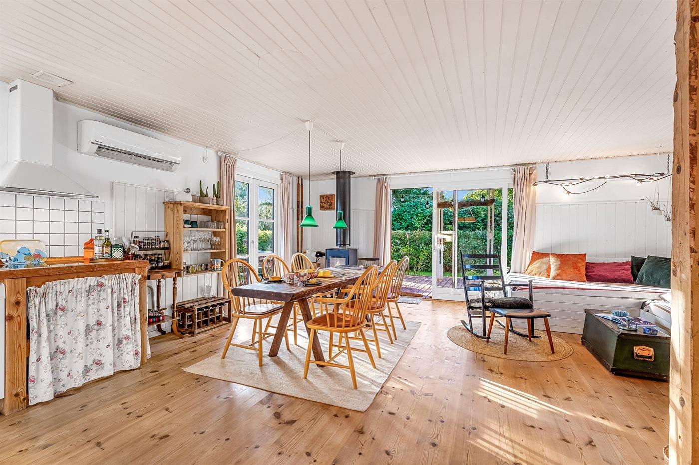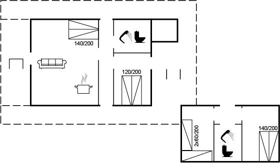 Sommerhuset er hyggeligt indrettet med åbent køkken kombineret med stuen, hvor der er hyggeligt hævet dobbeltseng. Der er et soveværelse i selve sommerhuset med en lille dobbeltseng (120x200), derudover hems med to madrasser. Fra terrassen er der adgang til det store anneks med yderligere to soveværelser og et badeværelse. Perfekt til gæster eller hvis familien vil dele sig lidt op.