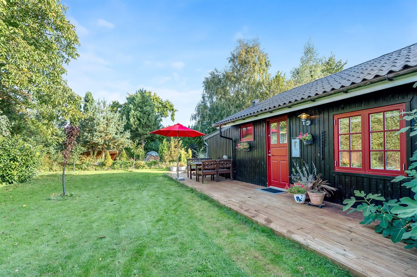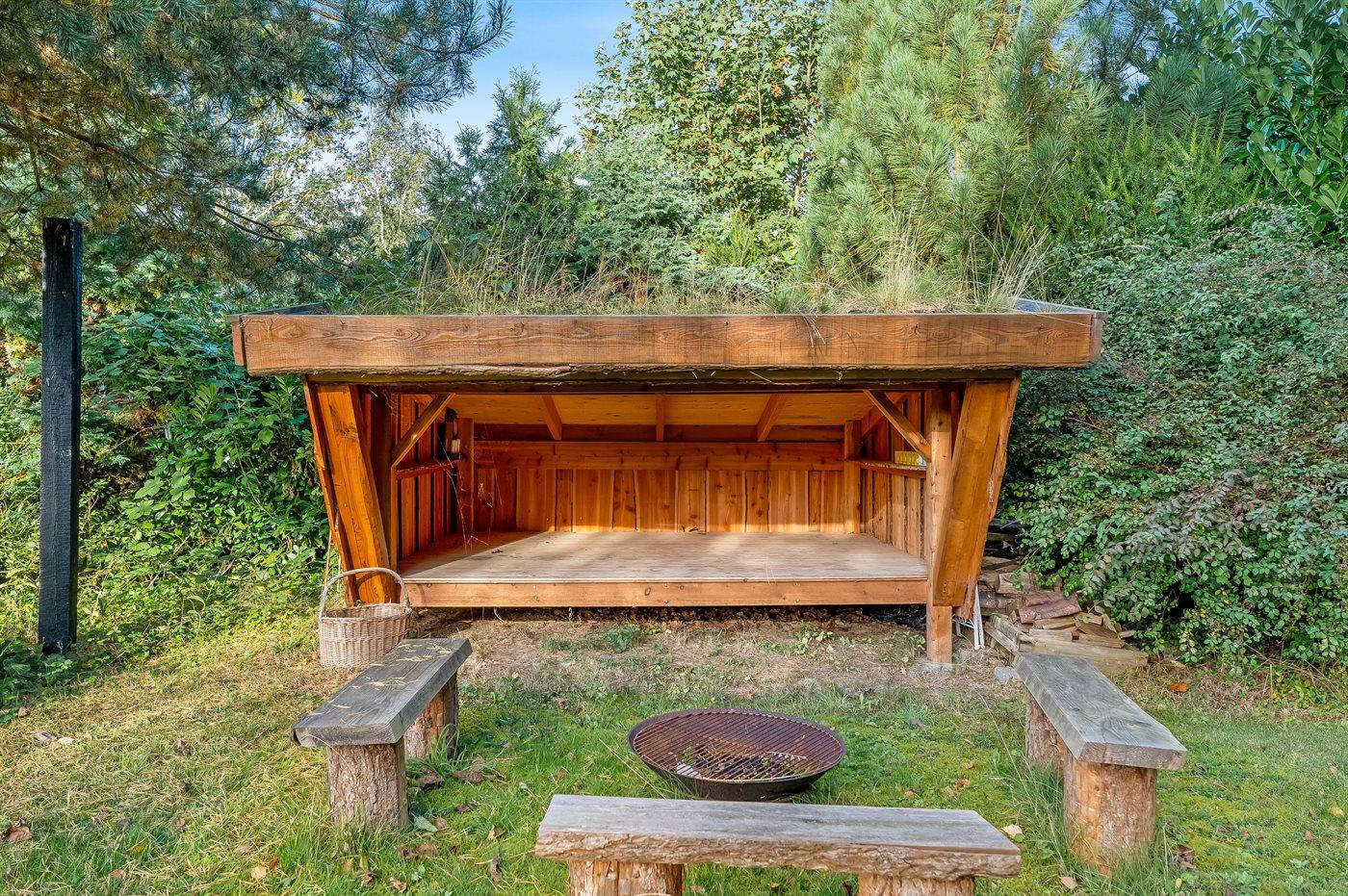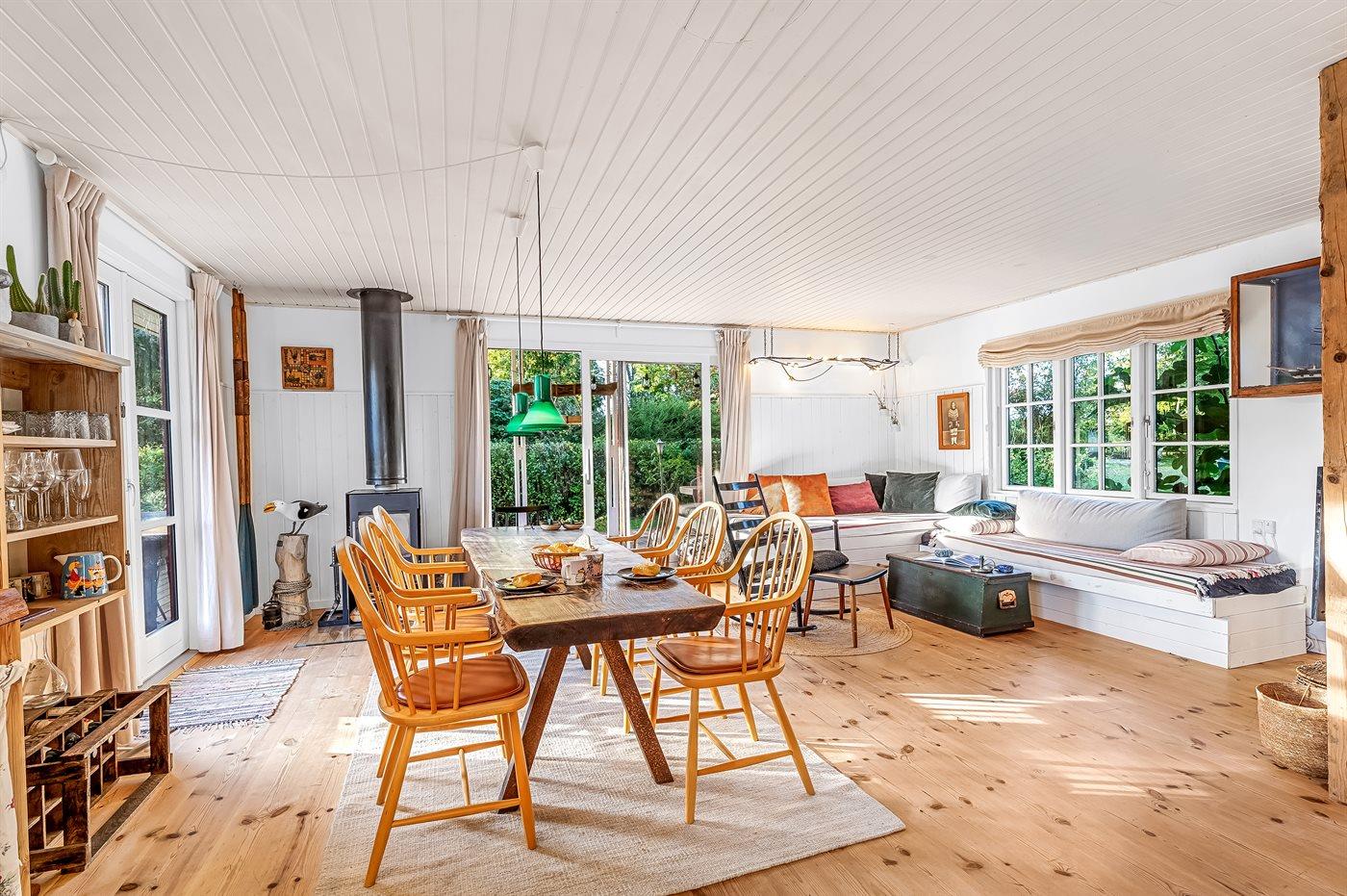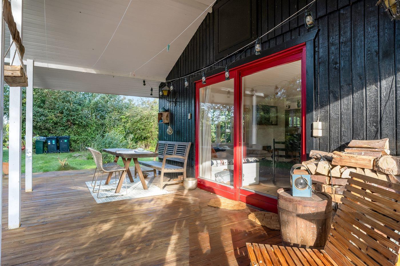 Hyggeligt sommerhus nær Grønsund med overdækket terrasse, anneks, bålplads og shelter på stor naturgrund.