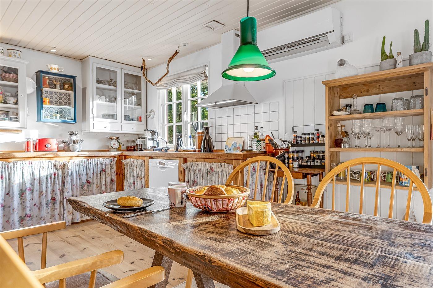 Køkkenet er udstyret med 1 køleskab. Der er 4 keramiske kogeplader, varmluftovn samt opvaskemaskine.