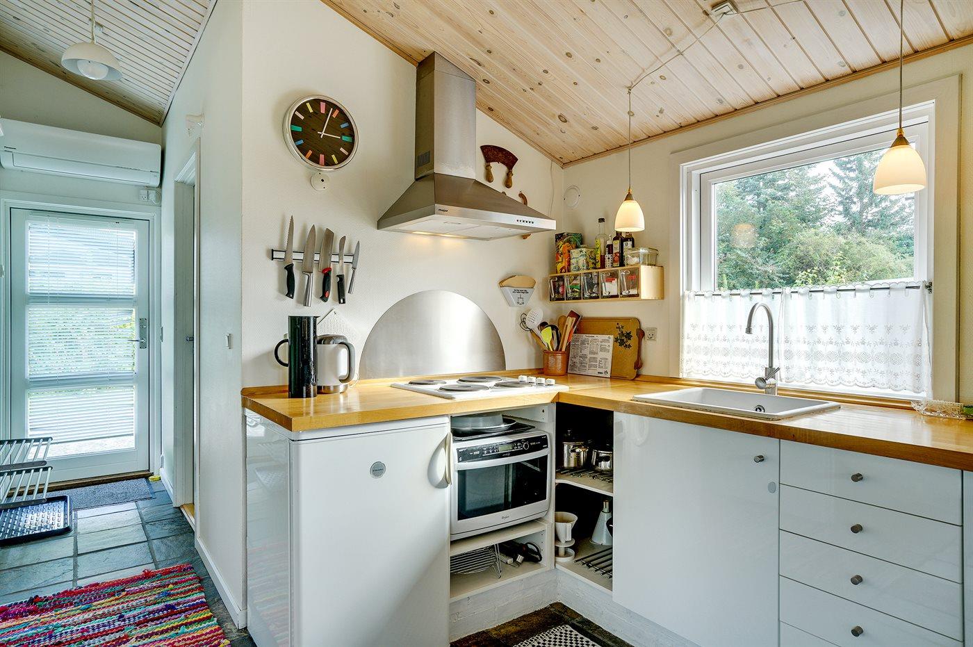 Køkkenet er udstyret med 1 køleskab. Der er 4 elkogeplader, varmluftovn, mikrobølgeovn.