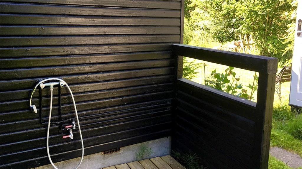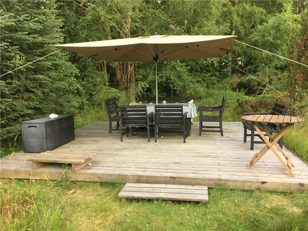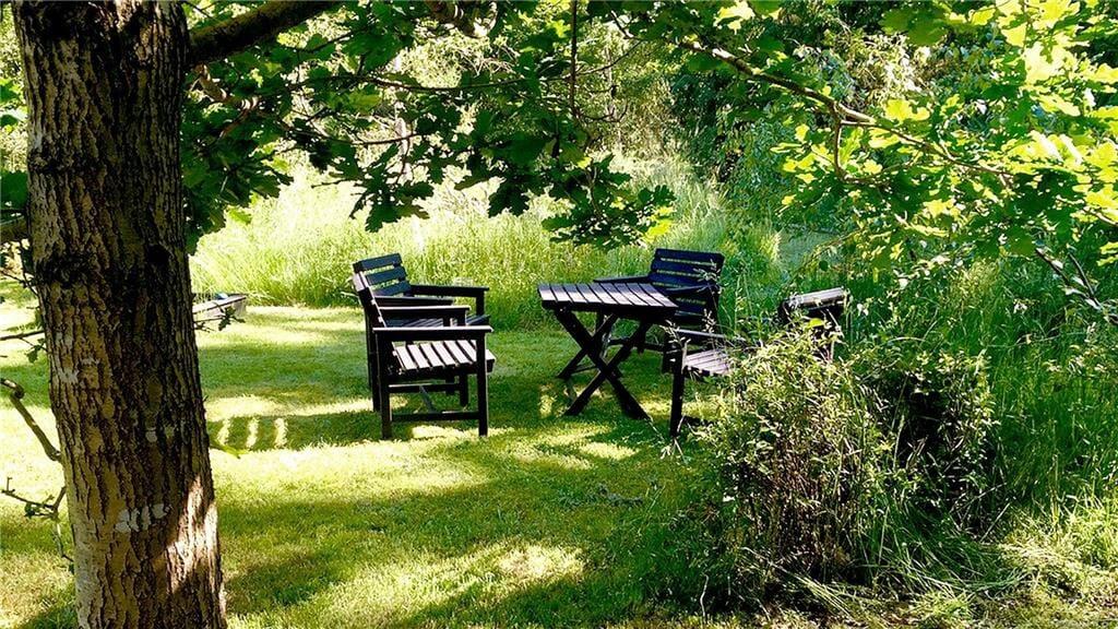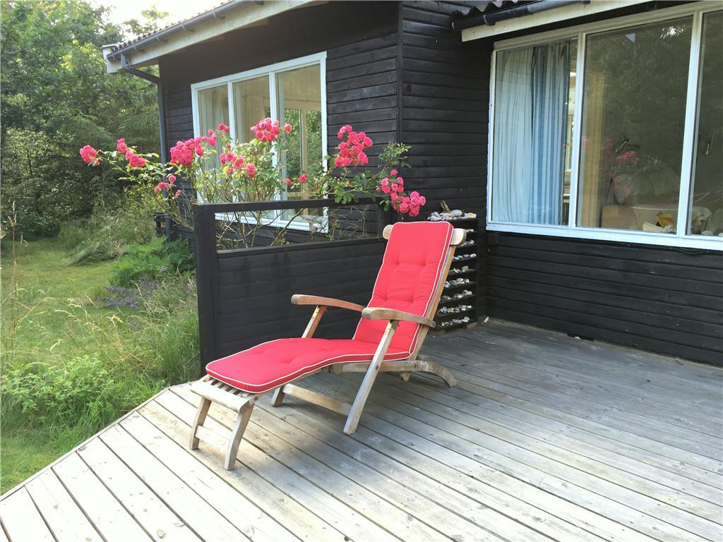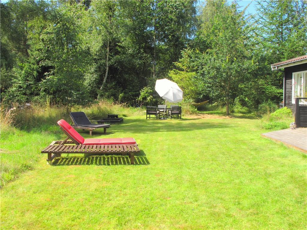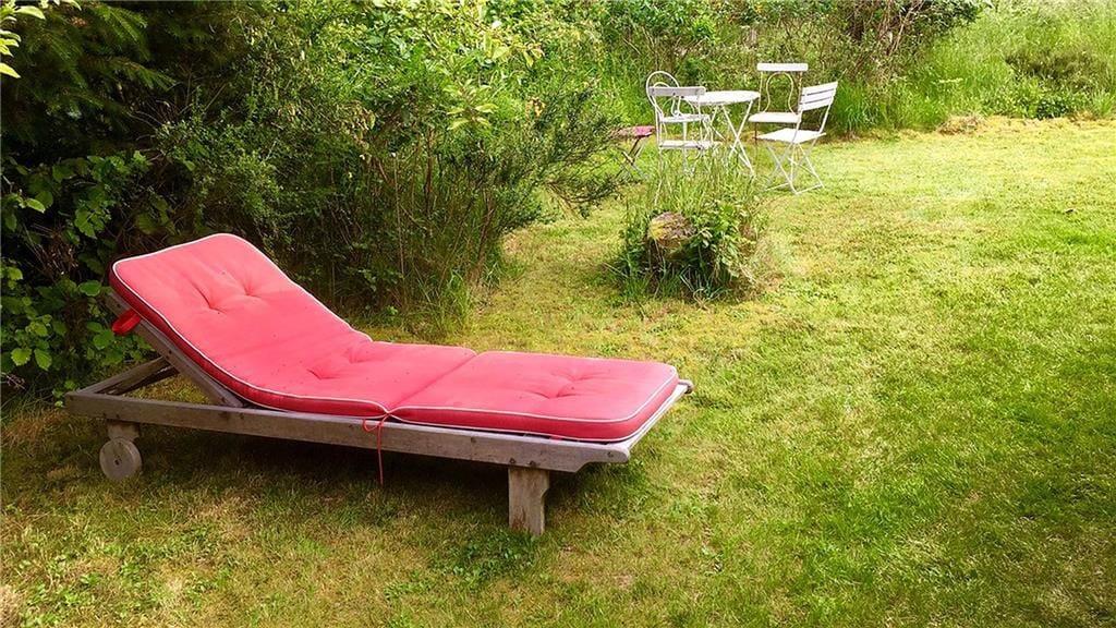 Huset har en dejlig og læfyldt terrasse, og i haven er også anlagt en træterrasse. Haven byder på flere andre hyggelige steder og kroge, hvor du kan sidde og nyde en kop kaffe og læse en god bog. Den store naturgrund matcher fint ind i det fredede naturområde ved stranden på 30 hektar (0,3 kvadratkilometer), som huset ligger tæt på og som I passerer, når I skal til vandet. På den stenede forstrand finder du blandt andet strandkål, strand-bede og strandsennep. I det fredede område findes også blodrød storkenæb, asparges, skt. Hansurt, nikkende kobjælde, gul evighedsblomst og smalbladet timian.