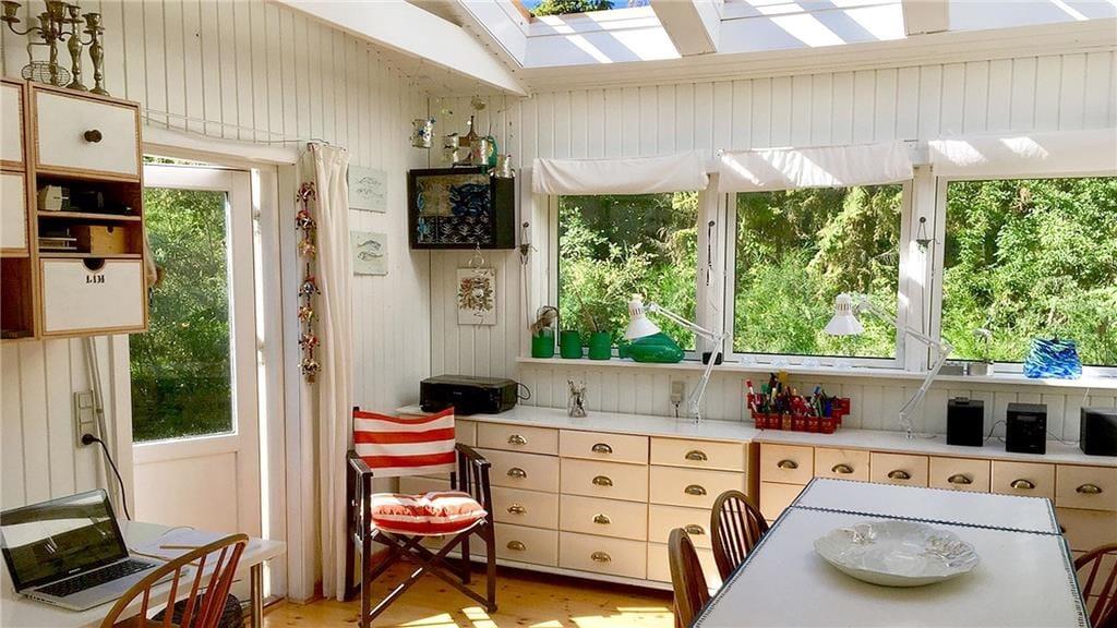 Tæt på kysten ved Sejerø Bugt ligger denne lille originale perle, der emmer af ægte sommerhusstemning. Den lyse stue med lysindfald fra både ovenlysvinduerne og vinduespartierne mod haven, inviterer til kreativt arbejde. Så hvis du har en poetisk åre eller kan lide at tegne eller male, så kan du her finde den indre kunstner frem. I den ene ende af stuen kan du tænde brændeovnen og på en kølig og måske blæsende dag, sidde i sofaen og læse en bog, eller tage et slag yatzy. I det hyggelige køkken er der kik ud til haven. Her får du ikke luksus, men et sommerhus med ægte sommerhusstemning.