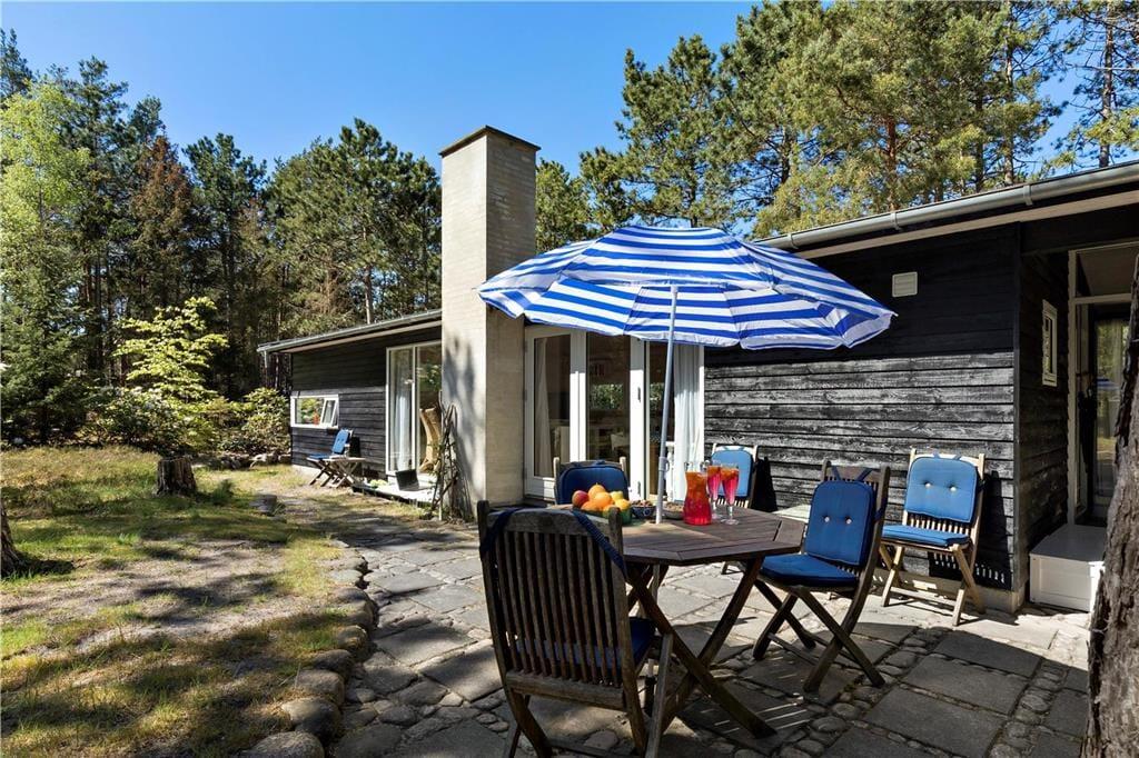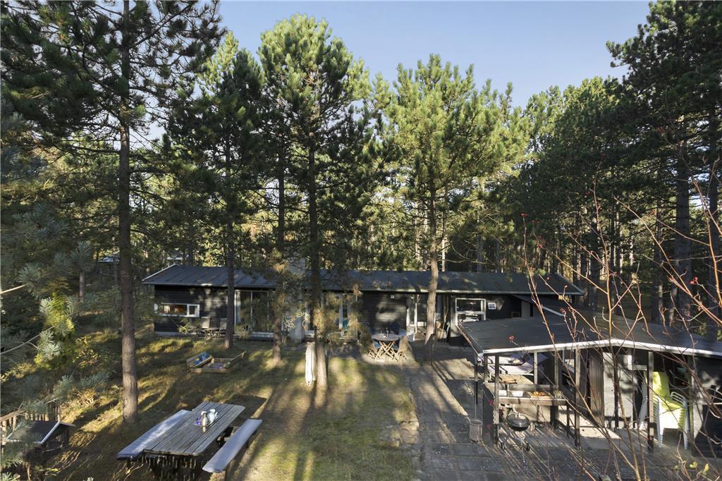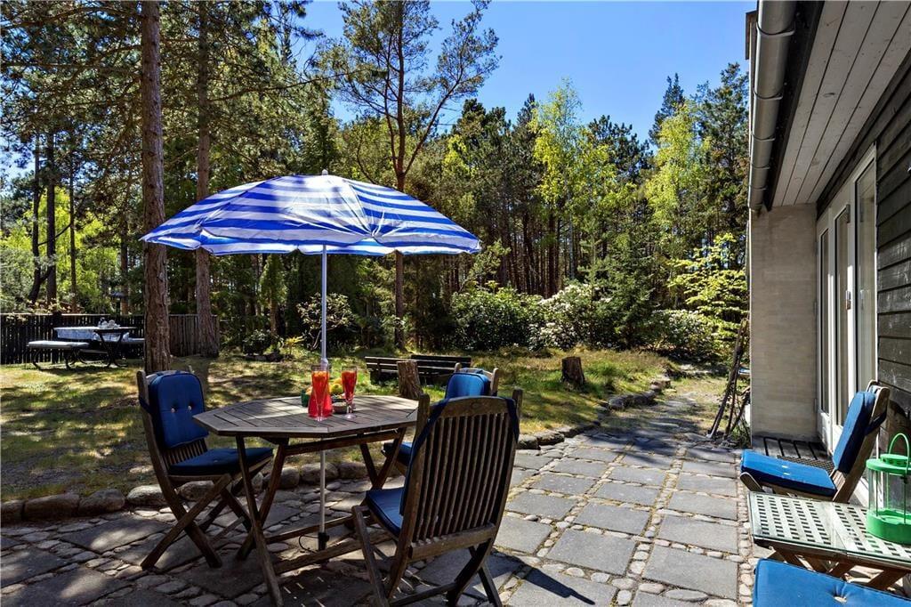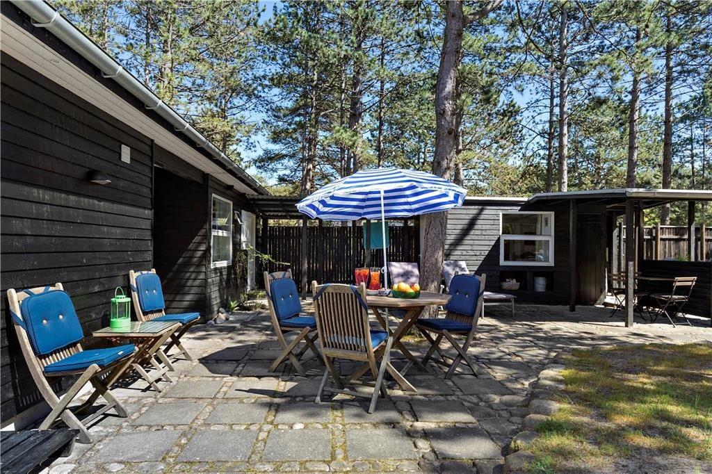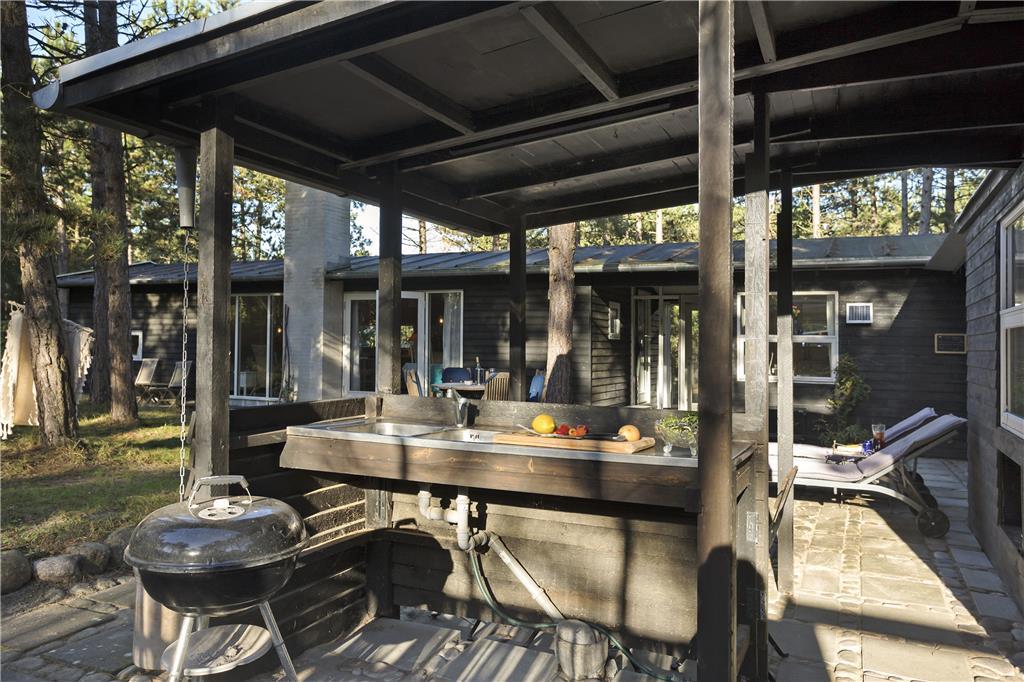 Udenfor er der parasoller, solsenge, sandkasse, grill, udekøkken med koldt vand og udebad med solopvarmet vand, og på den store naturgrund er der adskillelige hyggekroge til sol, læ eller skygge. I kan også sidde under halvtag, hvis det drypper med dug eller en byge. En del af inder-grunden er i øvrigt indhegnet til mindre hunde.